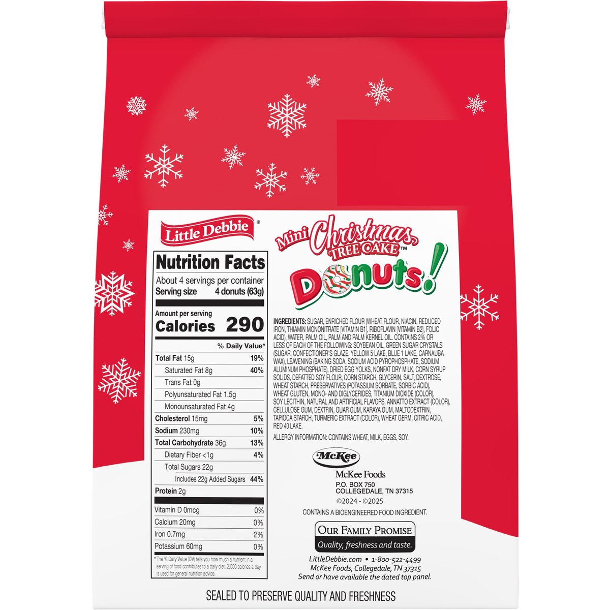 Contains a bioengineered food ingredient. McKee: A family bakery. Our Family Promise: Quality, freshness and taste. LittleDebbie.com. LittleDebbie.com. 1-800-522-4499. McKee Foods, Collegedale, TN 37315. Send or have available the dated top panel. Sealed to preserve quality and freshness.