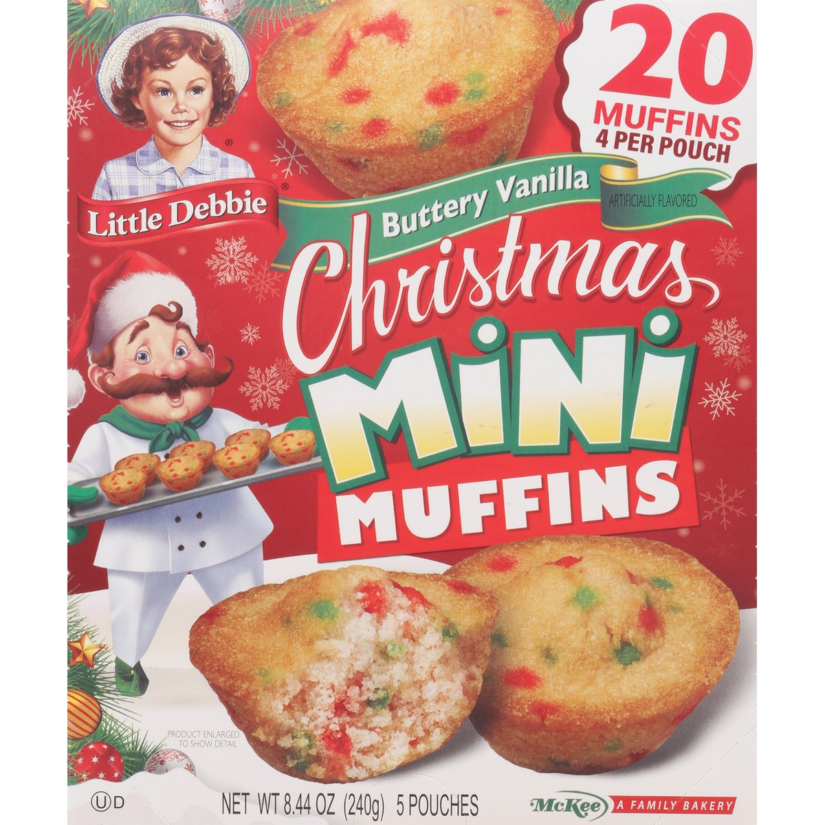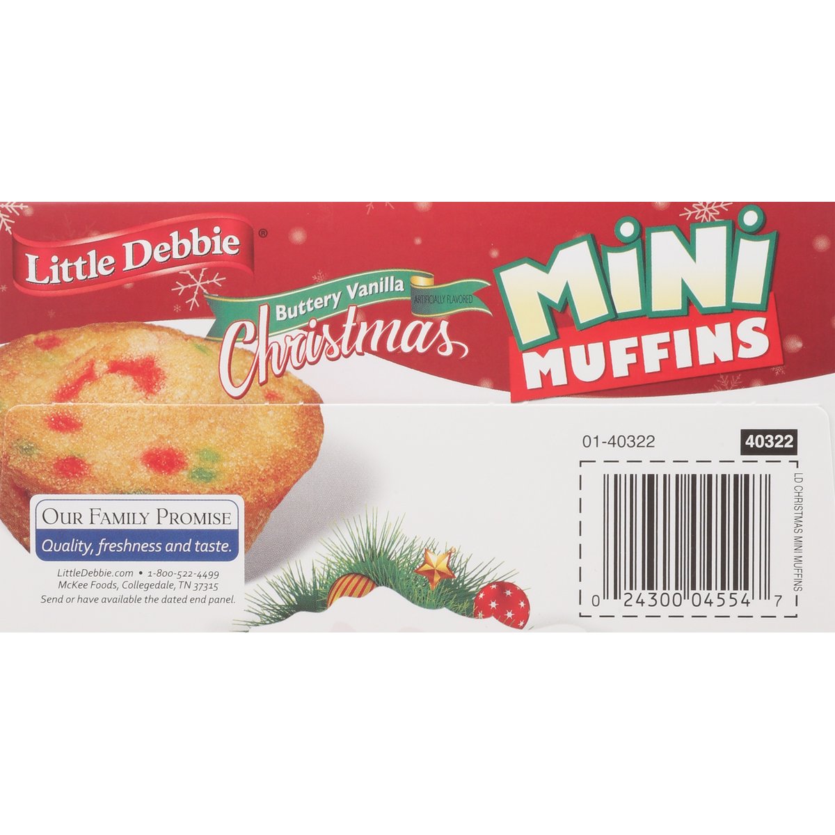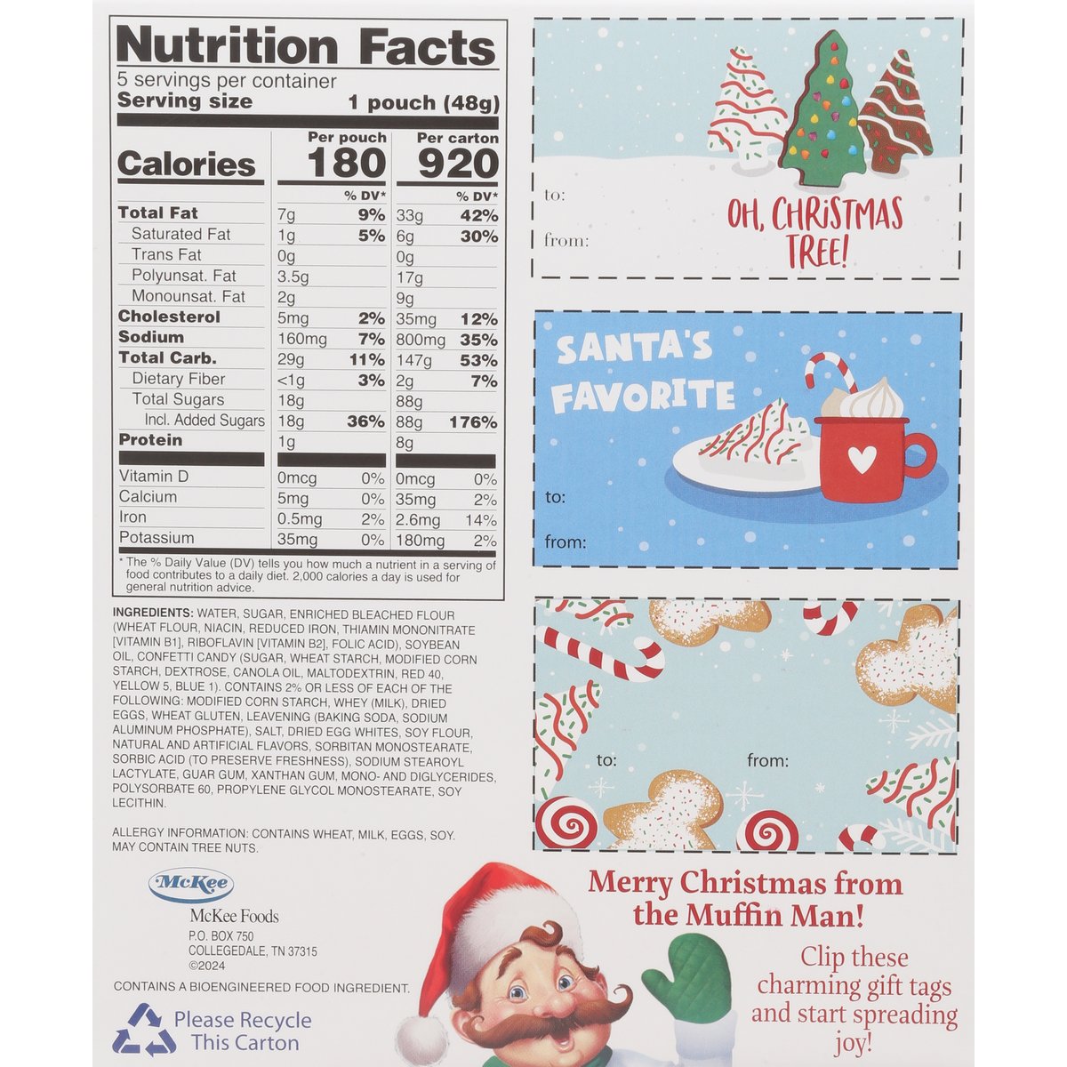 Artificially flavored. Contains a bioengineered food ingredient. McKee: A family bakery. Our Family Promise: Quality, freshness and taste. Oh, Christmas tree! Merry Christmas from the Muffin Man! Clip these charming gift tags and start spreading joy! Our Family Promise: Quality, freshness and taste. Guaranteed fresh. littledebbie.com. LittleDebbie.com. 1-800-522-4499. McKee Foods, Collegedale, TN 37315. Send or have available the dated end panel. Please recycle this carton. Please recycle this carton.