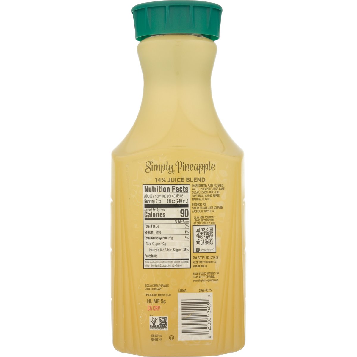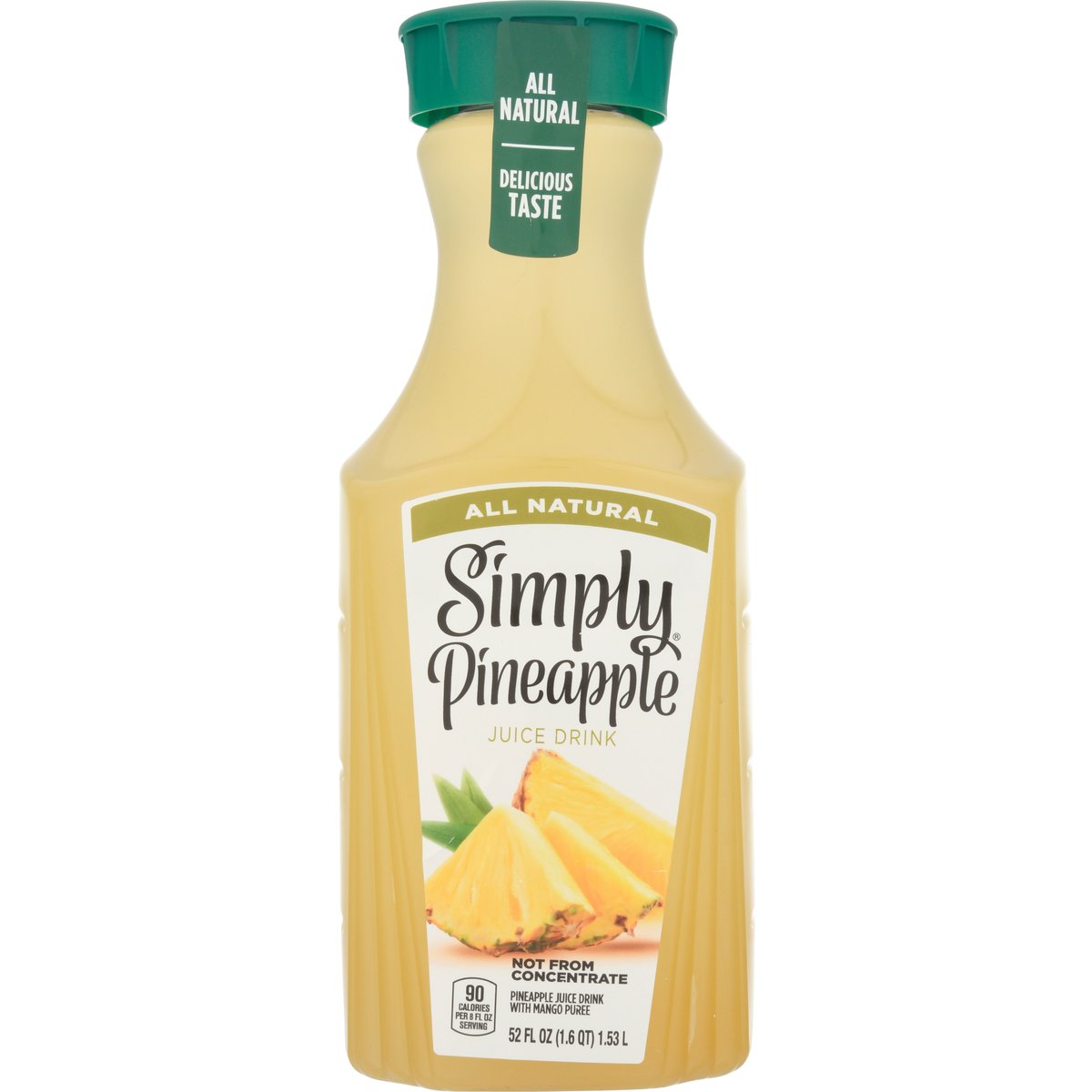 Pineapple juice drink with mango puree. 90 calories per 8 fl oz serving. Non-GMO Project verified. nongmoproject.org. All natural. Delicious taste. Not from concentrate. Pasteurized. www.simplyorangejuice.com. SmartLabel: Scan for more food information or call 1-800-871-2653. Please recycle.