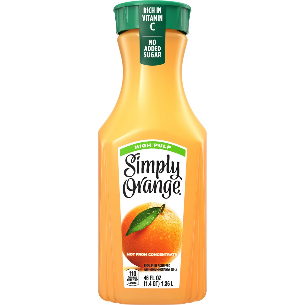 110 calories per 8 fl oz serving. Rich in vitamin C. No added sugar*. * Not a reduced calorie food. See nutrition facts for sugar & calorie content. Non-GMO Project verified. nongmoproject.org. High pulp. Not from concentrate. 100% pure squeezed pasturized orange juice. Pasteurized. Contains orange juice from countries identified on bottle neck. www.drinksimplybeverages.com. SmartLabel: Scan for more food information or call 1-800-871-2653. Please recycle.