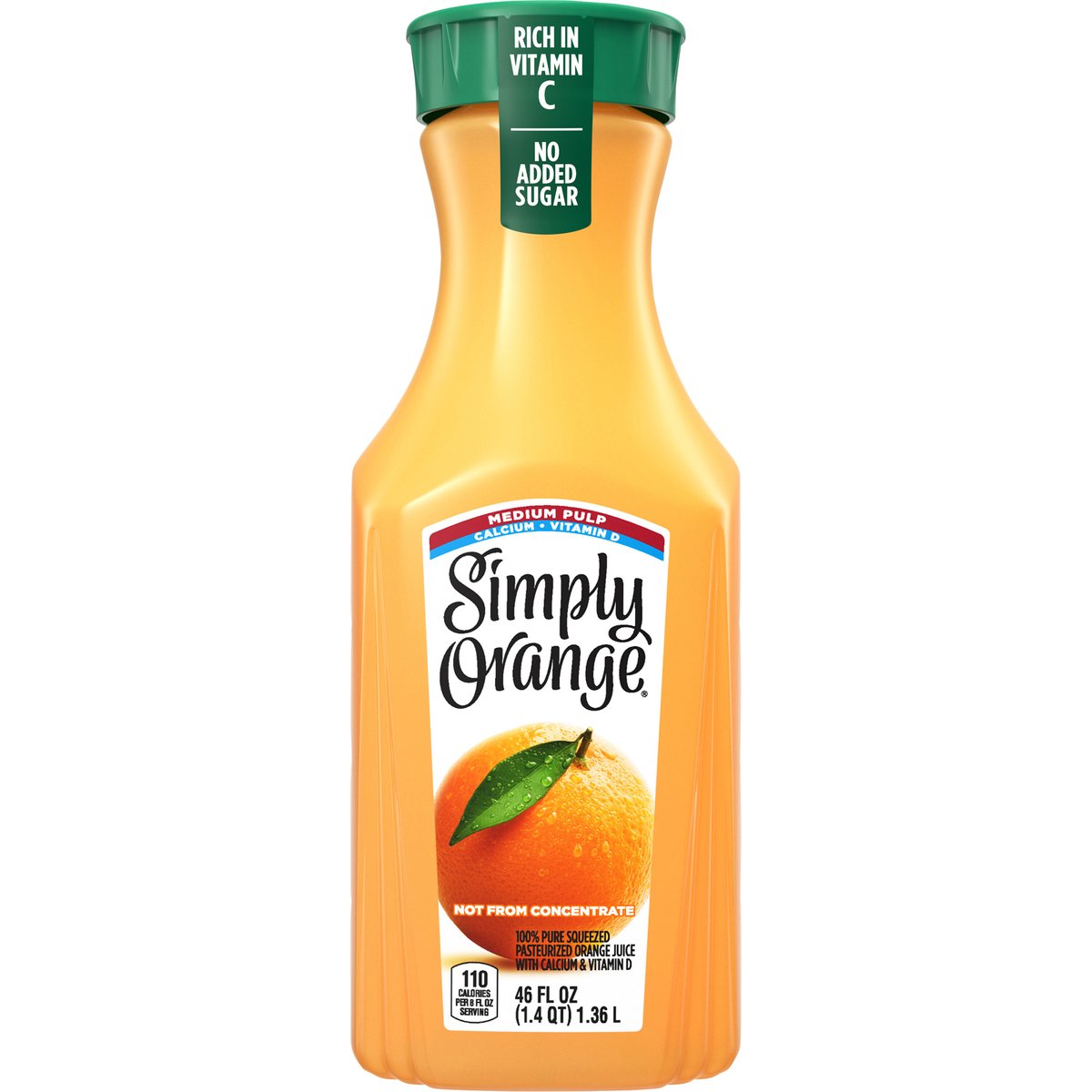 100% pure squeezed pasteurized orange juice with calcium & vitamin D. 110 calories per 8 fl oz serving. Rich in Vitamin C. No added sugar***. Calcium. Vitamin D. Good source of vitamin C, vitamin D & calcium. ** Not a reduced calorie food. See nutrition facts for sugar & calorie content. Non-GMO Project verified. nongmoproject.org. Not from concentrate. Pasteurized. Contains orange juice from countries identified on bottle neck. www.drinksimplybeverages.com. SmartLabel: Scan for more food information or call 1-800-871-2653. Please recycle.