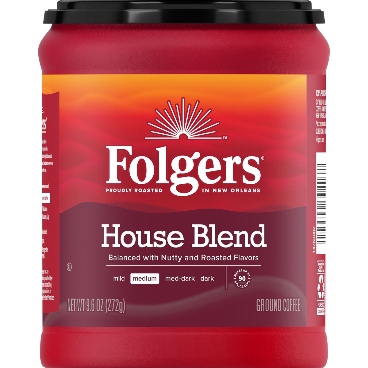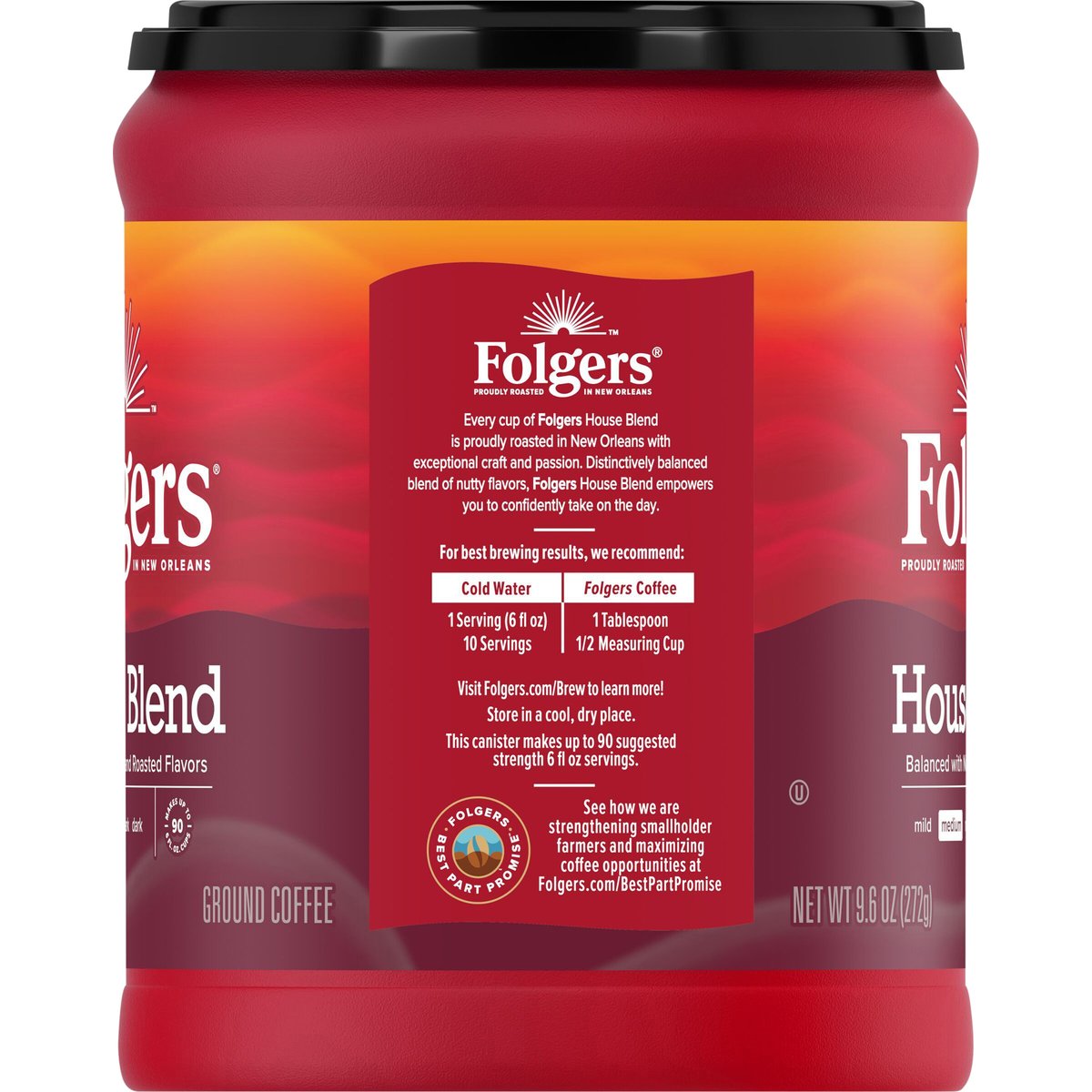 Balanced with nutty and roasted flavors. Mild. Medium. Med-dark. Dark. Makes up to 90 - 6 fl oz cups. Every cup of Folgers House Blend is proudly roasted in New Orleans with exceptional craft and passion. Distinctively balanced blend of nutty flavors, Folgers House Blend empowers you to confidently take on the day. This canister makes up to 90 suggested strength 6 fl oz servings. Folgers best part promise. folgers.com. how2recycle.info. Visit Folgers.com/Brew to learn more! Questions? 1-800-937-9745. Folgers Best Part Promise: See how we are strengthening smallholder farmers and maximizing coffee opportunities at Folgers.com/BestPartPromise. Proudly roasted in New Orleans.