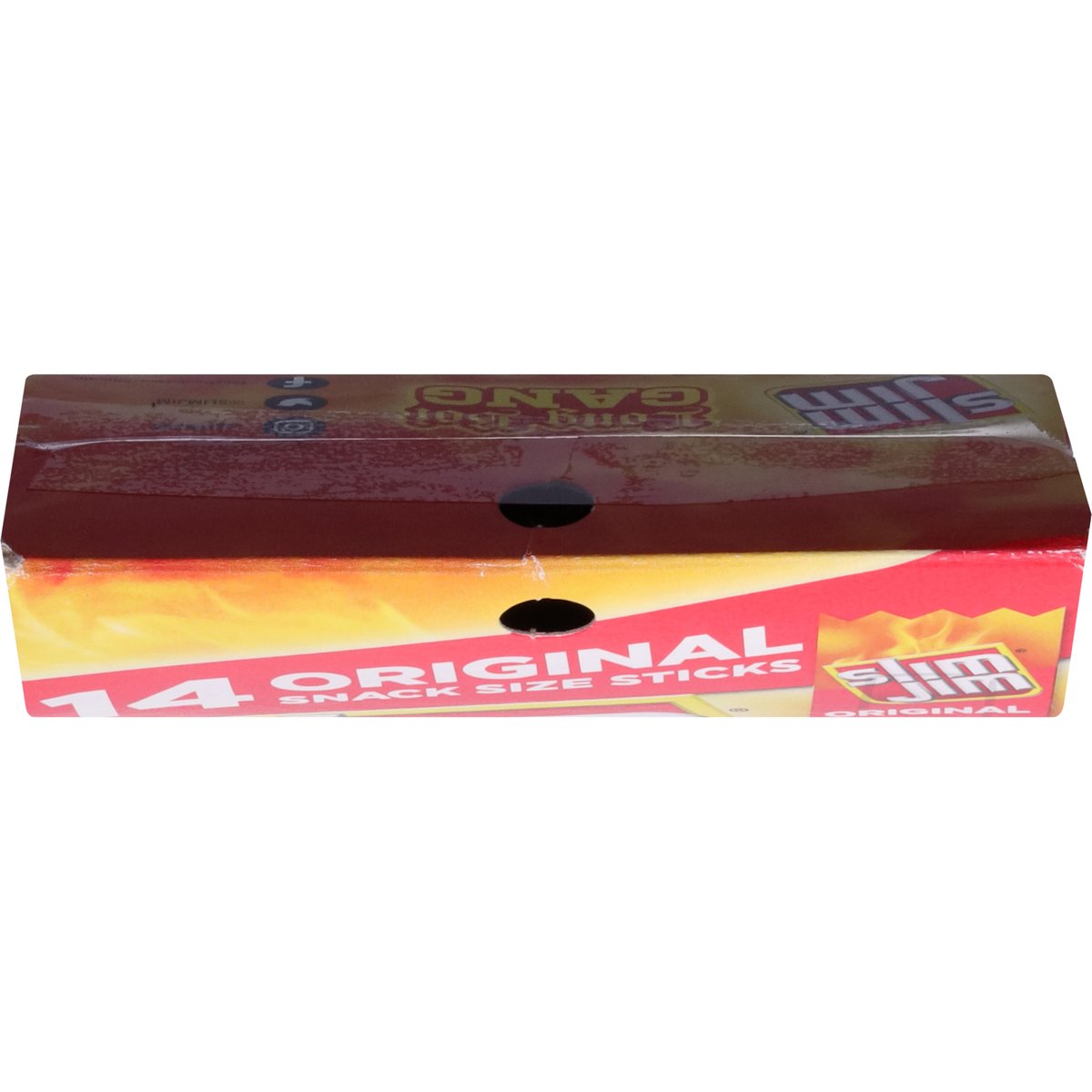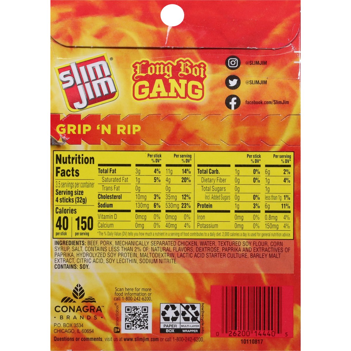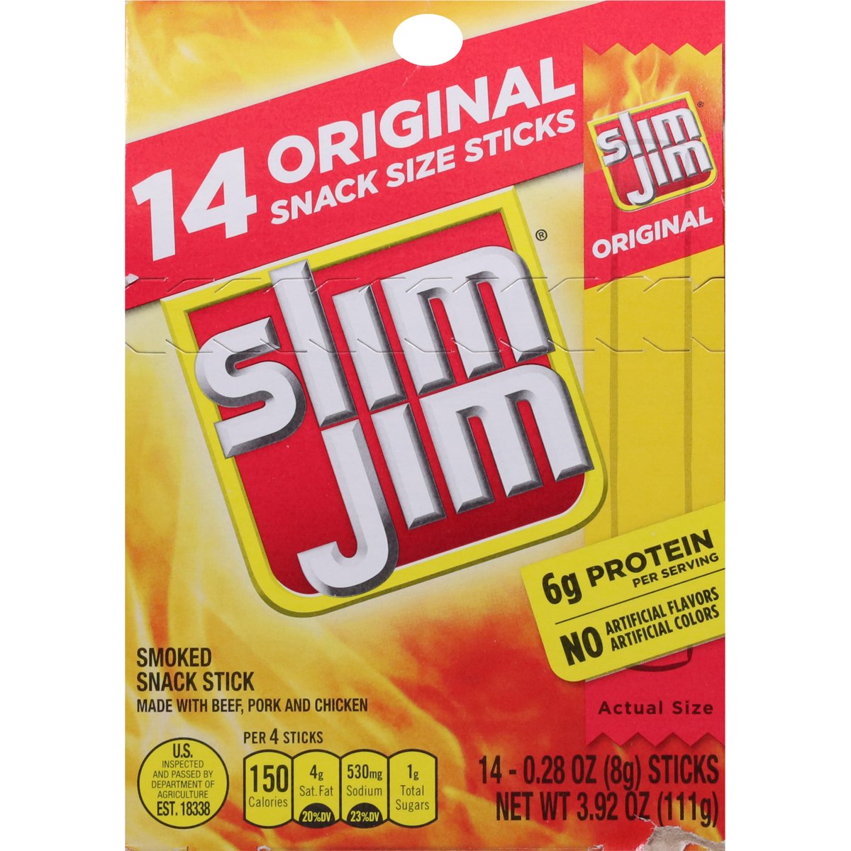 14 Original snack size stick. No: artificial flavors; artificial colors. 6 g protein per serving. Per 4 Sticks: 150 calories; 4 g sat fat (20% DV); 530 mg sodium (23% DV); 1 g total sugars. Grip N rip. U.S. inspected and passed by Department of Agriculture. www.slimjim.com. how2recycle.info. SmartLabel: Scan for more food information or call 1-800-242-6200.Instagram. (at)slimjim. Twitter. (at)slimjim. Facebook. Facebook.com/SlimJim. Questions or comments, visit us at www.slimjim.com or call 1-800-242-6200.