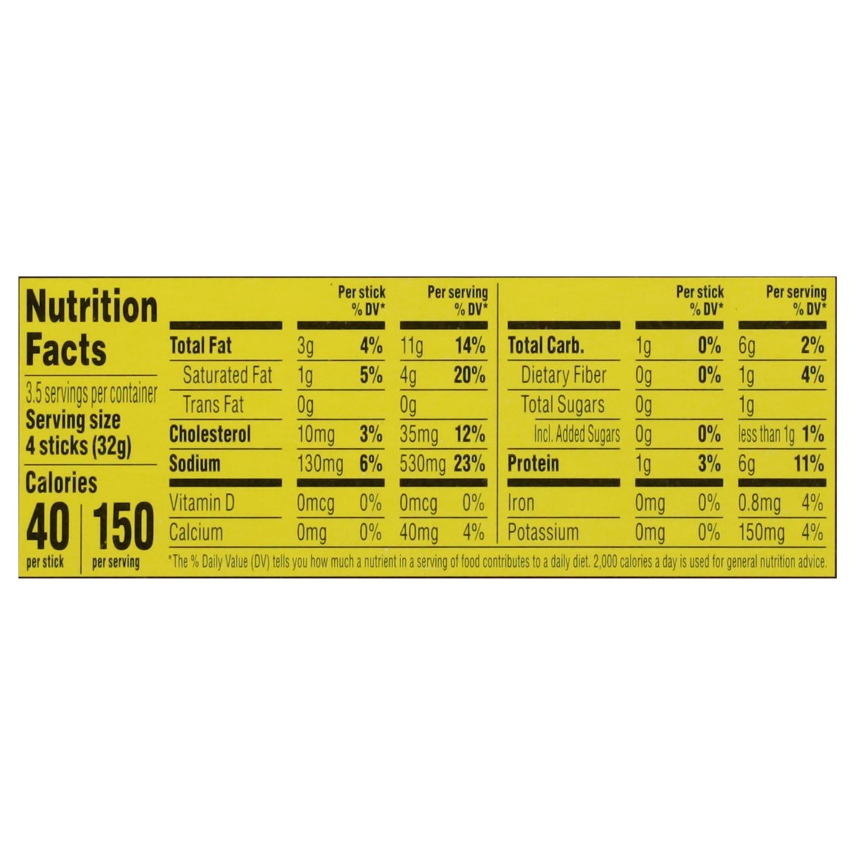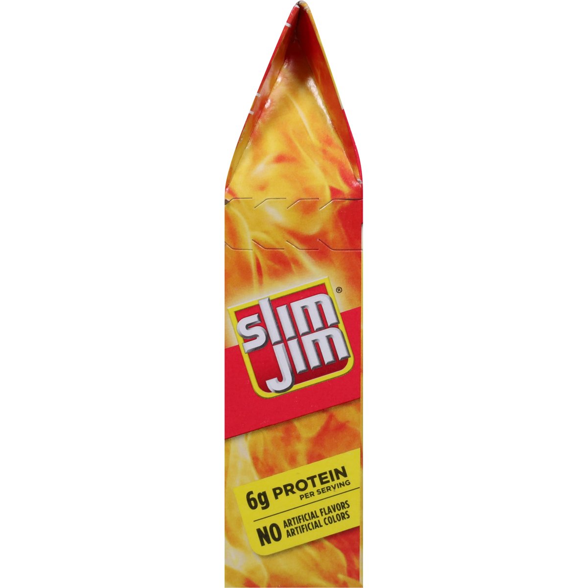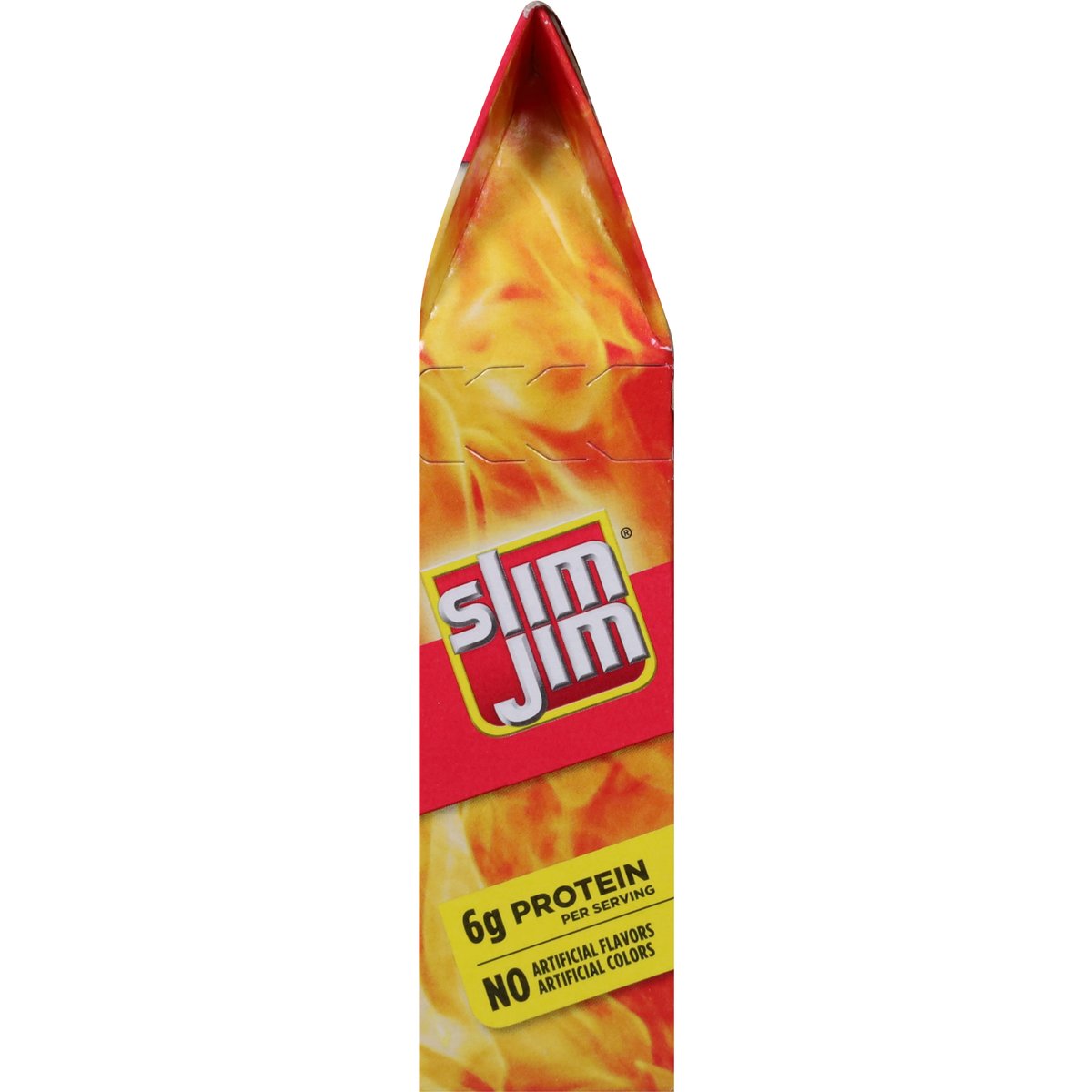 14 Original snack size stick. No: artificial flavors; artificial colors. 6 g protein per serving. Per 4 Sticks: 150 calories; 4 g sat fat (20% DV); 530 mg sodium (23% DV); 1 g total sugars. Grip N rip. U.S. inspected and passed by Department of Agriculture. www.slimjim.com. how2recycle.info. SmartLabel: Scan for more food information or call 1-800-242-6200.Instagram. (at)slimjim. Twitter. (at)slimjim. Facebook. Facebook.com/SlimJim. Questions or comments, visit us at www.slimjim.com or call 1-800-242-6200.