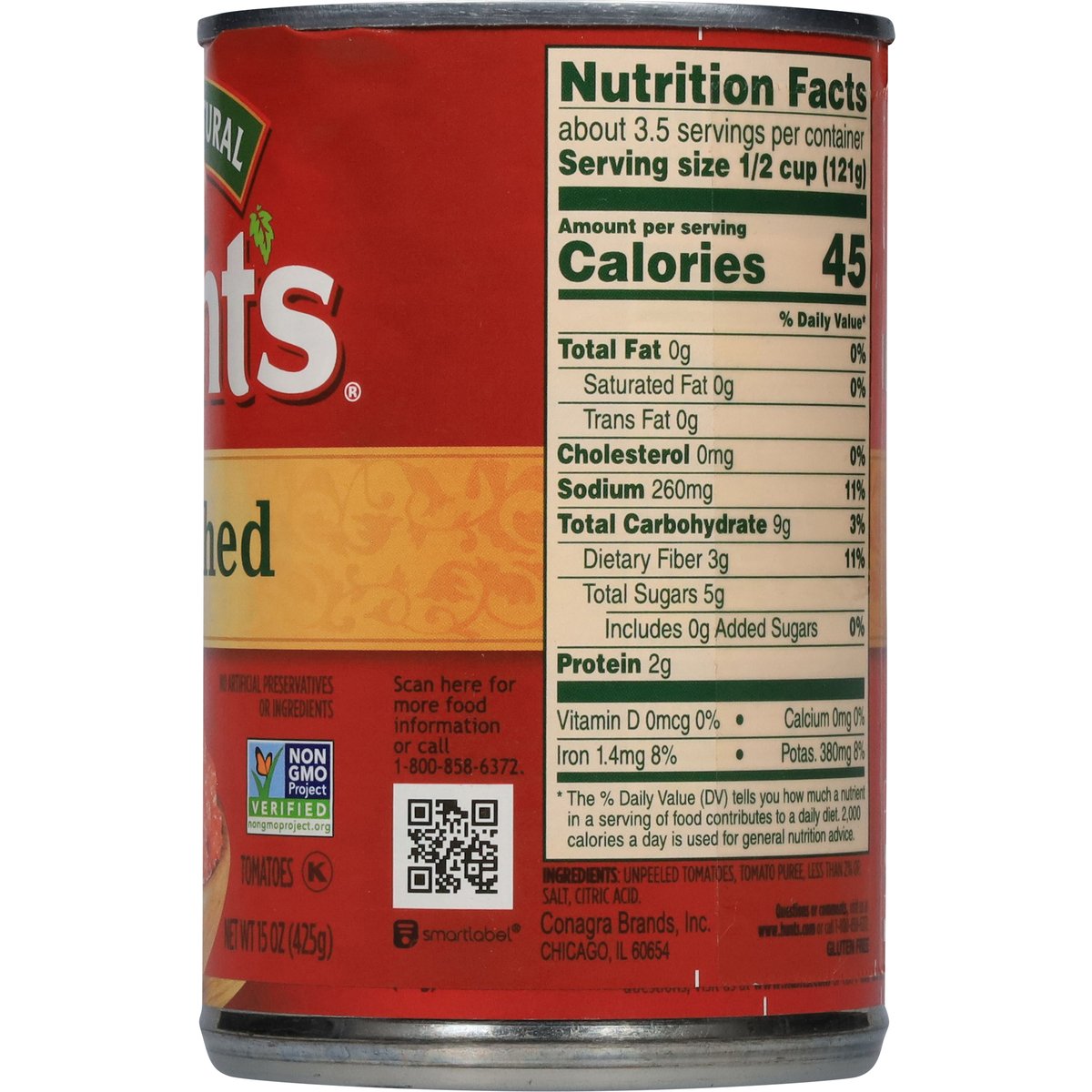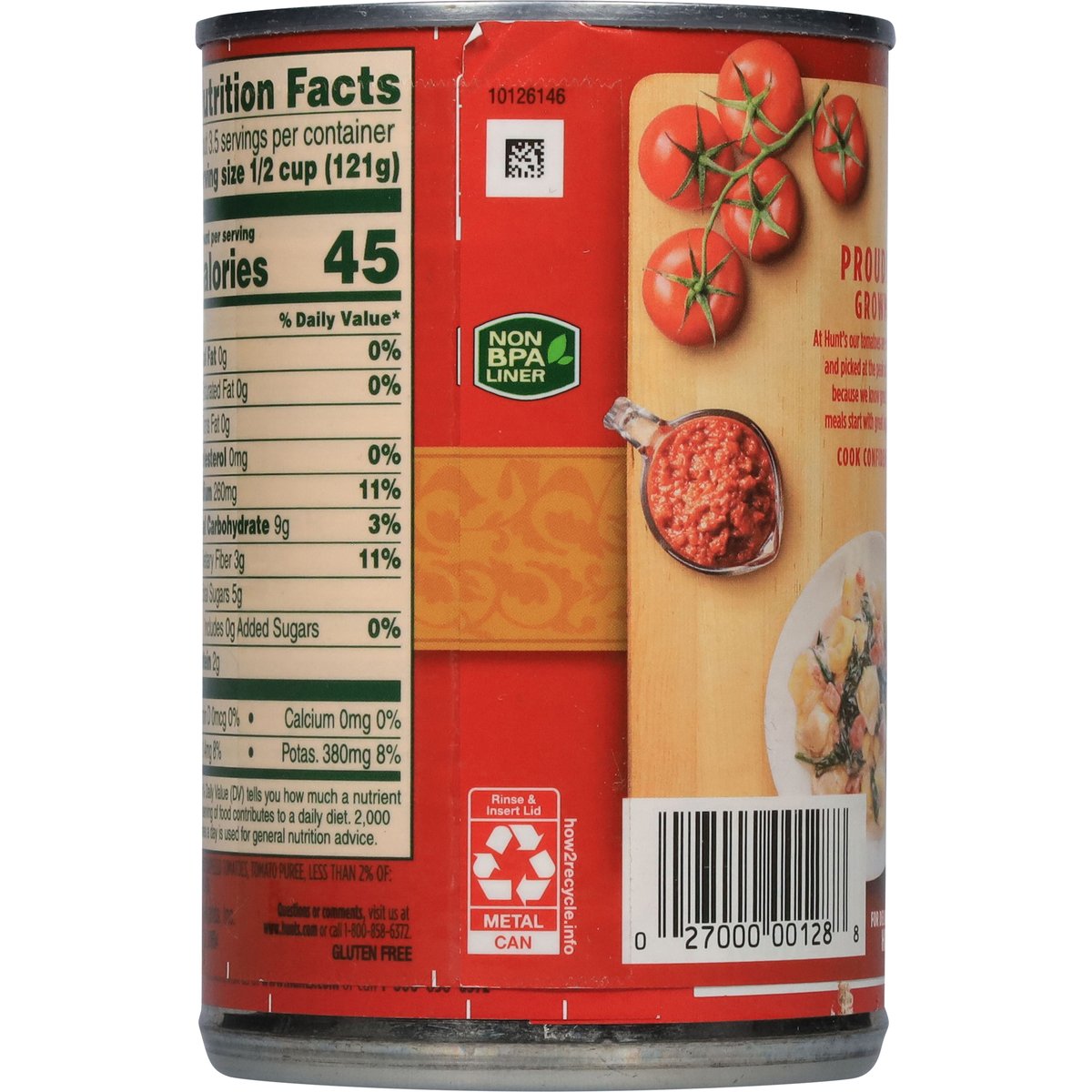 Gluten free. Non-GMO Project verified. nongmoproject.org. No artificial preservatives or ingredients. Proudly Grown: At Hunt's our tomatoes are vine-ripened and picked at the peak of ripeness, because we know great tasting meals start with great ingredients. Cook confidently! hunts.com. how2recycle.info. SmartLabel: Scan for more food information or call 1-800-243-0303. For delicious recipes visit hunts.com. Questions or comments, visit us at www.hunts.com or call 1-800-858-6372. Non-BPA liner.