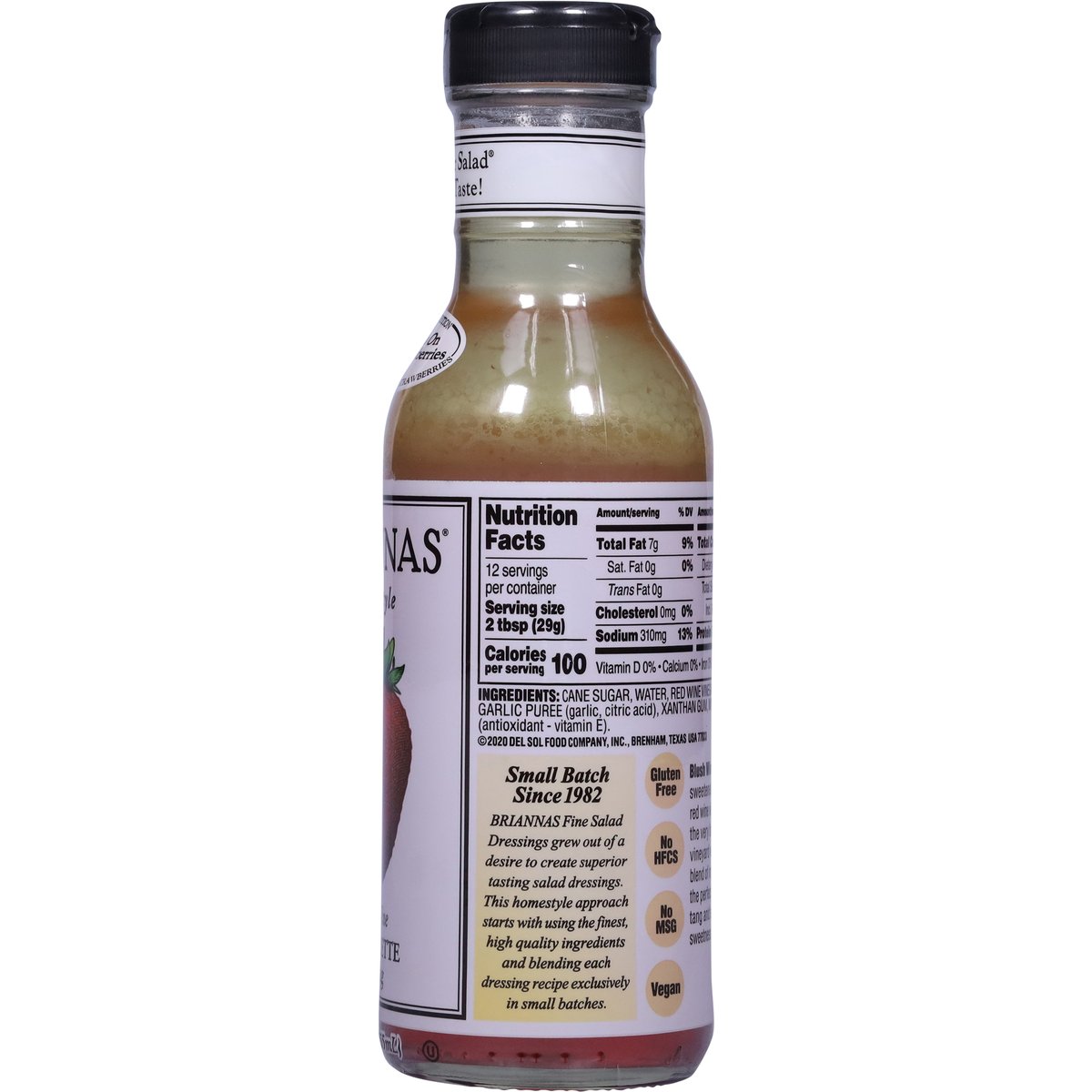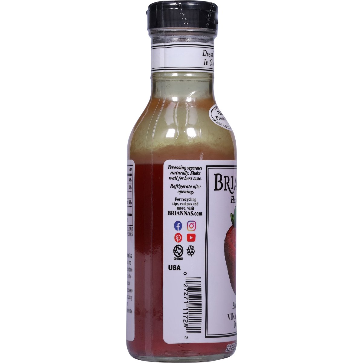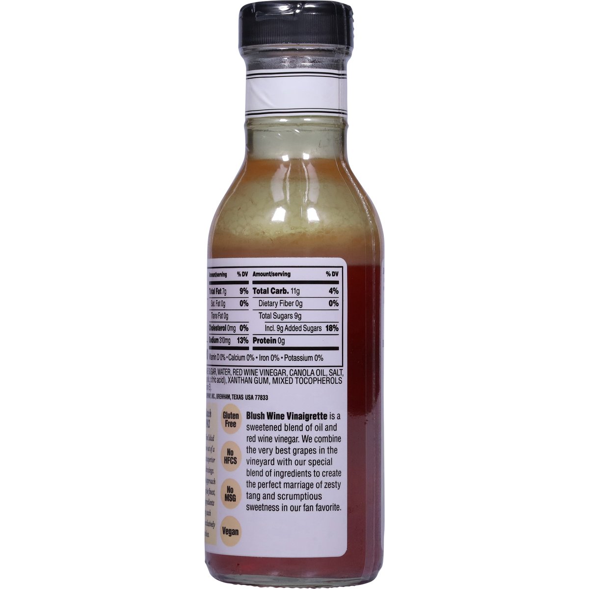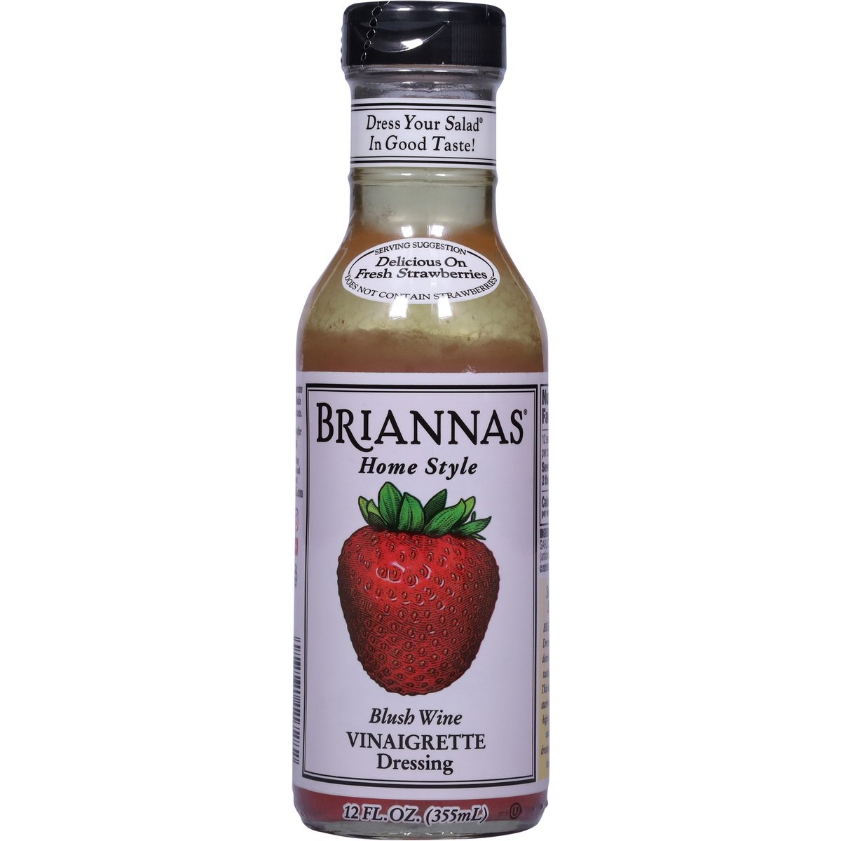 Gluten free. Vegan. Dress your salad in good taste! Does not contain strawberries. No HFCS. No MSG. Blush wine vinaigrette is a sweetened blend of oil and red wine vinegar. We combine the very best grapes in the vineyard with our special blend of ingredients to create the perfect marriage of zesty tang and scrumptious sweetness in our fan favorite. Go Texan. Small batch since 1982. Briannas Fine Salad Dressings grew out of a desire to create superior tasting salad dressings. This homestyle approach starts with using the finest, high quality ingredients and blending each dressing recipe exclusively in small batches. Briannas.com. Facebook. Pinterest. Instagram. YouTube. For recycling tips, recipes and more, visit Briannas.com.