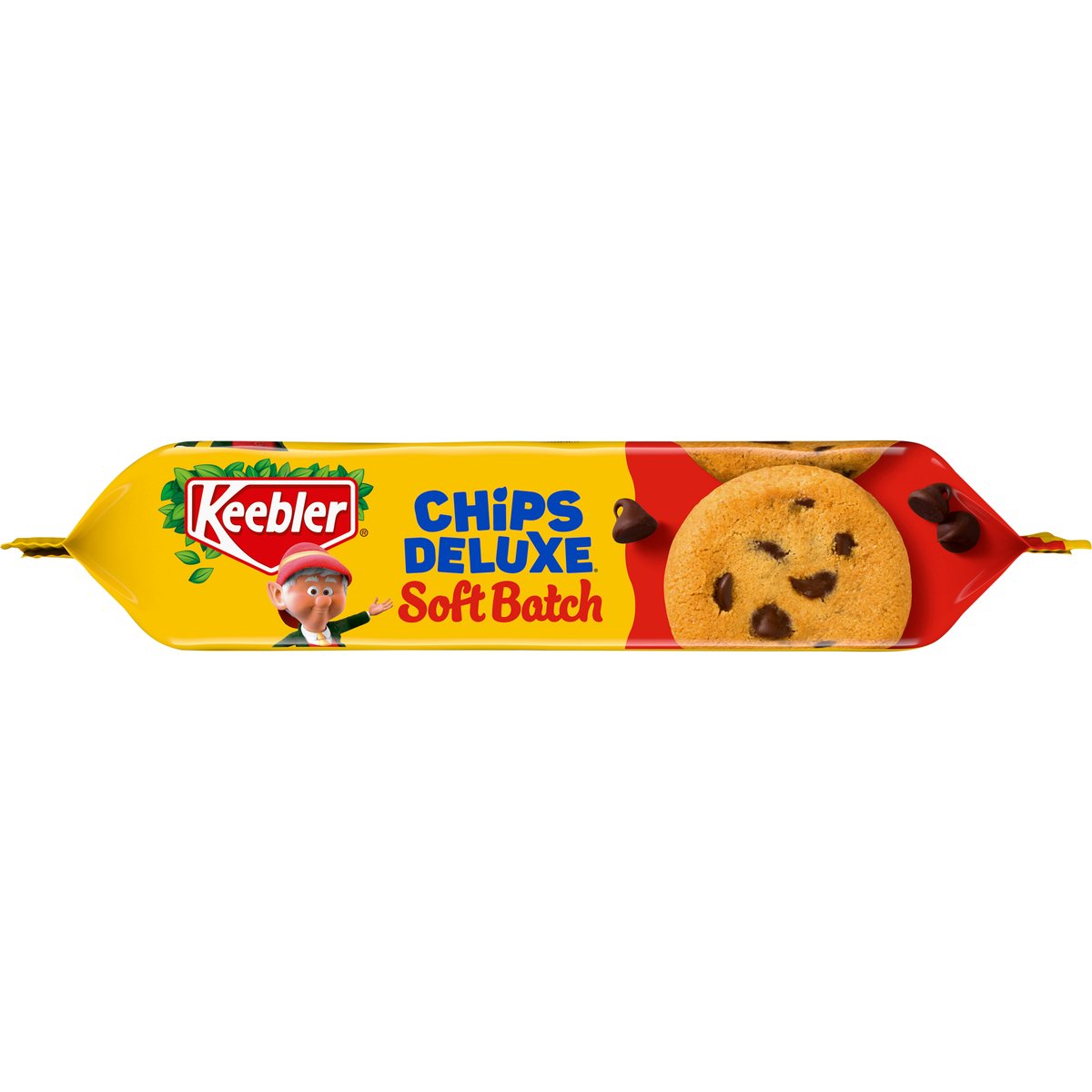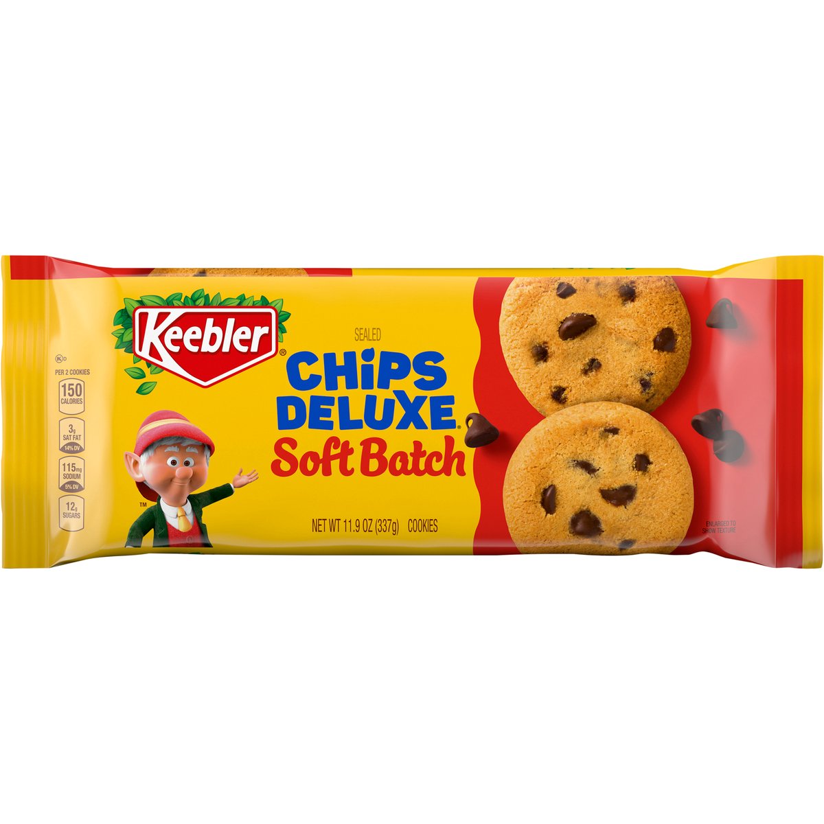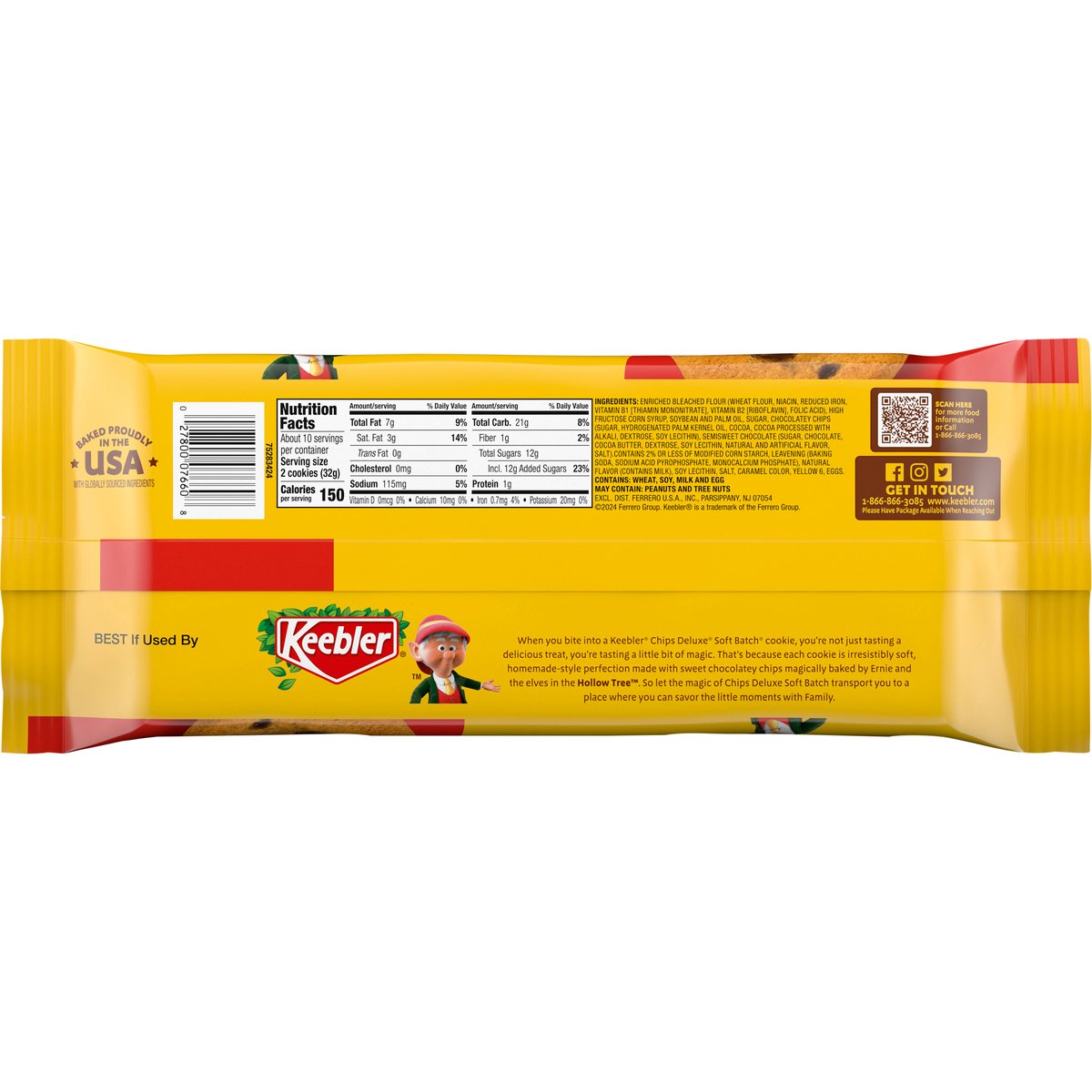 Per 2 Cookies: 150 calories; 3 g sat fat (14% DV); 115 mg sodium (5% DV); 12 g sugars. When you bite into a Keebler Chips Deluxe Soft Batch cookie, you're not just tasting a delicious treat, you're tasting a little bit of magic. That's because each cookie is Irresistibly soft, homemade style perfection made with sweet chocolatey chips magically baked by Ernie and the elves in the Hollow Tree. So let the magic of Chips Deluxe Soft Batch transport you to a place where you can savor the little moments with family. www.keebler.com. Scan for more food information or Call 1-866-866-3085. Facebook. Instagram. Twitter. Get in Touch: 1-866-866-3085; www.keebler.com. Please have package available when reaching out. Sealed. Baked proudly in the USA with globally sourced ingredients.