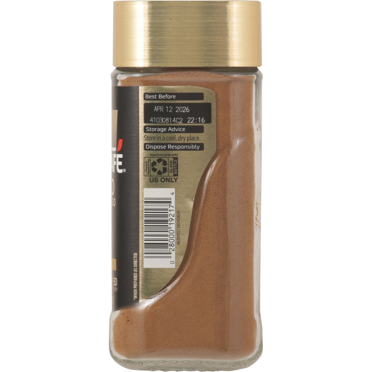 Velvety crema golden roasted arabica. Responsibly sourced coffee. 50 cups*. * When prepared as directed. www.nescafeusa.com. how2recycle.info. Let's talk. Call/text: 1-800-505-2876. www.nescafeusa.com. Dispose responsibly. Product of France.
