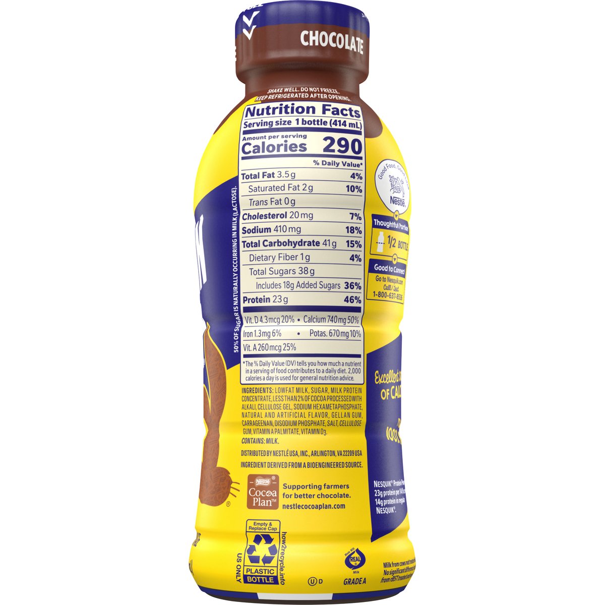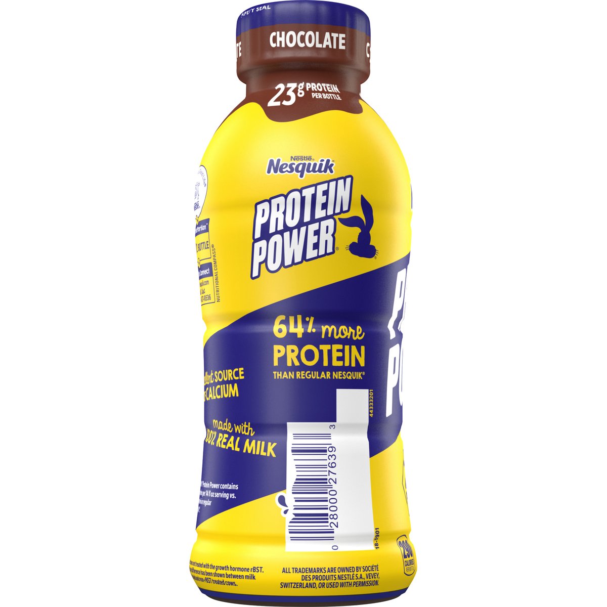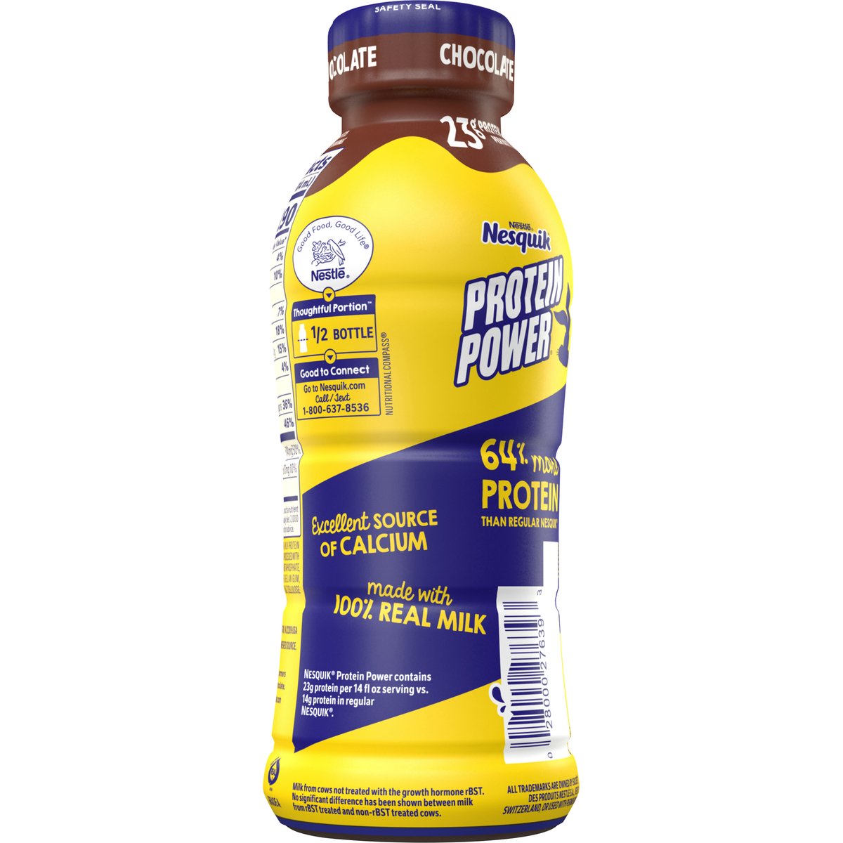 23 g protein per bottle. 290 calories per bottle. Nutritional Compass: Nestle - Good food, good life. Thoughtful Portion: 1/2 bottle. Good to Connect: Go to Nesquik.com. Call or text 1-600-637-8536. Excellent source of calcium. Nesquik Protein Power contains 23 g protein per 14 fl oz serving vs 14 g protein in regular Nesquik. 64% more protein than regular Nesquik (50% of sugar is naturally occurring in milk (lactose)). Ingredient derived from a bioengineered source. Milk from cows not treated with the growth hormone rBST. No significant difference has been shown between milk from rBST treated and non-rBST treated cows. Real. Grade A. Nesquik.com. how2recycle.info. Nestle Cocoa Plan: Supporting farmers for better chocolate. nestlecocoaplan.com. Safety seal.