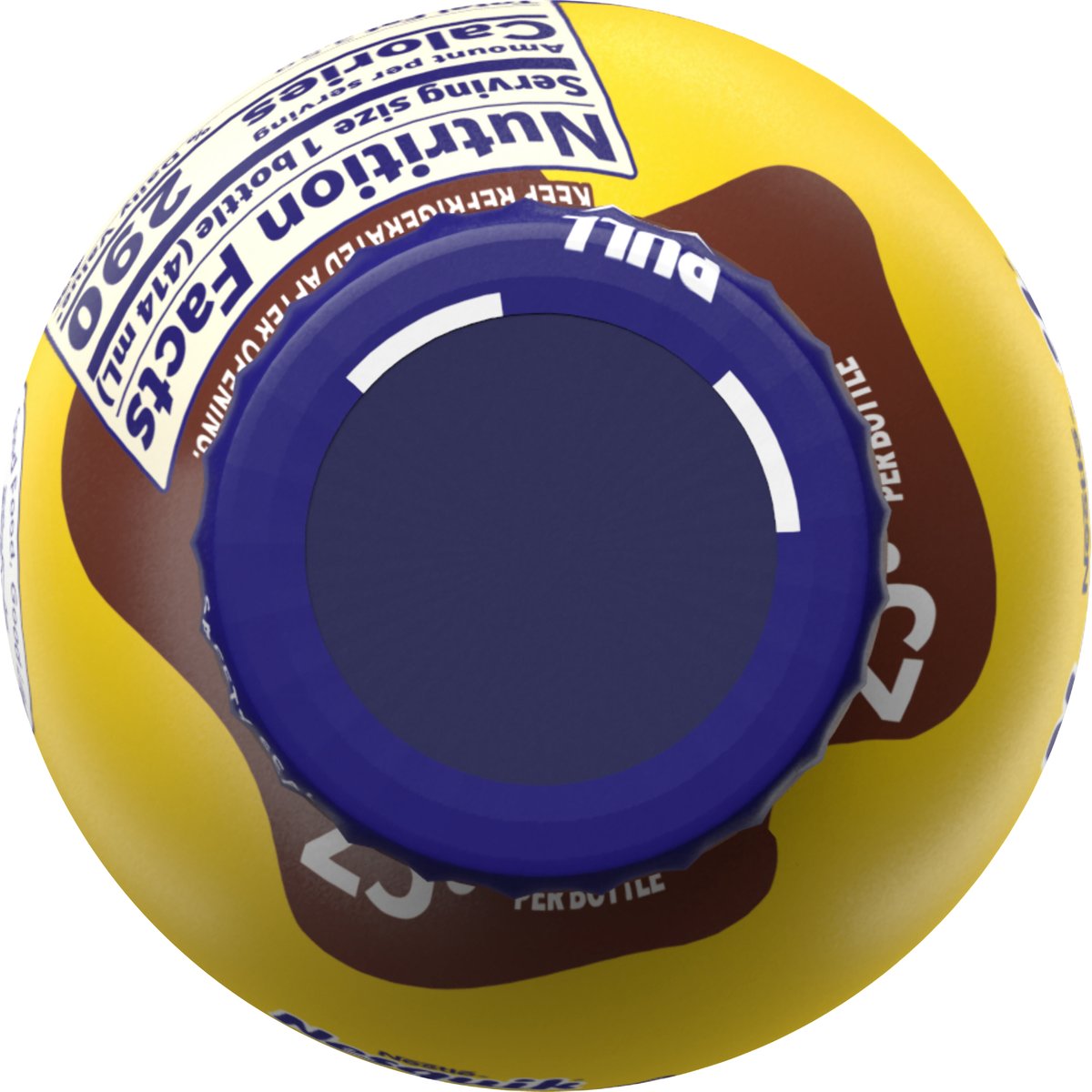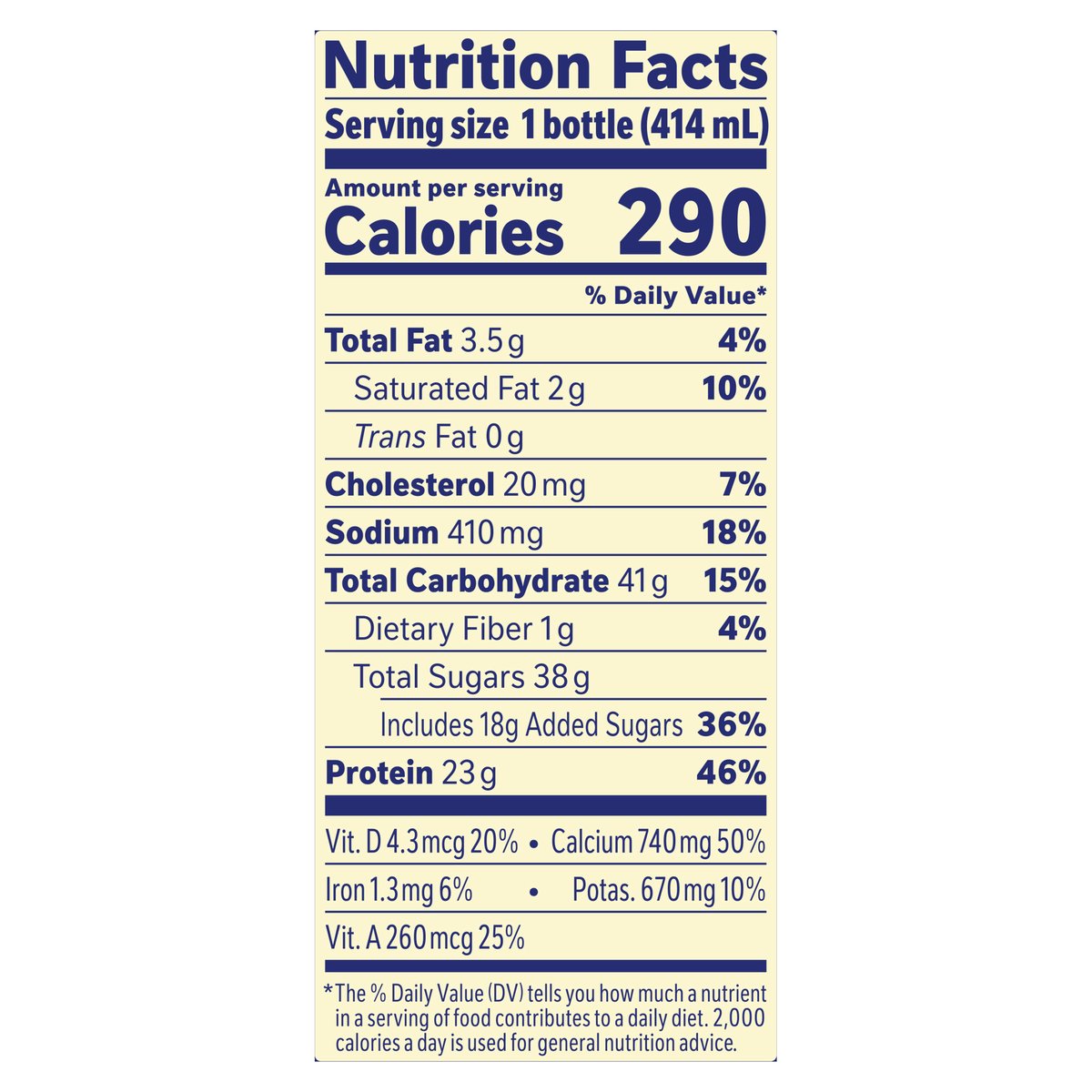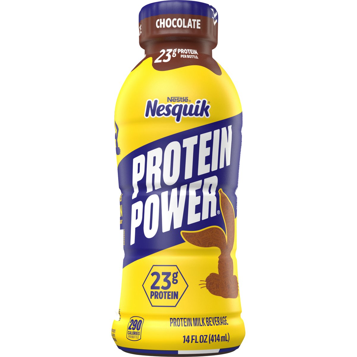 23 g protein per bottle. 290 calories per bottle. Nutritional Compass: Nestle - Good food, good life. Thoughtful Portion: 1/2 bottle. Good to Connect: Go to Nesquik.com. Call or text 1-600-637-8536. Excellent source of calcium. Nesquik Protein Power contains 23 g protein per 14 fl oz serving vs 14 g protein in regular Nesquik. 64% more protein than regular Nesquik (50% of sugar is naturally occurring in milk (lactose)). Ingredient derived from a bioengineered source. Milk from cows not treated with the growth hormone rBST. No significant difference has been shown between milk from rBST treated and non-rBST treated cows. Real. Grade A. Nesquik.com. how2recycle.info. Nestle Cocoa Plan: Supporting farmers for better chocolate. nestlecocoaplan.com. Safety seal.