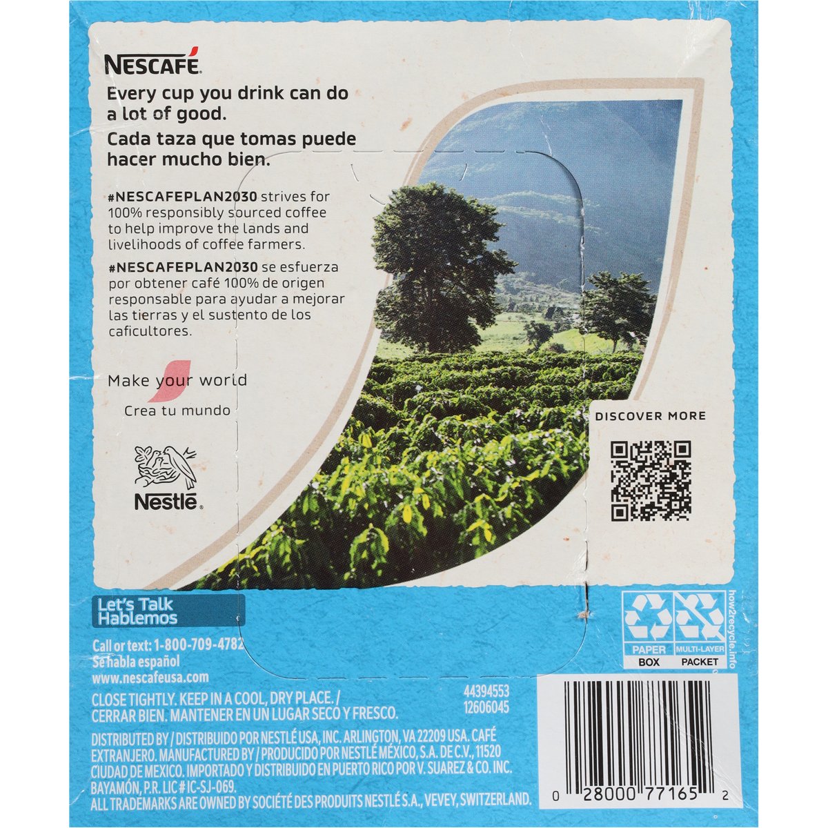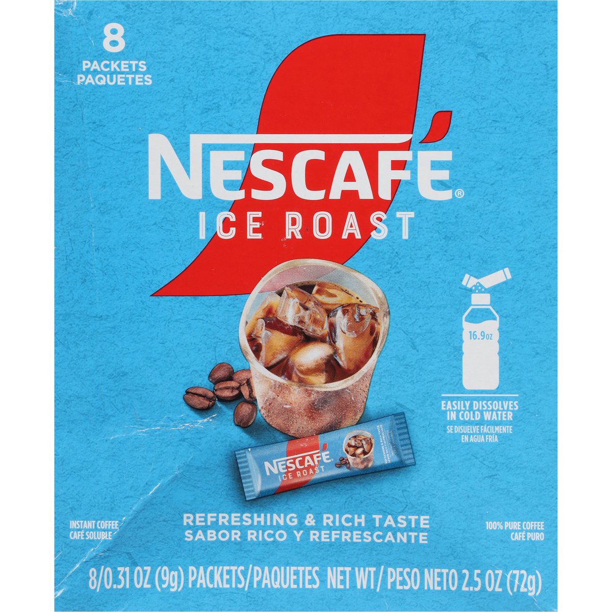 100% pure coffee. Easily dissolves in cold water. Refreshing & rich taste. Anytime, anywhere! www.nescafeusa.com. how2recycle.info. Discover more. Let's Talk: Call or text: 1-800-709-4782. www.nescafeusa.com. Every cup you drink can do a lot of good. #NescafePlan2030 strives for 100% responsibly sourced coffee to help improve the lands and Livelihoods of coffee farmers. Make your world. Love the irresistibly refreshing taste of Nescafe Ice Roast? Try one of our jars!