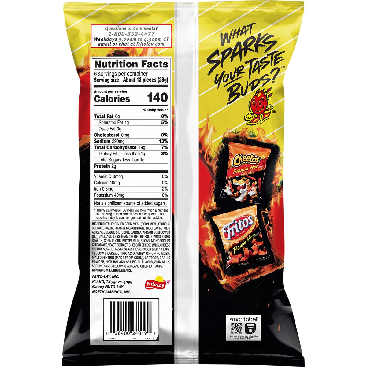 Onion flavored rings. New look, same taste. What sparks your taste buds? Guaranteed fresh until printed date. fritolay.com. SmartLabel: Scan for more information or call 1-800-352-4477. Questions or comments? 1-800-352-4477. Weekdays 9:00 am to 4:30 pm CT email or chat at fritolay.com.