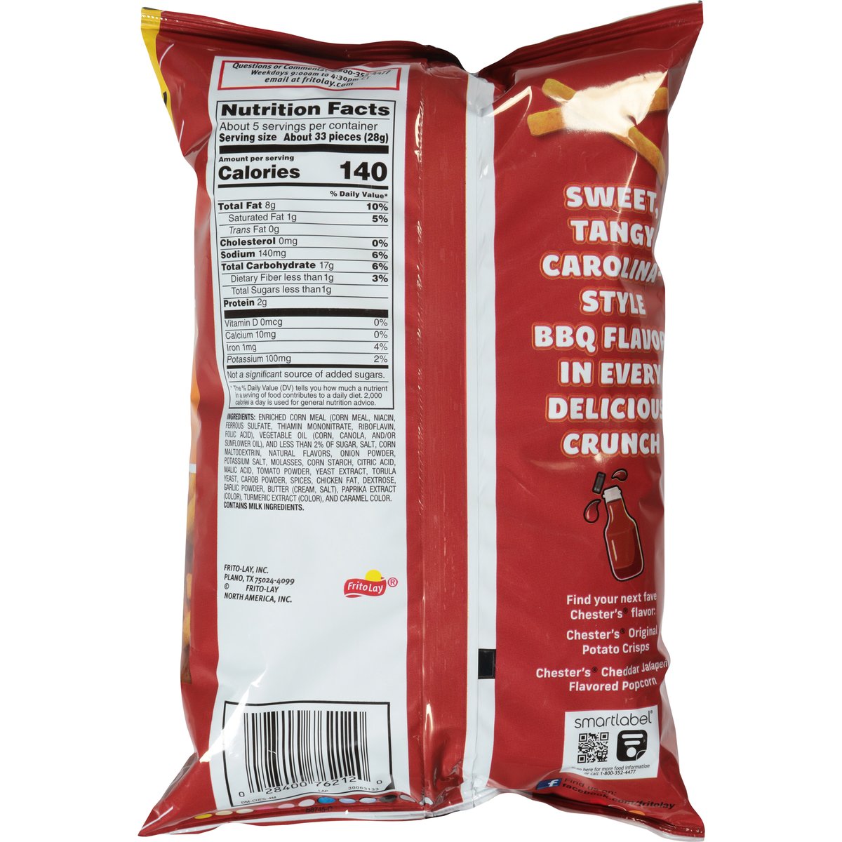 New. Sweet, tangy, Carolina- style BBQ flavor in every delicious crunch. fritolay.com. SmartLabel: Scan for more food information or call 1-800-352-4477. Find us on: facebook.com/fritolay. Questions or comments? 1-800-352-4477. Weekdays 9:00am to 4:30pm CT email at fritolay.com. Find your next fave Chester's flavor: Chester's Original Potato Crisps. Chester's Cheddar Jalapeno Flavored Popcorn.