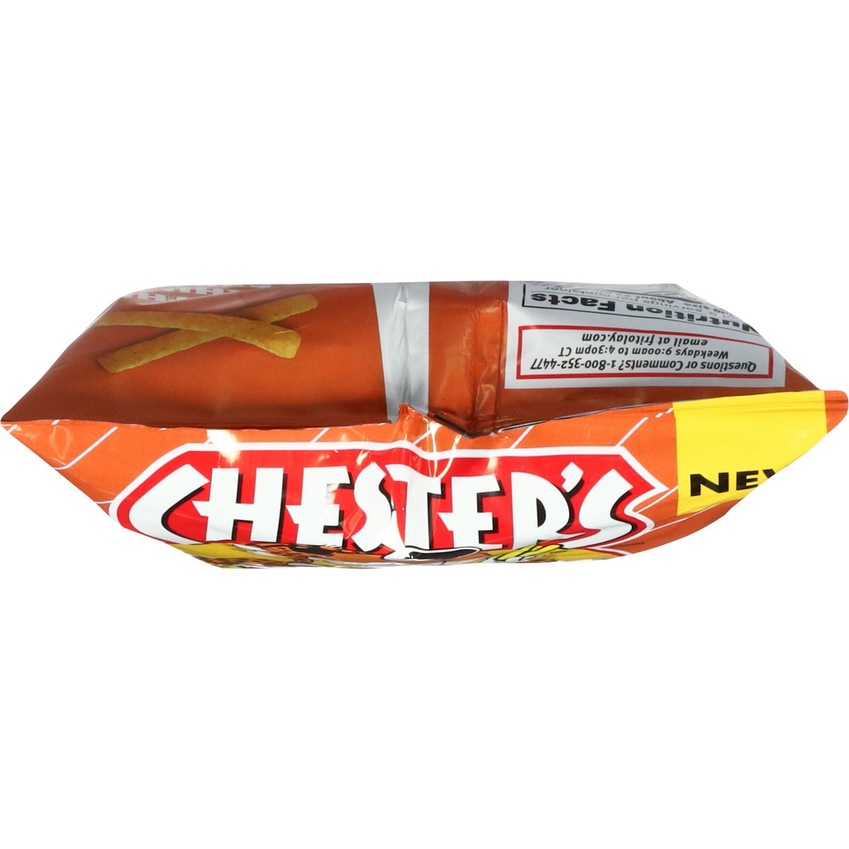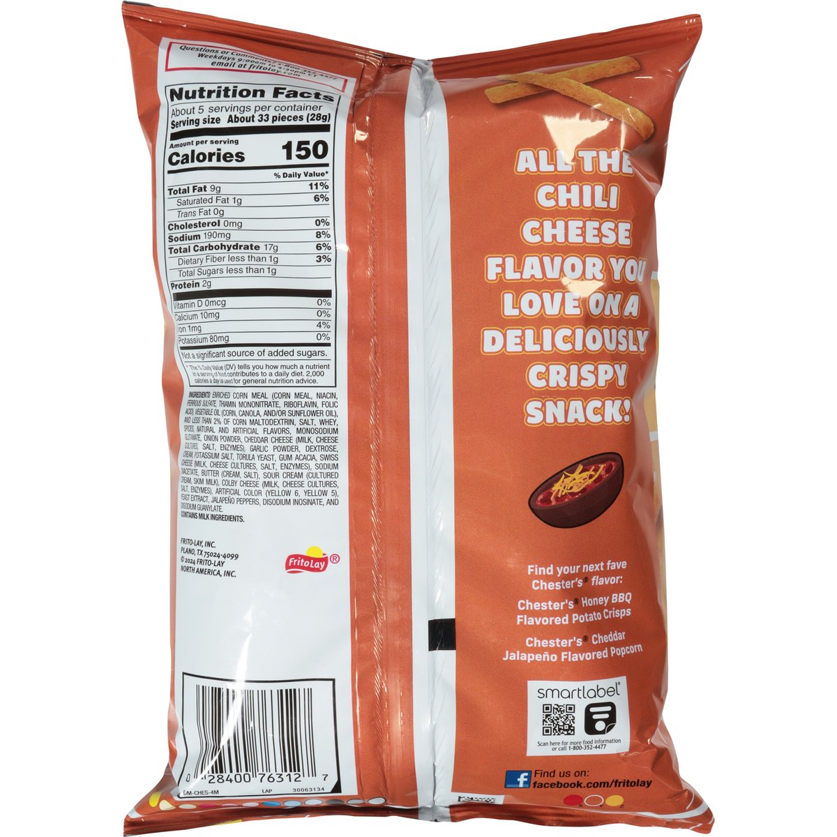 New. All the chili cheese flavor you love on a deliciously crispy snack! fritolay.com. SmartLabel: Scan for more food information or call 1-800-352-4477. Facebook: Find us on: facebook.com/fritolay. Questions or comments? 1-800-352-4477. Weekdays 9:00am to 4:30pm CT email at fritolay.com. Find your next fave Chester's flavor: Chester's Honey BBQ Flavored Potato Crisps; Chester's Cheddar Jalapeno Flavored Popcorn.