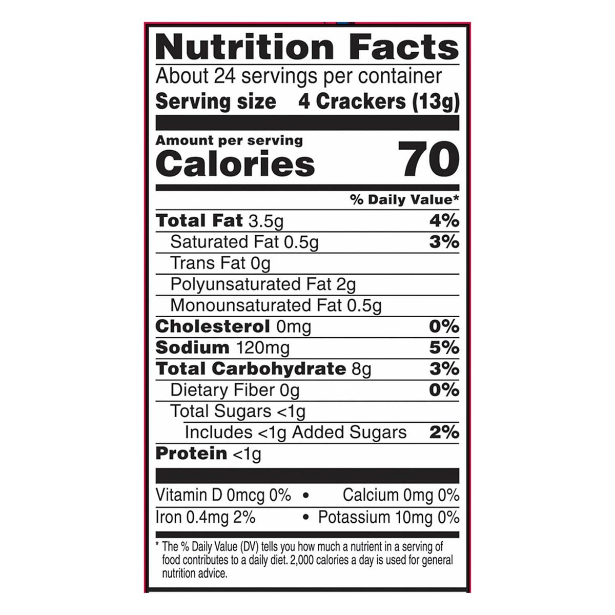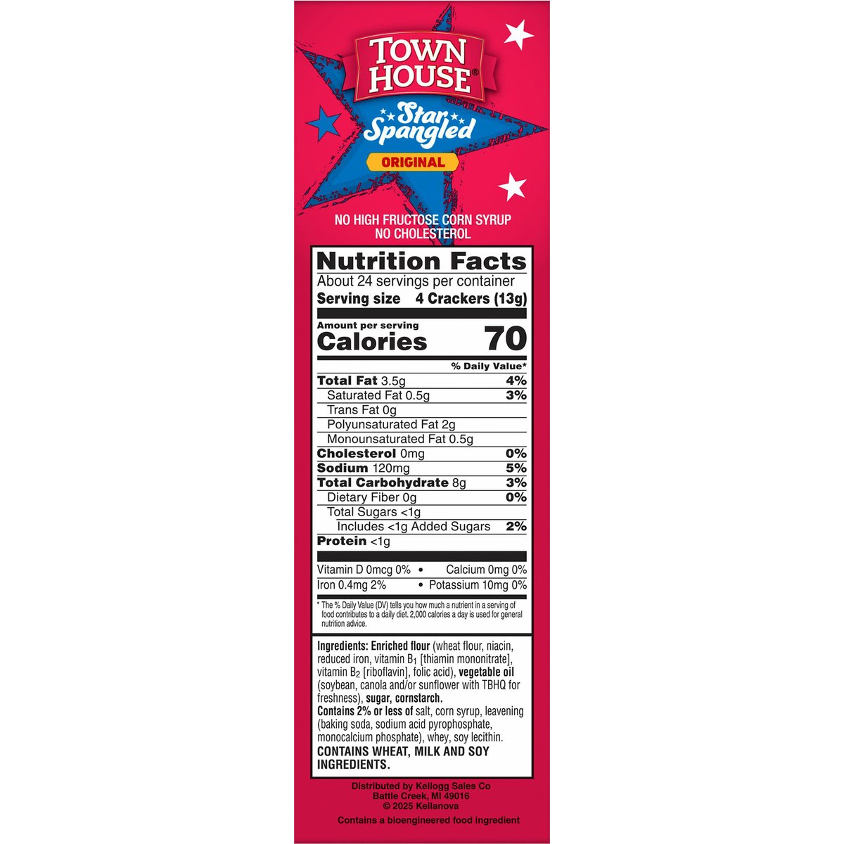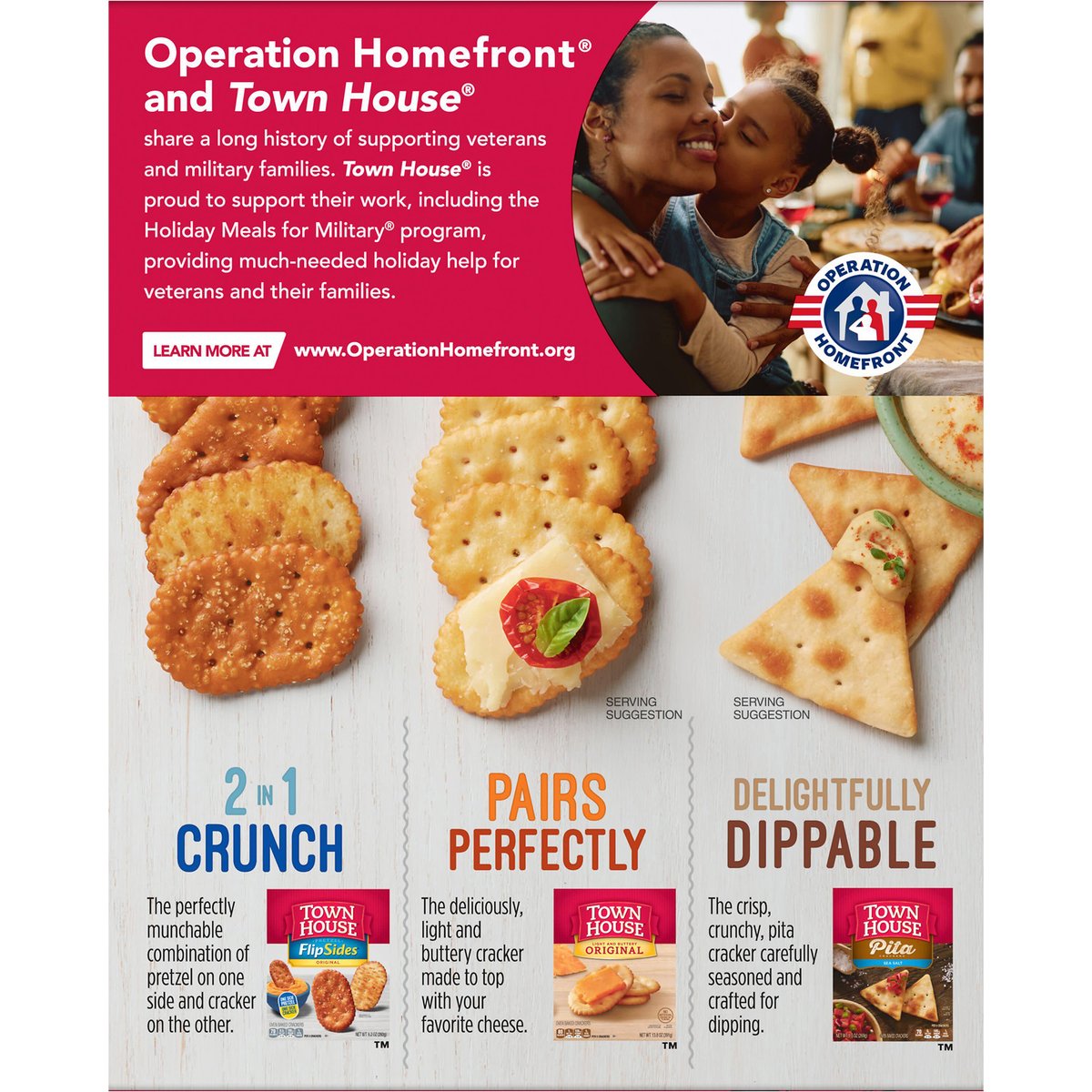 Per 4 Crackers: 70 calories; 0.5 g sat fat (3% DV); 120 mg sodium (5% DV); <1 g total sugars. No cholesterol. Contains a bioengineered food ingredient. Limited time only. See updated allergen information. No high fructose corn syrup. kellogs.com. how2recycle.info. Scan code. Learn how town house supports US Veterans. Questions or Comments? Visit kellanovaus.com. Call 1-877-453-5837. Operation Homefront and Townhouse share a long history of supporting veterans and military families. Townhouse is proud to support their work, including the holiday meals for the military program, providing much-needed holiday help for veterans and their families. Learn more at www.operationhomefront.org 2 in 1 Crunch: The perfectly munchable combination of pretzel on one side and cracker on the other. Flipsides. Oven baked crackers. Pairs Perfectly: The deliciously, light and buttery cracker made to top with your favorite cheese. Town house Light and Buttery original. Delightfully Dippable: The crisp, crunchy, pita cracker carefully seasoned and crafted for dipping. Town House Pita. Baked in the USA.