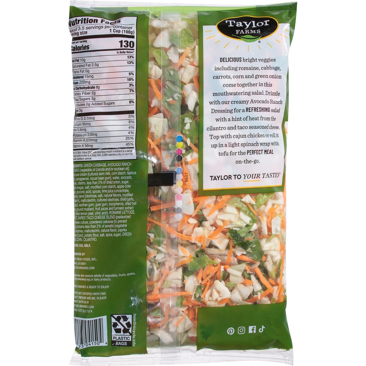 Green cabbage, romaine lettuce, carrots, taco cheese blend, green onion, crisp corn, cilantro with avocado ranch dressing. Vegetarian (A vegetarian diet consists wholly of vegetables, fruits, grains, nuts and sometimes egg or dairy products). Gluten free. Excellent source of vitamins A & K. A vegetarian diet consists wholly of vegetables, fruits, grains, nuts and sometimes egg or dairy products. New look! Contains 5 vegetables. Produce washed & ready to enjoy. Delicious bright veggies including romaine, cabbage, carrots, corn and green onion come together in this mouthwatering salad. Drizzle with our creamy avocado ranch dressing for a refreshing salad with a hint of heat from the cilantro and taco seasoned cheese. If you're not satisfied with this product, neither are we. Please connect with us at www.taylorfarms.com or call 1-877-323-7374. www.taylorfarms.com. how2recycle.info. Pinterest. Instagram. Facebook. TikTok.