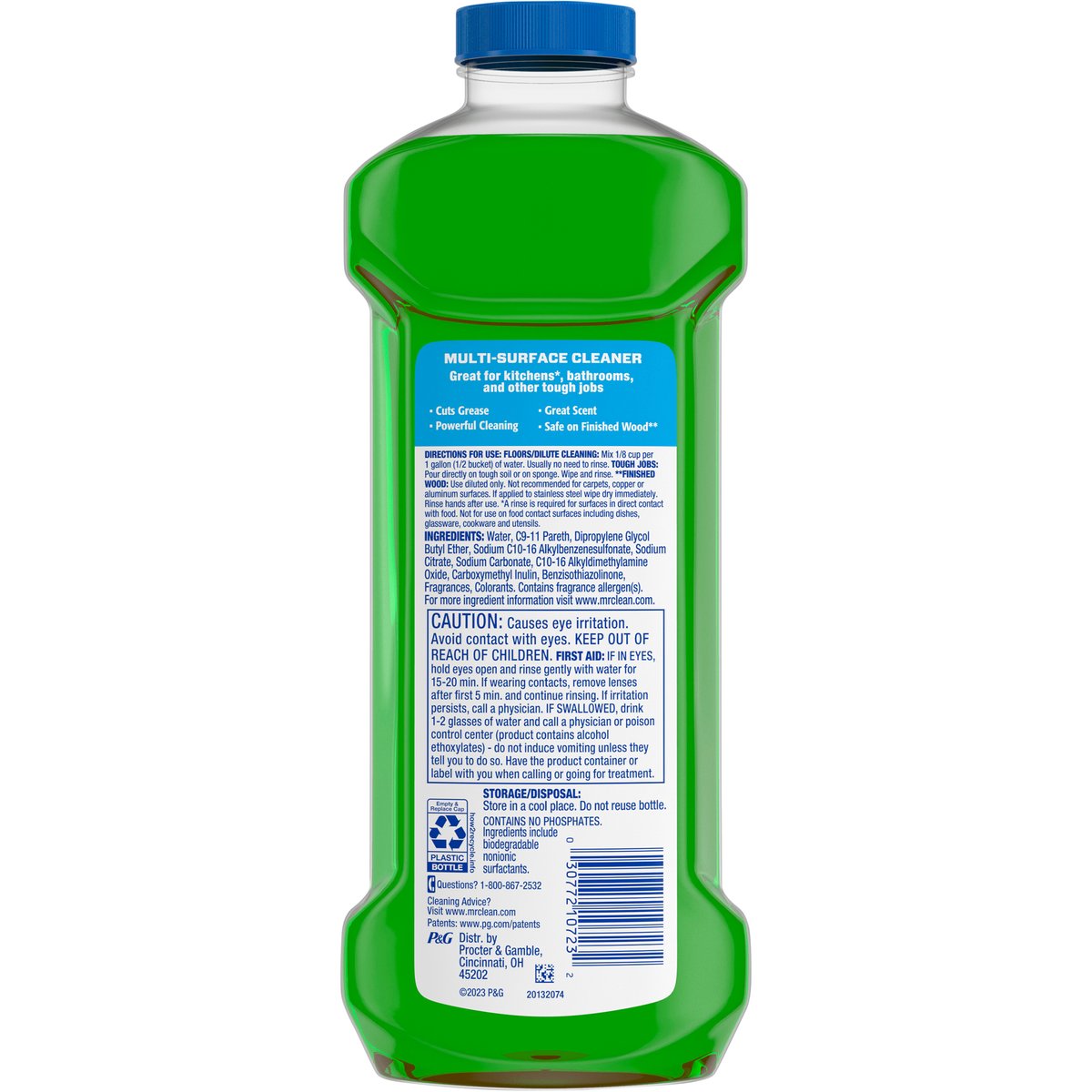 2x concentrated*. Long lasting freshness. Multi-Surface Cleaner: Great for kitchens*, bathrooms, and other tough jobs. Cuts grease. Great scent. Powerful cleaning. Safe on finished wood**. * vs. Mr. Clean original. * A rinse is required for surfaces in direct contact with food. Not for use on food contact surfaces including dishes, glassware, cookware and utensils. ** Finished Woods: Use diluted only. www.mrclean.com. how2recycle.info. Questions? 1-800-867-2532. Cleaning advice? Visit www.mrclean.com.