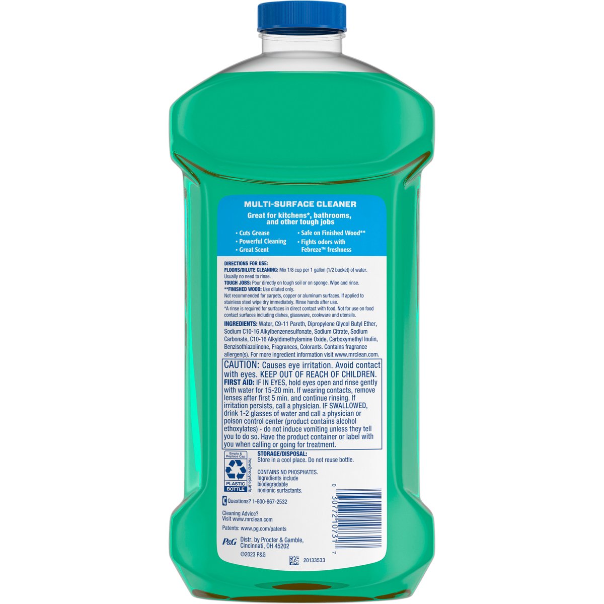 2x concentrated(a). Long lasting freshness. Great for kitchens*, bathrooms, and other tough jobs. Cuts grease; Powerful cleaning; Great scent; Safe on finished wood**; Fights odors with Febreze freshness. Contains no phosphates. (a) vs. Mr. Clean original. * A rinse is required for surfaces in direct contact with food. Not for use on food contact surfaces including dishes, glassware, cookware and utensils. ** Finished Wood: Use diluted only. how2recycle.info.www.mrclean.com. For more ingredient information visit www.mrclean.com. Questions? 1-800-867-2532. Cleaning Advice? Visit www.mrclean.com.