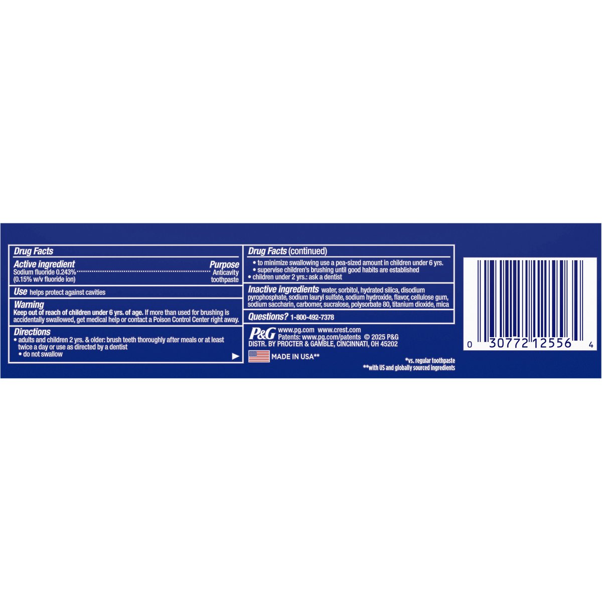 Fluoride anticavity toothpaste. Enamel safe. Daily whitening upkeep. Whiter teeth in 5 days. 3DWhite Technology: Removes 90% more surface stains*. 2x faster whitening. Gives you a flawless bright & white smile. * vs. regular toothpaste. Questions? 1-800-492-7378. Use together to start seeing a white smile after 1 day. Better together! Use with Oral-B IO electric brush + use with Crest 3DWhite mouthwash + use with Crest 3DWhitestrips. Made in USA**. ** with US and globally sourced ingredients.