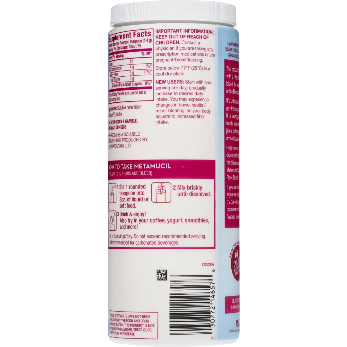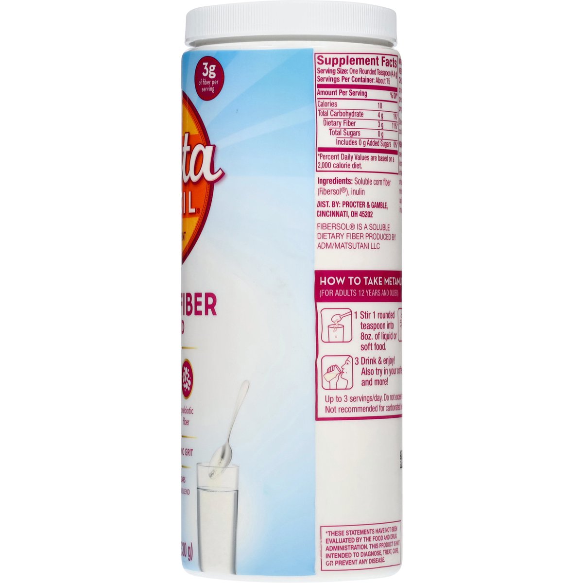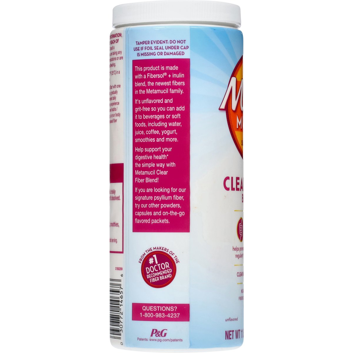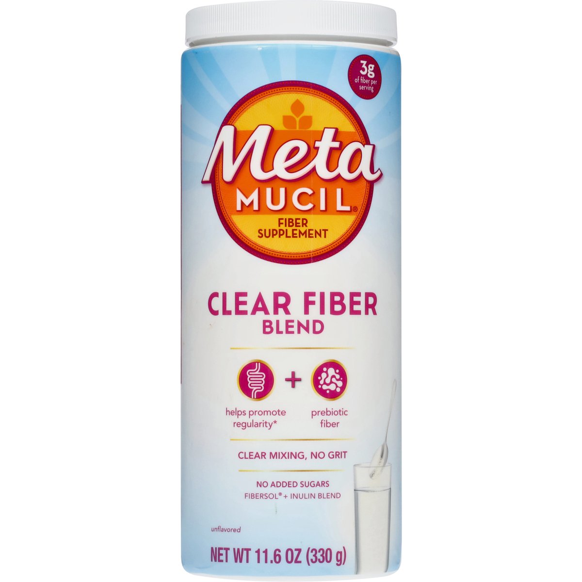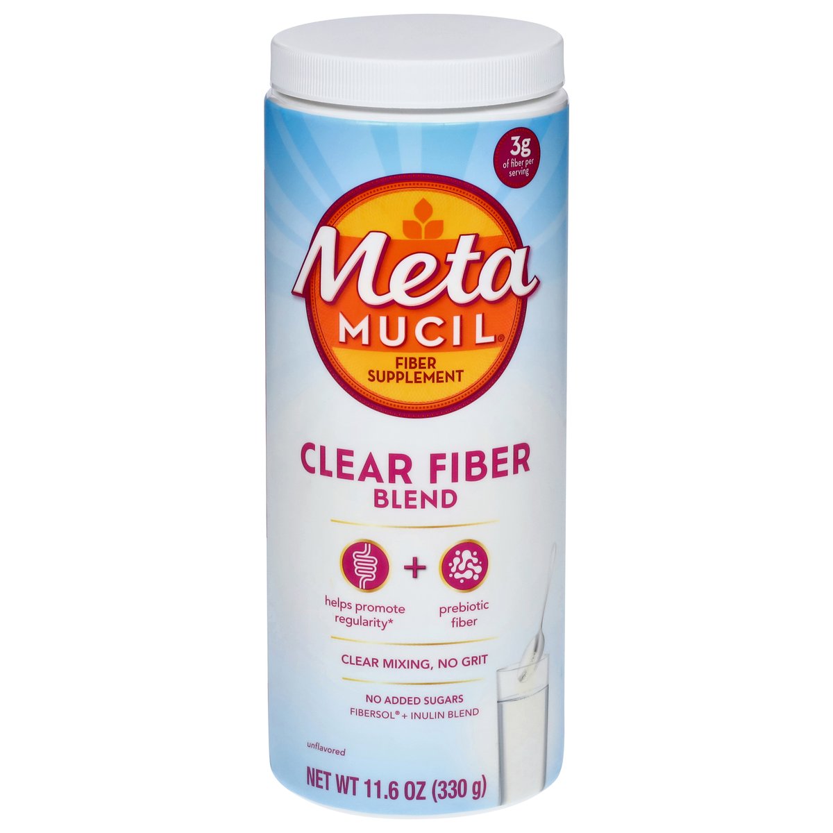 Fiber Supplement. Fibersol + inulin blend. Unflavored. 3 g of fiber per serving. No added sugars. Helps promote regularity * + prebiotic fiber. Clear mixing, no grit. This product is made with a Fibersol + inulin blend, the newest fibers in the Metamucil family. It's unflavored and grit-free so you can add it to beverages or soft foods, including water, juice, coffee, yogurt, smoothies and more. Help support your digestive health * the simple way with Metamucil Clear Fiber Blend! From the makers of #1 doctor recommended fiber brand. Questions? 1-800-983-4237. If you are looking for our signature psyllium fiber, try our other powders, capsules and on-the-go flavored packets. *These statements have not been evaluated by the Food and Drug Administration. This product is not intended to diagnose, treat, cure or prevent any disease.