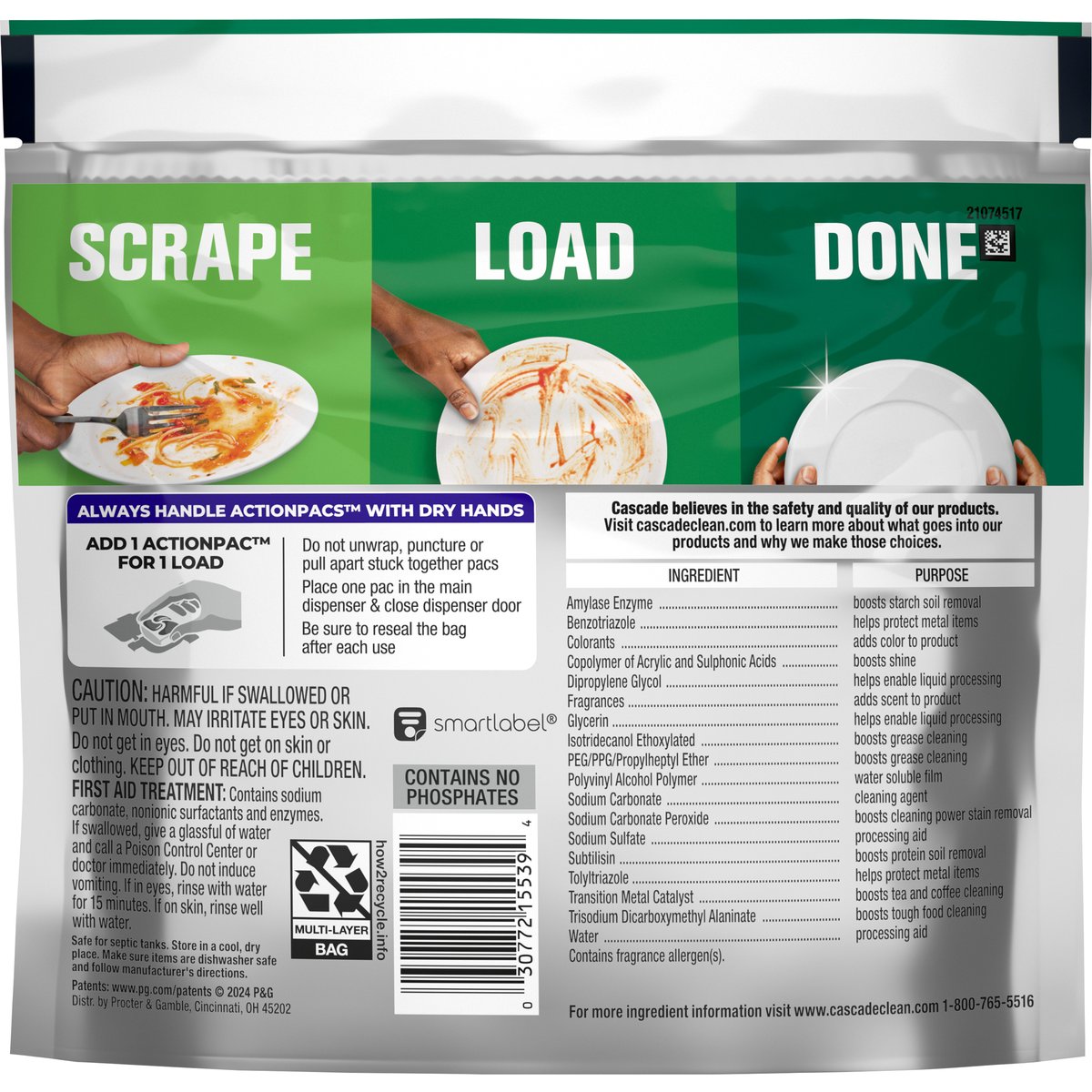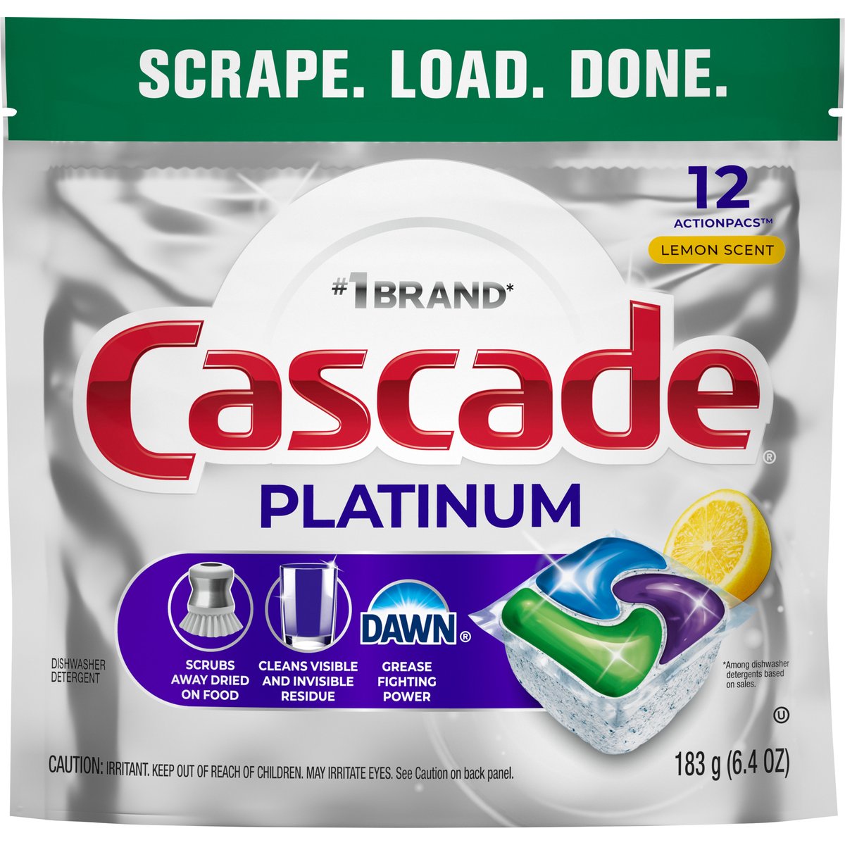 Scrape. Load. Done. #1 brand*. Scrubs away dried on food. Cleans visible and invisible residue. Dawn: Grease fighting power. Contains no phosphates. Safe for septic tanks. *Among dishwasher detergents based on sales. www.cascadeclean.com. how2recycle.info. SmartLabel. For more ingredient information visit www.cascadeclean.com. 1-800-765-5516.