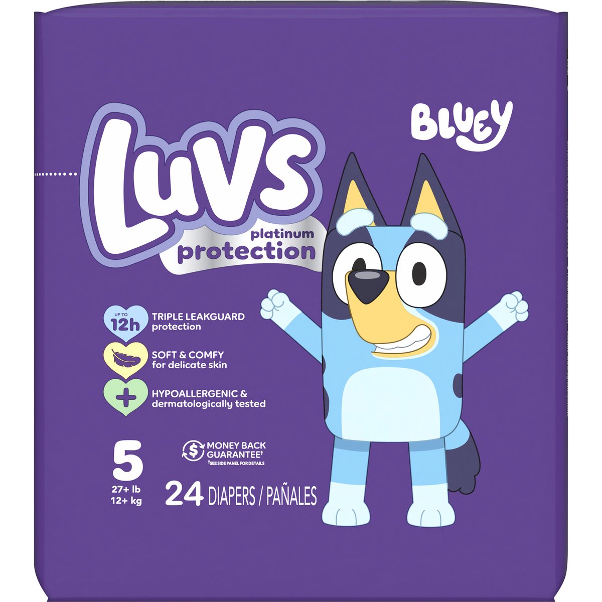 27+ lb 12+kg. Bluey. Platinum protection. Up to 12h triple leakguard protection. Soft & comfy for delicate skin. Hypoallergenic & dermatologically tested. Made with a light Luvs scent. If you notice gel-like material on your baby's skin, don't be alarmed. This comes from the diaper padding and can be easily removed by wiping your baby's skin with a soft, dry cloth. Money back guarantee (Money Back Guarantee: If you're not completely satisfied, please send the original receipt and UPC to us within 45 days of purchase for a full product refund via prepaid card. Limited to one redemption per household or name. For additional details, please call 1-888-No-Leaks (1-888-665-3257)). luvsdiapers.com. how2recycle.info. Visit luvsdiapers.com for special offers, product info & more. Question 1-888-No-Leaks (1-888-665-3257) Made in USA from domestic and imported materials.