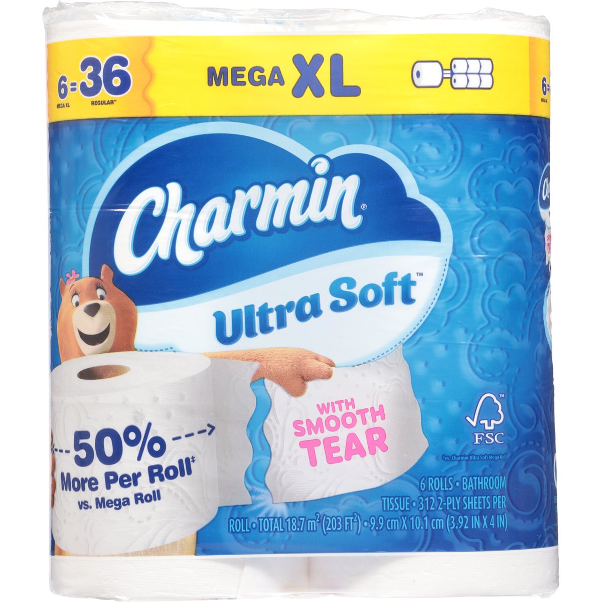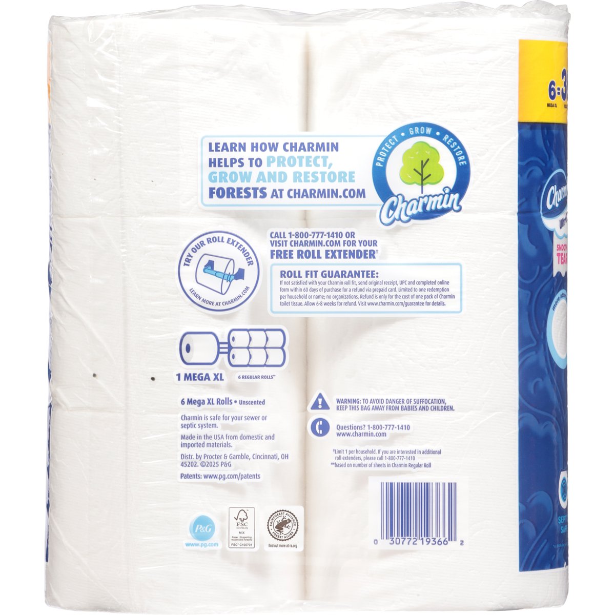 9.9 cm x 10.1 cm (3.92 in x 4 in). 312 2-ply sheets per roll. Total 18.7 sq m (203 sq ft). 6 Mega XL = 36 regular**. 50% more per roll(a) vs. Mega Roll. With smooth tear. 1 Mega XL = 6 regular rolls**. 6 Mega XL Rolls. Unscented. Charmin is safe for your sewer or septic system. More absorbent*. Septic safe. (a) vs. Charmin Ultra Soft Mega Roll. ** Based on number of sheets in Charmin Regular roll. * vs. USA leading 1-ply bargain brand. Roll Fit Guarantee: If not satisfied with your Charmin roll fit, send original receipt, UPC and completed online form within 60 days of purchase for a refund via prepaid card. Limited to one redemption per household or name; no organizations. Refund is only for the cost of one pack of Charmin toilet tissue. Allow 6-8 weeks for refund. Visit www.charmin.com/guarantee for details. www.pg.com. www.charmin.com. Questions? 1-800-777-1410. www.charmin.com. Try our roll extender. Learn more at charmin.com. Call 1-800-777-1410 or visit charmin.com for your free roll extender(b). (b) Limit 1 per household. If you are interested in additional roll extenders, please call 1-800-777-1410. FSC: Mix - Paper | Supporting responsible forestry. www.fsc.org. Rainforest Alliance: Forest allies. Find out more at ra.org. Protect. Grow. Restore. Learn how Charmin helps to protect, grow and restore forests at charmin.com. Made in the USA from domestic and imported materials.