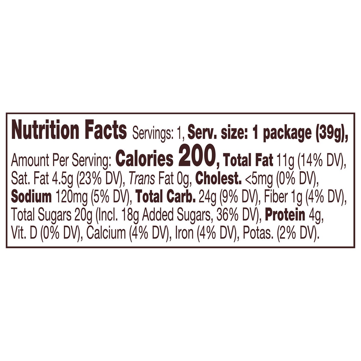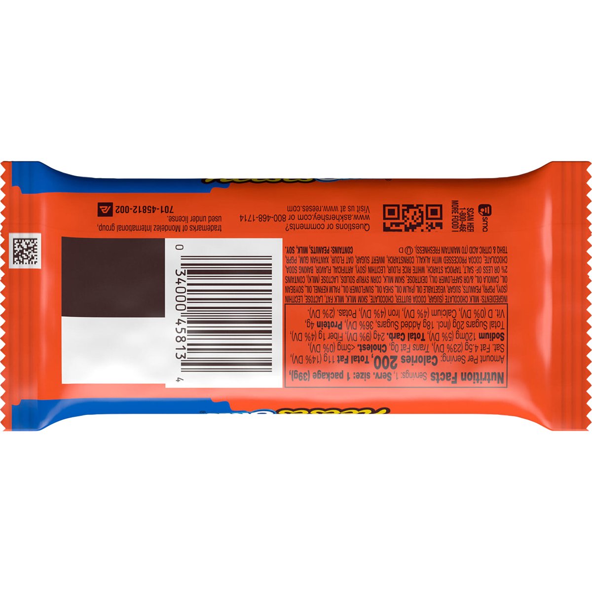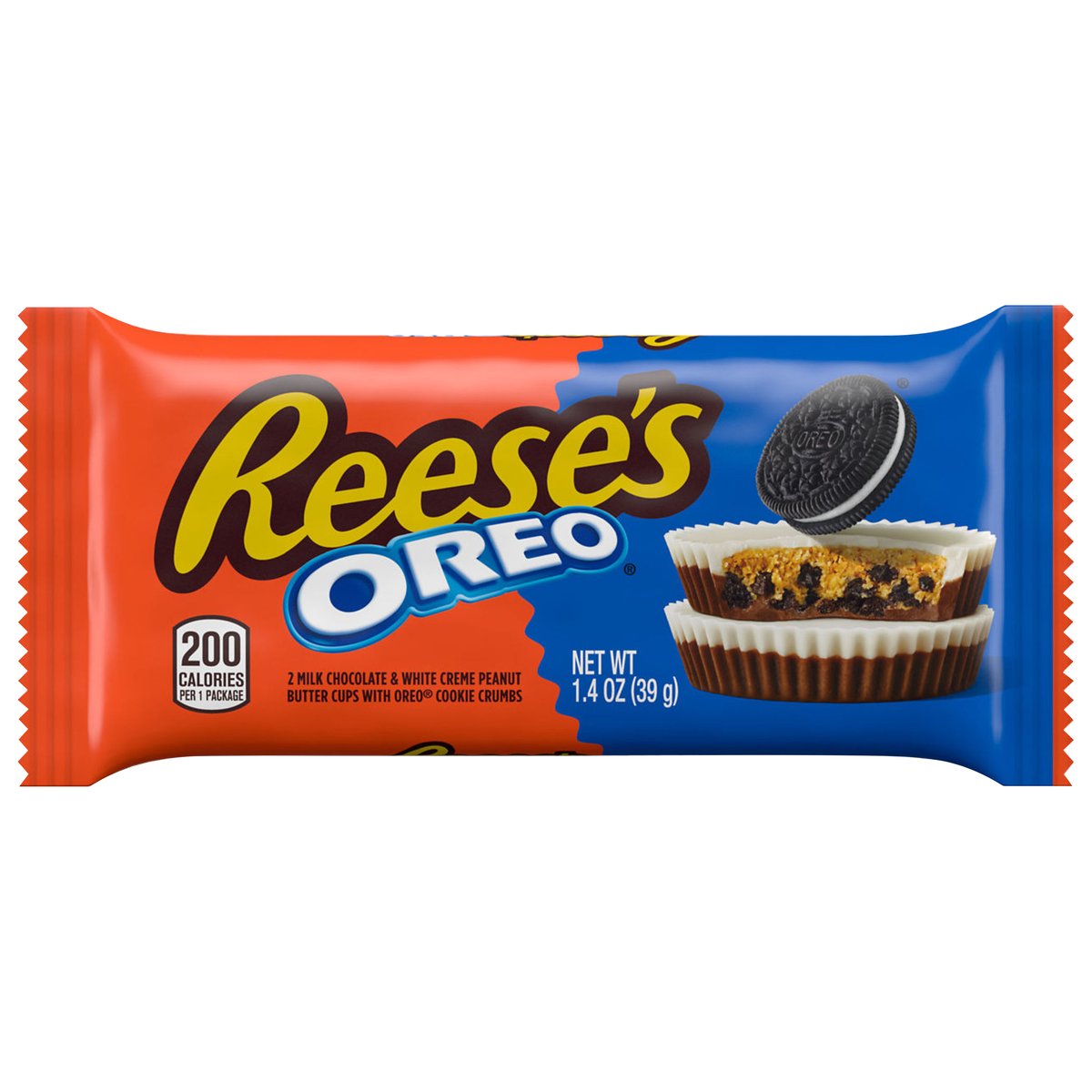 2 milk chocolate & white creme peanut butter cups with oreo cookie crumbs. 200 calories per 1 package. www.askhershey.com. www.reeses.com. SmartLabel: Scan or call 1-800-468-1714 for more food information. Questions or comments? www.askhershey.com or 800-468-1714. Visit us at www.reeses.com.