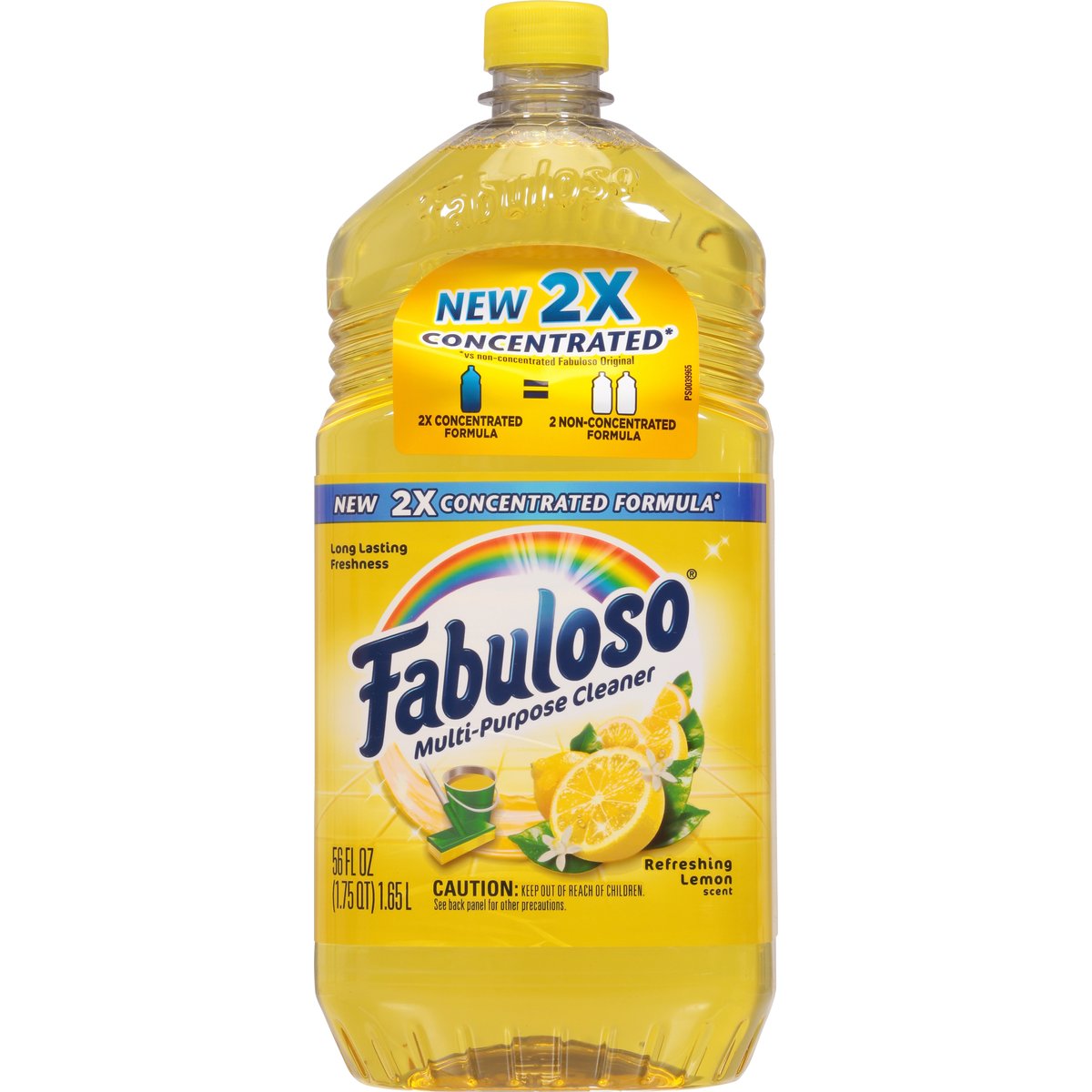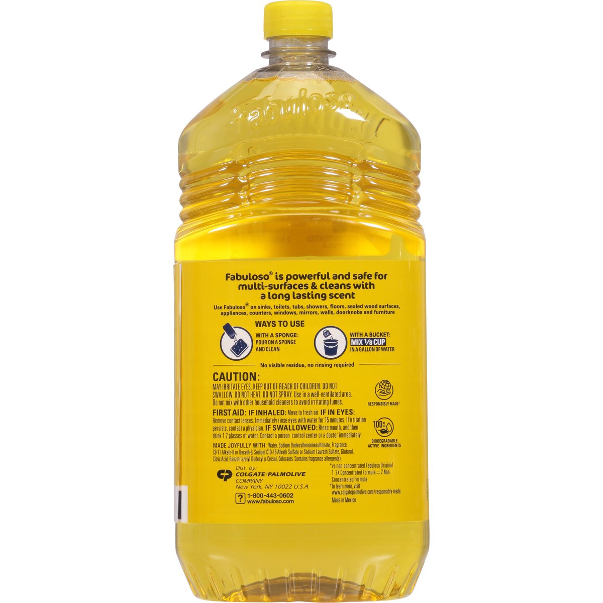 New 2x concentrated (vs non-concentrated Fabuloso Original 1 2x concentrated formula = 2 non-concentrated formula). New 2x concentrated formula (vs non-concentrated Fabuloso Original 1 2x concentrated formula = 2 non-concentrated formula). Long lasting freshness. No visible residue, no rinsing required. Fabuloso is powerful and safe for multi-surfaces & cleans with a long lasting scent. Use Fabuloso on sinks, toilets, tubs, showers, floors, sealed wood surfaces, appliances, counters, windows, mirrors, walls, doorknobs and furniture. 100% biodegradable active ingredients. www.fabuloso.com. www.colgate.com/savewater. how2recycle.info. Smartlabel: app enabled. Questions? 1-800-443-0602. www.fabuloso.com. Responsibly made (To learn more, visit www.colgatepalmolive.com/responsibly-made). 100% biodegradable active ingredients. Save Water. www.colgate.com/savewater. Made in Mexico.