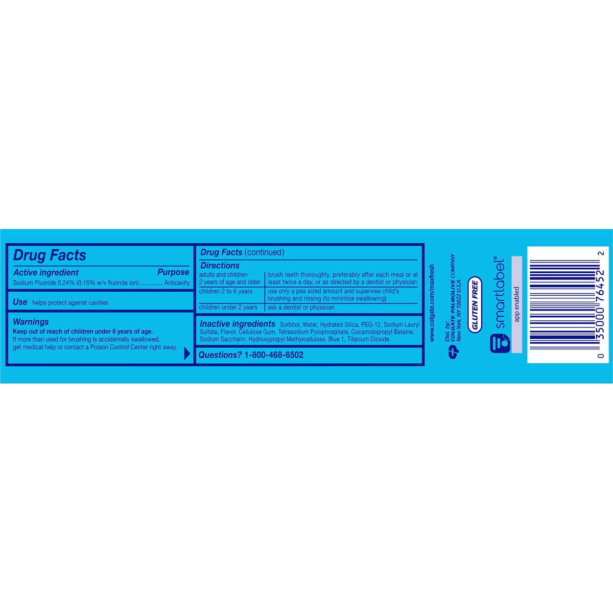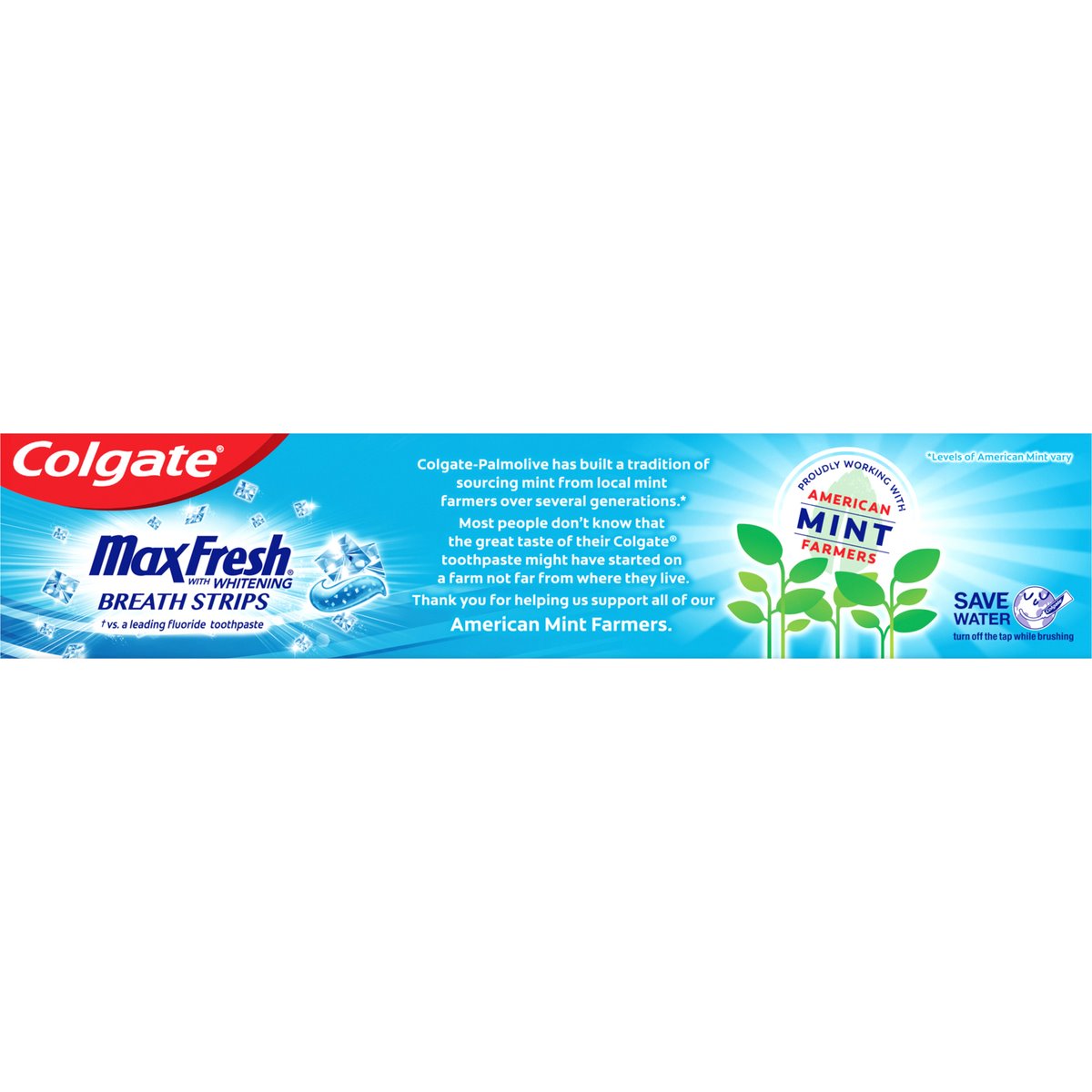 Anticavity fluoride toothpaste. Gluten free. 10x longer lasting cool(a). Max fresh with whitening breath strips. Colgate-Palmolive has built a tradition of sourcing mint from local mint farmers over several generations*. Most people don't know that the great taste of their Colgate toothpaste might have started on a farm not far from where they live. Thank you for helping us support all of our American mint farmers. Proudly working with American mint farmers. (a) vs. a leading fluoride toothpaste. * Levels of American mint vary. www.colgate.com/maxfresh. SmartLabel: App enabled. Questions? 1-800-468-6502. Thank you for helping us support all of our American mint farmers. Proudly working with American Mint Farmers. Save Water: Turn off the tap while brushing.