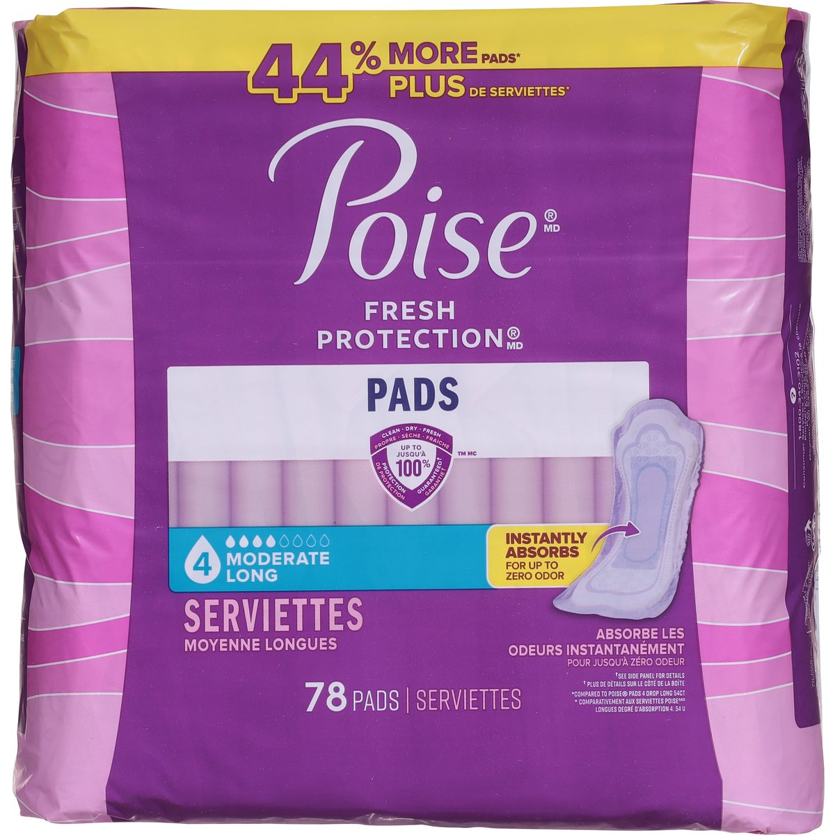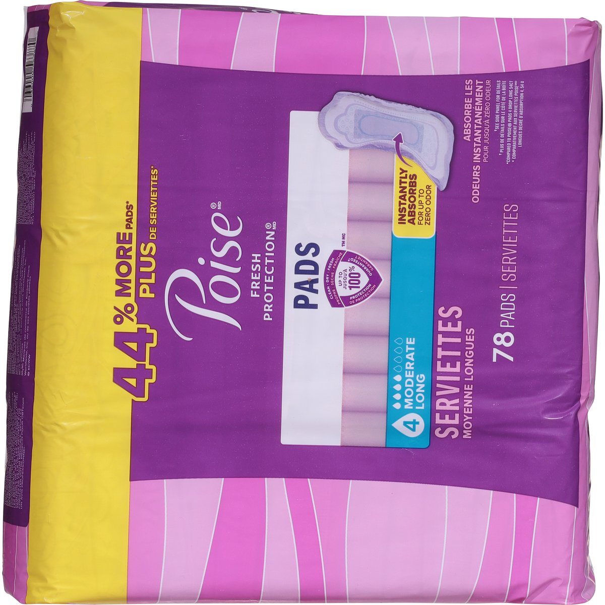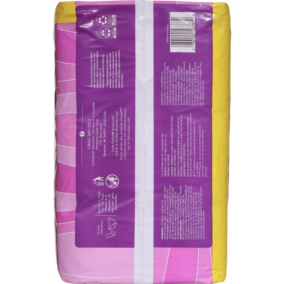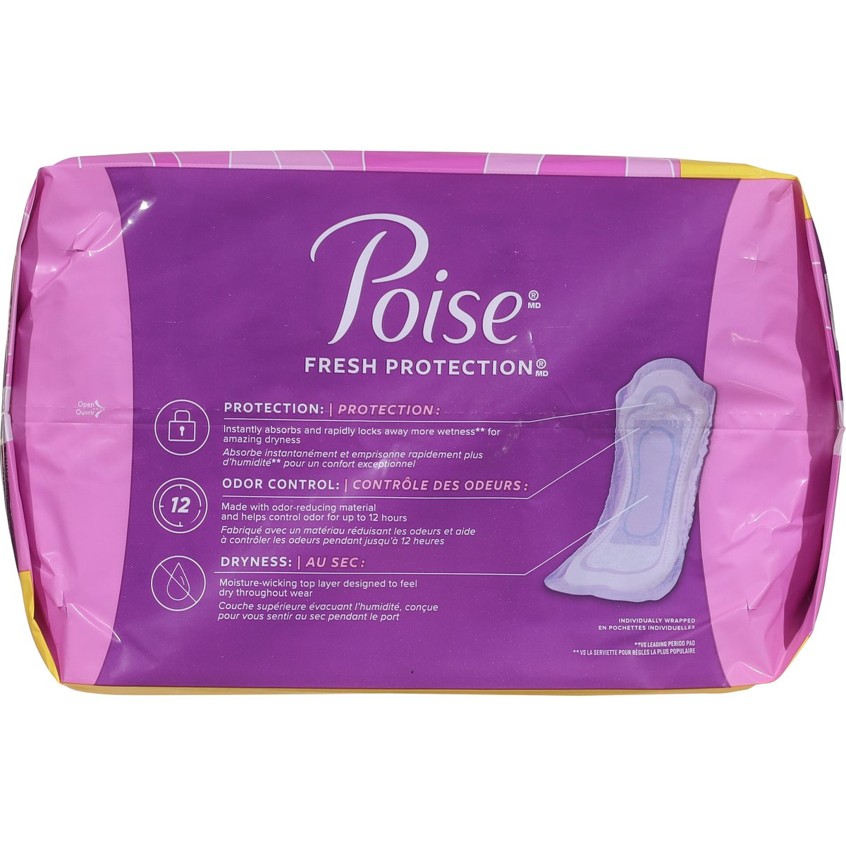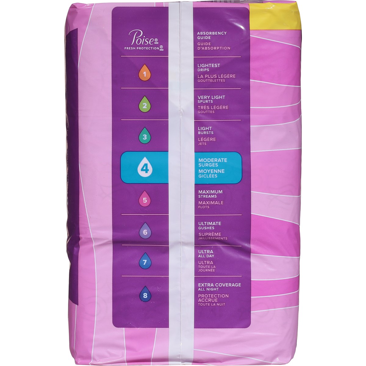 44% more pads*. Fresh protection. Clean. Dry. Fresh. Instantly absorbs. For up to zero odor. Protection: Instantly absorbs and rapidly locks away more wetness** for amazing dryness. Odor Control: Made with odor-reducing material and helps contorl odor for up to 12 hours. Dryness: Moisture-wicking top layer designed to feel dry throughout wear. Individually wrapped. Fresh Protection: Absorbency guide; lightest drips; very light spurts; light bursts; moderate surges; Maximum streams; ultimate gushes; ultra all day; extra coverage all night. * Compared to Poise Pads 5 drop long 39 ct. ** vs. leading period pad. Up to 100% protection guranteed(a). (a) Satisfaction Guaranteed or Your Money Back: Online access required. Limit i per household. Original receipt/upc required. Restrictions apply. See www.poise.com/guarantee for details. poise.com. how2recycle.info. ? 1-800-340-3102 Consumer Service: Kimberly-Clark Copr. P.O. Box 2020, Neenah, WI 54957-2020 USA. Love Poise products? Leave a review at poise.com. Discard in trash. Made in the USA from domestic and imported material.