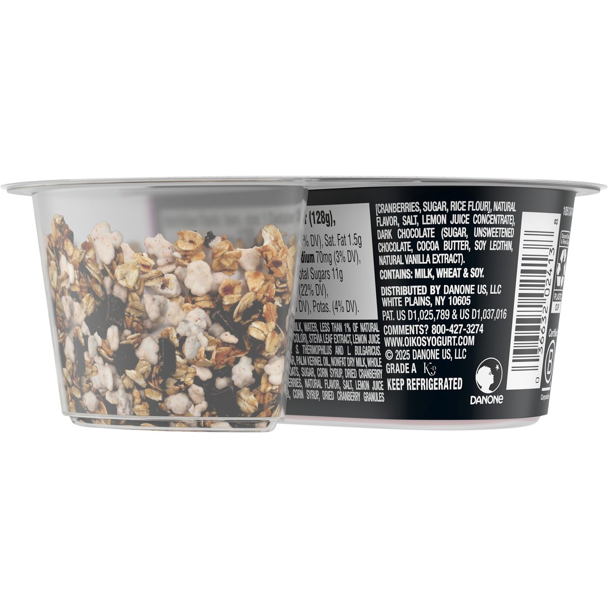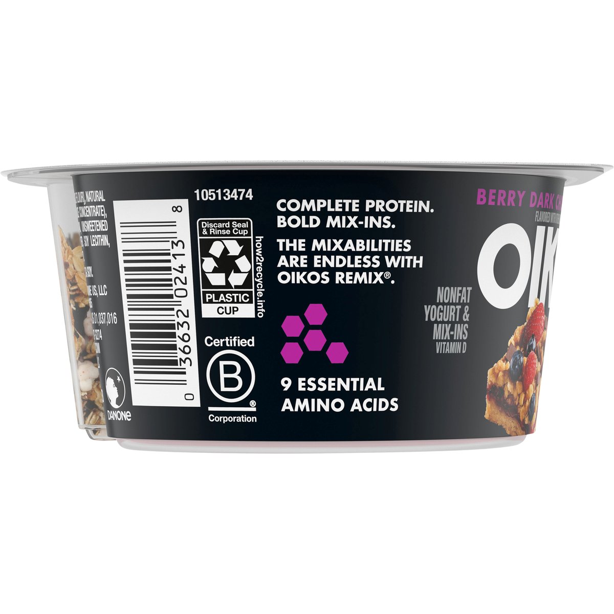 Mixed berry nonfat yogurt with white fudge coated berry granola & dark chocolate. Flavored with other natural flavors. 11 g protein. Vitamin D. 9 essential amino acids. Complete protein. Bold mix-ins. The mixabilities are endless with Oikos remix. Danone: Part of the Danone Family. Grade A. www.oikosyogurt.com. how2recycle.info. Comments? 800-427-3274. Certified B Corporation.