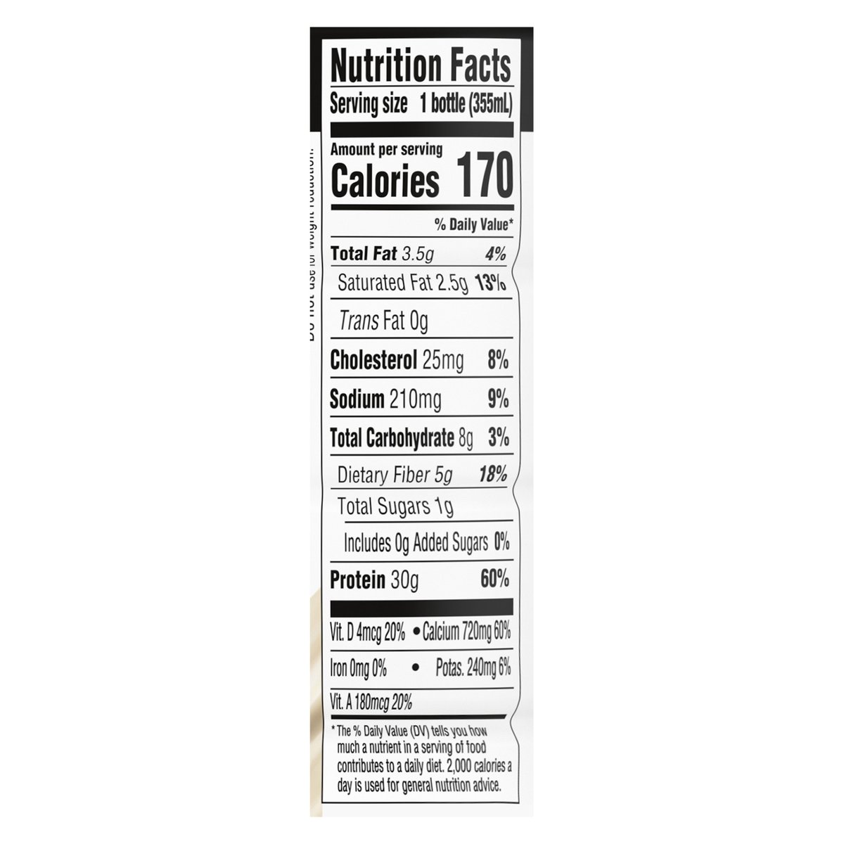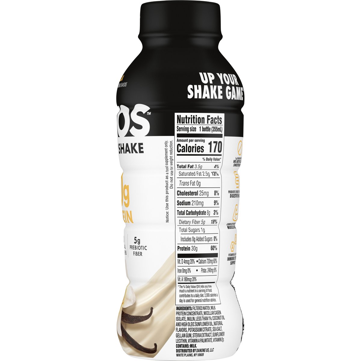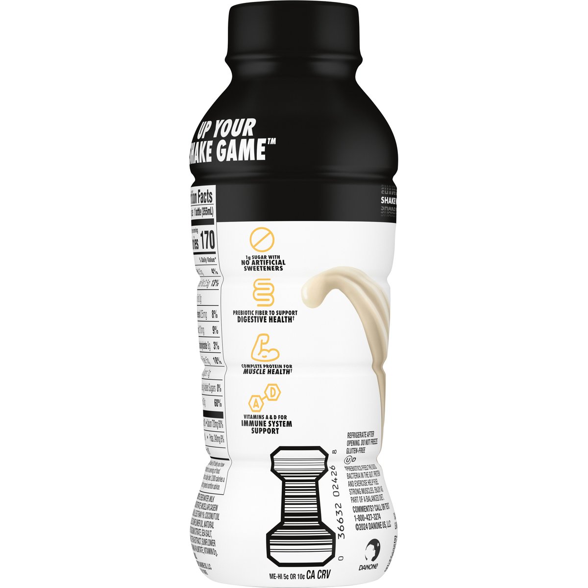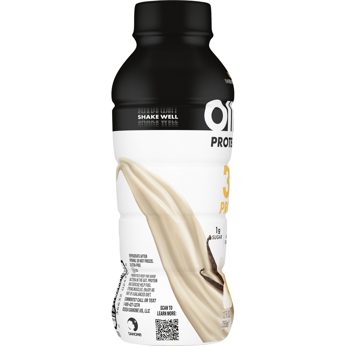 Flavored with other natural flavors. 30 g protein. 1 g sugar. 5 g prebiotic fiber. 1 g sugar with no artificial sweeteners. Gluten free. Vitamin A & D for immune system. No artificial sweeteners. Prebiotic fiber to support digestive health(a). Complete protein for muscle health(a). (a) Prebiotics feed to food bacteria in the gut. Protein and exercise help fuel strong muscles. Enjoy as part of a balanced diet. Scan to learn more. Comments? Call or text 1-800-427-3274.