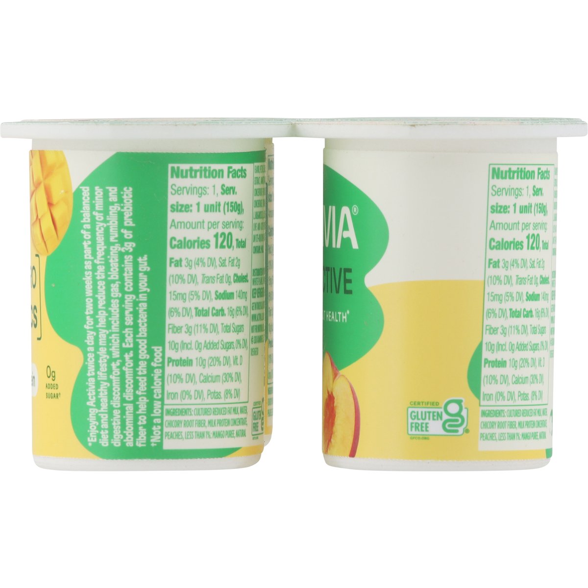 10 g protein. 0 g added sugar(a). (a) Not a low calorie food. Low fat yogurt. Certified gluten free. gfco.org. 2% milkfat. Vit. D added. Supports gut health*. Not for individual sale. * Enjoying Activia twice a day for two weeks as part of a balanced diet and healthy lifestyle may help reduce the frequency of minor digestive discomfort, which includes gas, bloating, rumbling, and abdominal discomfort. Each serving contains 3g of prebiotic fiber to help feed the good bacteria in your gut. Grade A. www.activia.us.com. how2recycle.info. Get in touch! Call or text 1-800-363-9184.