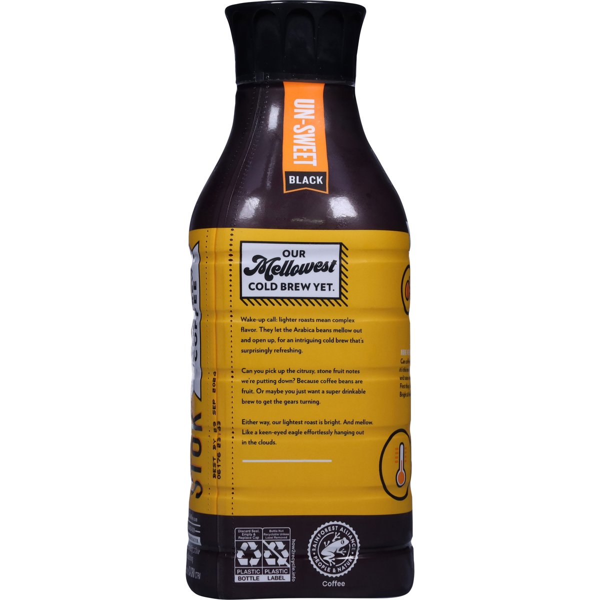 Bright & mellow. Approximately 150 mg caffeine per 12 oz serving. Un-sweet Black. Bright & mellow. Still bold. Our Mellowest Cold Brew Yet. Wake-up call: lighter roasts mean complex flavor. They let the Arabia beans mellow out and open up, for an intriguing cold brew that's surprisingly refreshing. Can you pick up the citrusy, stone fruit notes we’re putting down? Because coffee beans are fruit. Or maybe you just want a super drinkable brew to get the gears turning. Either way, our lightest roast is bright. And mellow. Like a keen-eyed eagle effortlessly hanging out in the clouds. Bright & mellow - never boring. Lighter Roast: A lighter roast lets flavors shine that darker roasts can overpower. Think vibrant. Bright. Full of character. Mellow? Yes. Boring? Never. More Refreshing: Can coffee be refreshing? It is when it’s this smooth. Take away bitterness and taste what coffee can do. First thing. After noon. Late night. Bright & mellow works. Still Bold: We brew it Low & Slow. Our light roast beans are steeped for 10 slow hours for a mellow taste that still leads with a coffee kick. www.SToKBrew.com. how2recycle.info. 1-866-234-4319. Rainforest Alliance People & Nature. Coffee.
