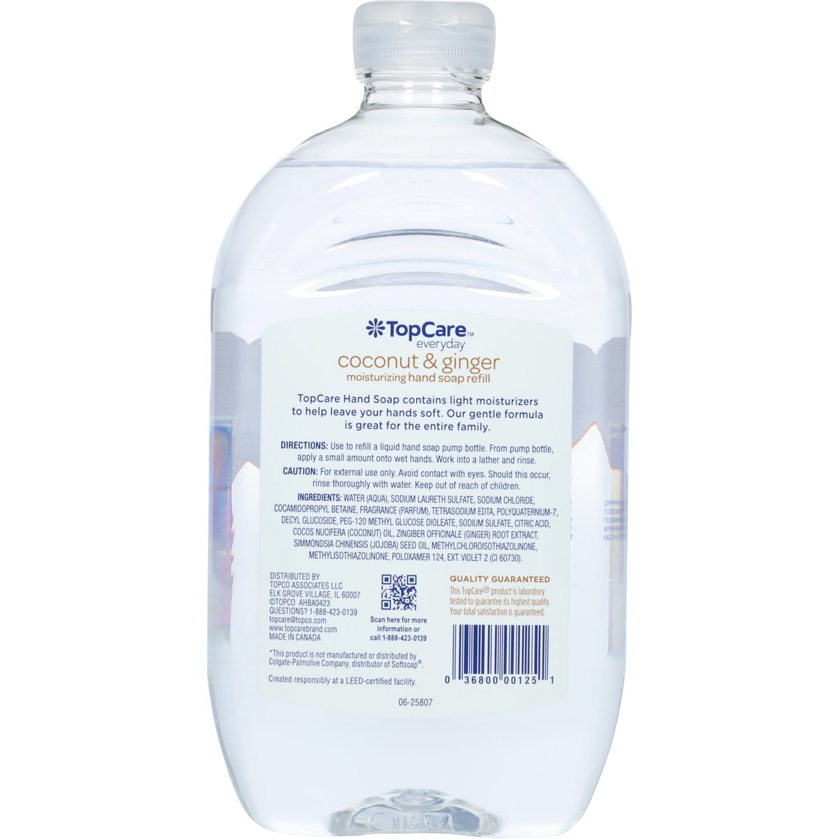 Compare to Softsoap Coconut & Warm Ginger Hand Soap (This product is not manufactured or distributed by Colgate-Palmolive Company, distributor of Softsoap). TopCare Hand Soap contains light moisturizers to help leave your hands soft. Our gentle formula is great for the entire family. Quality Guaranteed: This TopCare product is laboratory tested to guarantee its highest quality. Your total satisfaction is guaranteed. www.topcarebrand.com. Scan for more information or call 1-888-423-0139. Questions? 1-888-423-0139. topcare(at)topco.com. www.topcarebrand.com. Created responsibly at a LEED-certified facility. Made in Canada.