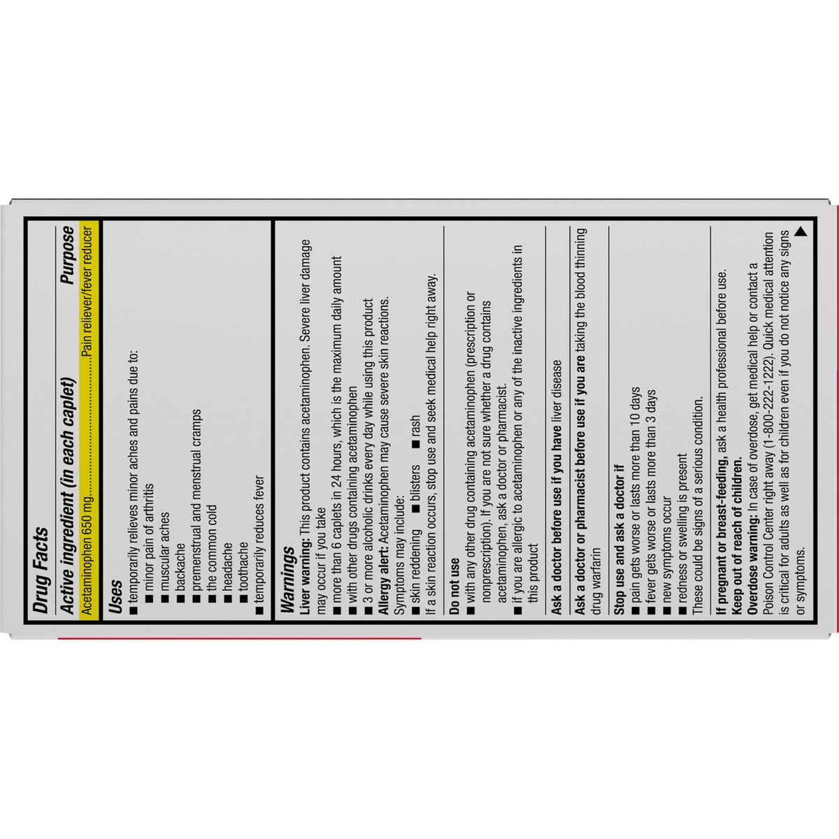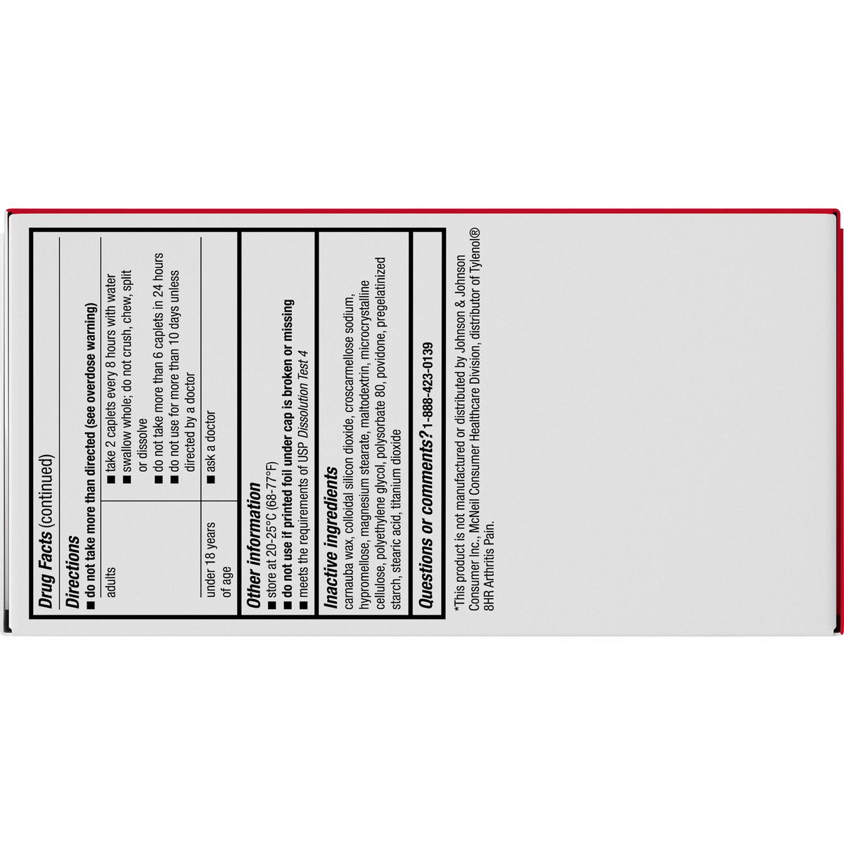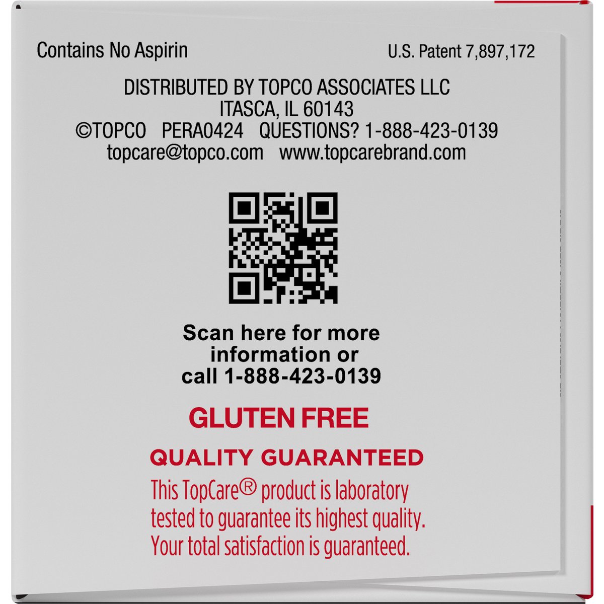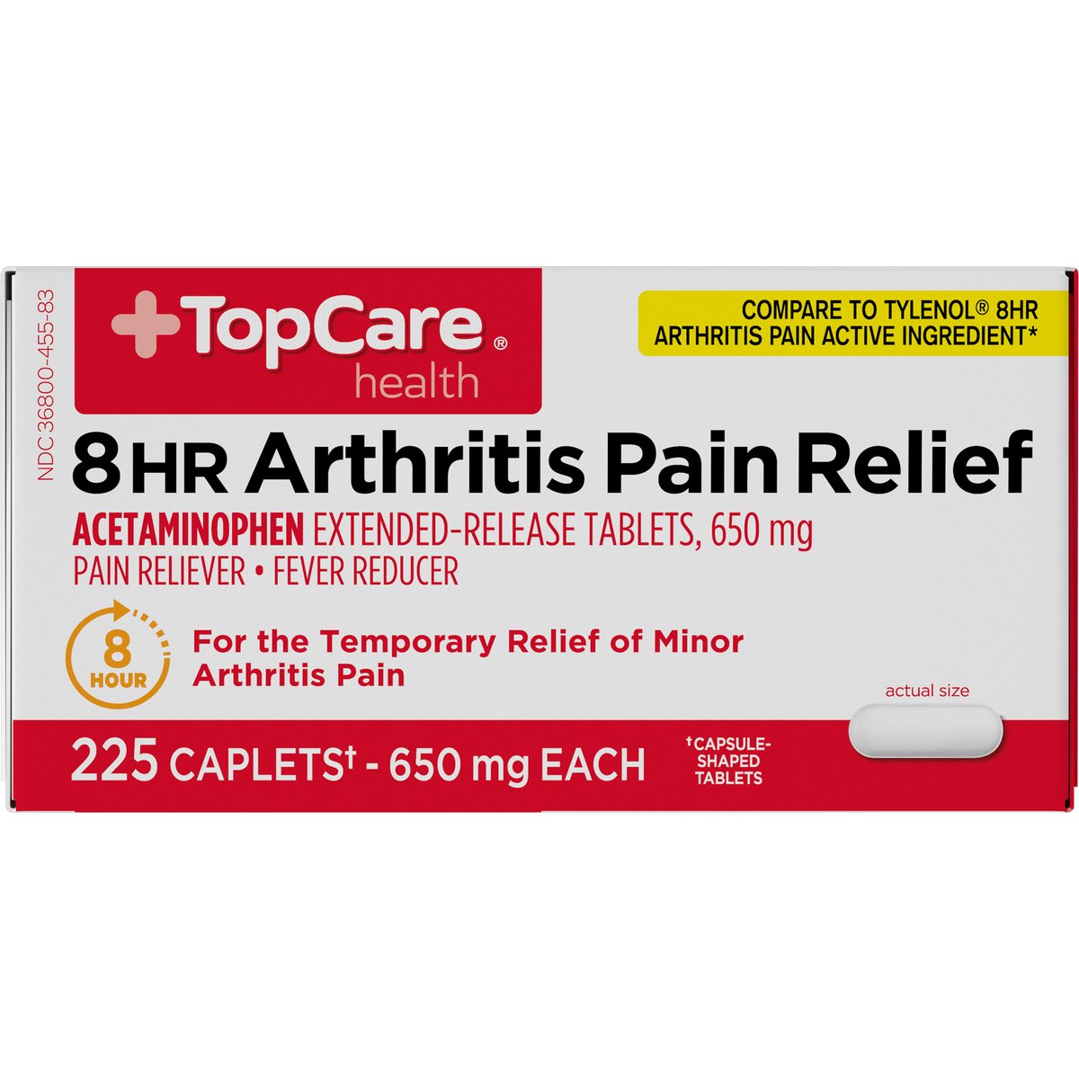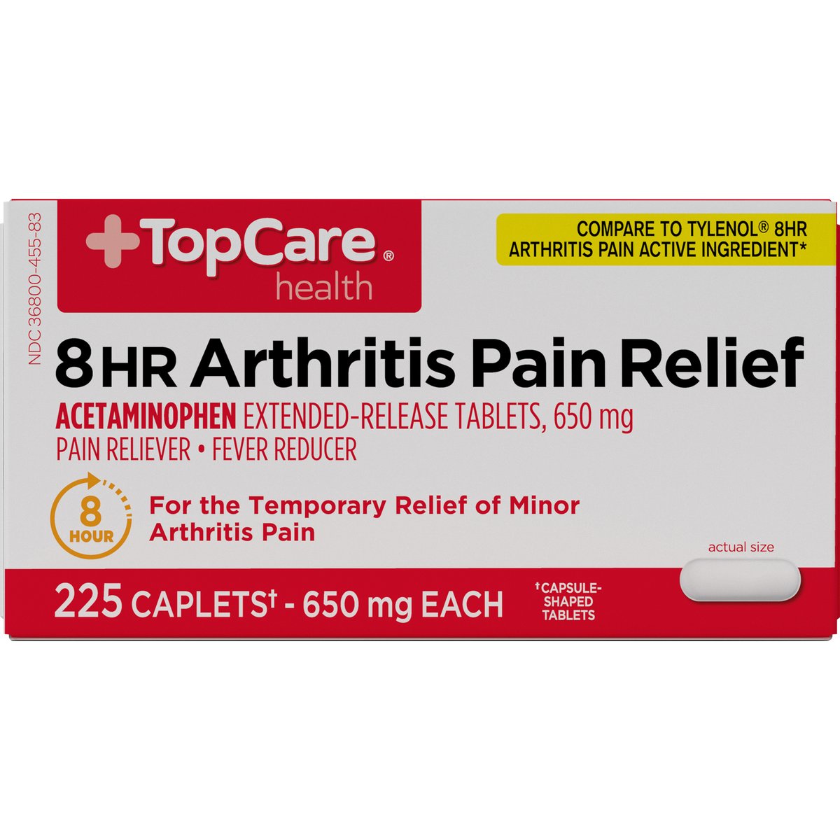 Acetaminophen extended-release tablets, 650 mg. Pain reliever. Fever reducer. Gluten free. Compare to Tylenol 8hr Arthritis Pain active ingredient (This product is not manufactured or distributed by Johnson & Johnson Consumer Inc., McNeil Consumer Healthcare Division, distributor of Tylenol 8hr Arthritis Pain). 8 hour. For the temporary relief of minor arthritis pain. 225 caplets (capsule shaped tablets) - 650 mg each. Contains no aspirin. Quality Guaranteed: This TopCare product is laboratory tested to guarantee its highest quality. Your total satisfaction is guaranteed. www.topcarebrand.com. Scan for more information or call 1-888-423-0139. Questions? 1-888-423-0139. topcare(at)topco.com. Questions or Comments? 1-888-423-0139.