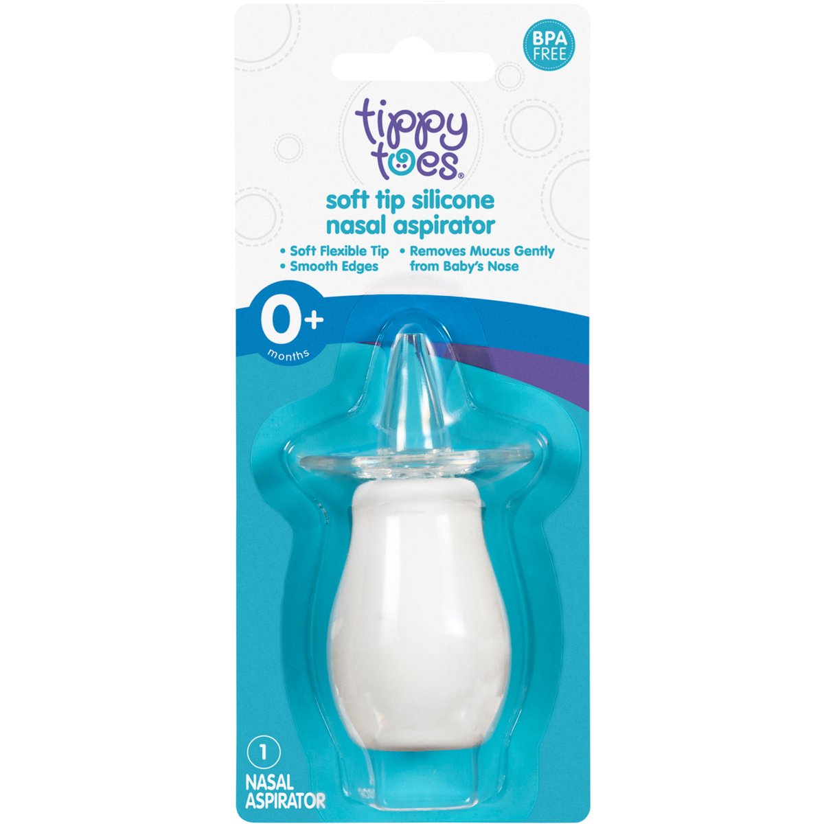 0+ months. Soft flexible tip. Smooth edges. Removes mucus gently from baby's nose. From feeding bottles to changing mats, Tippy Toes is there for every stage of your baby's growth. Our baby accessories are designed to make caring for your little one as easy as possible. And they're gentle on baby and your wallet, to keep you both comfortable through it all. The Nasal Aspirator cleans mucus gently from your child's nose. The aspirator features smooth edges for added safety and is made of non-toxic materials. Safe and effective for newborns and infants. Easy to clean. Quality Guaranteed: If for any reason you are not satisfied, we'll give you a full refund. tippytoesbrand.com. Scan for more information or call 1-888-423-0139. 1-888-423-0139. BPA free. Made in Thailand.