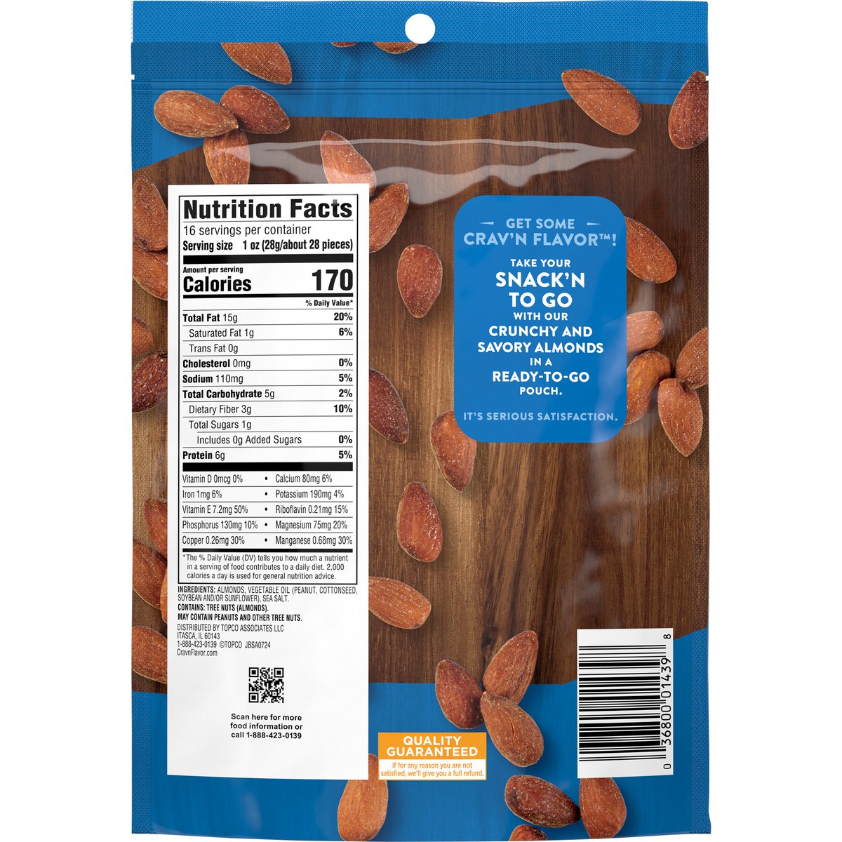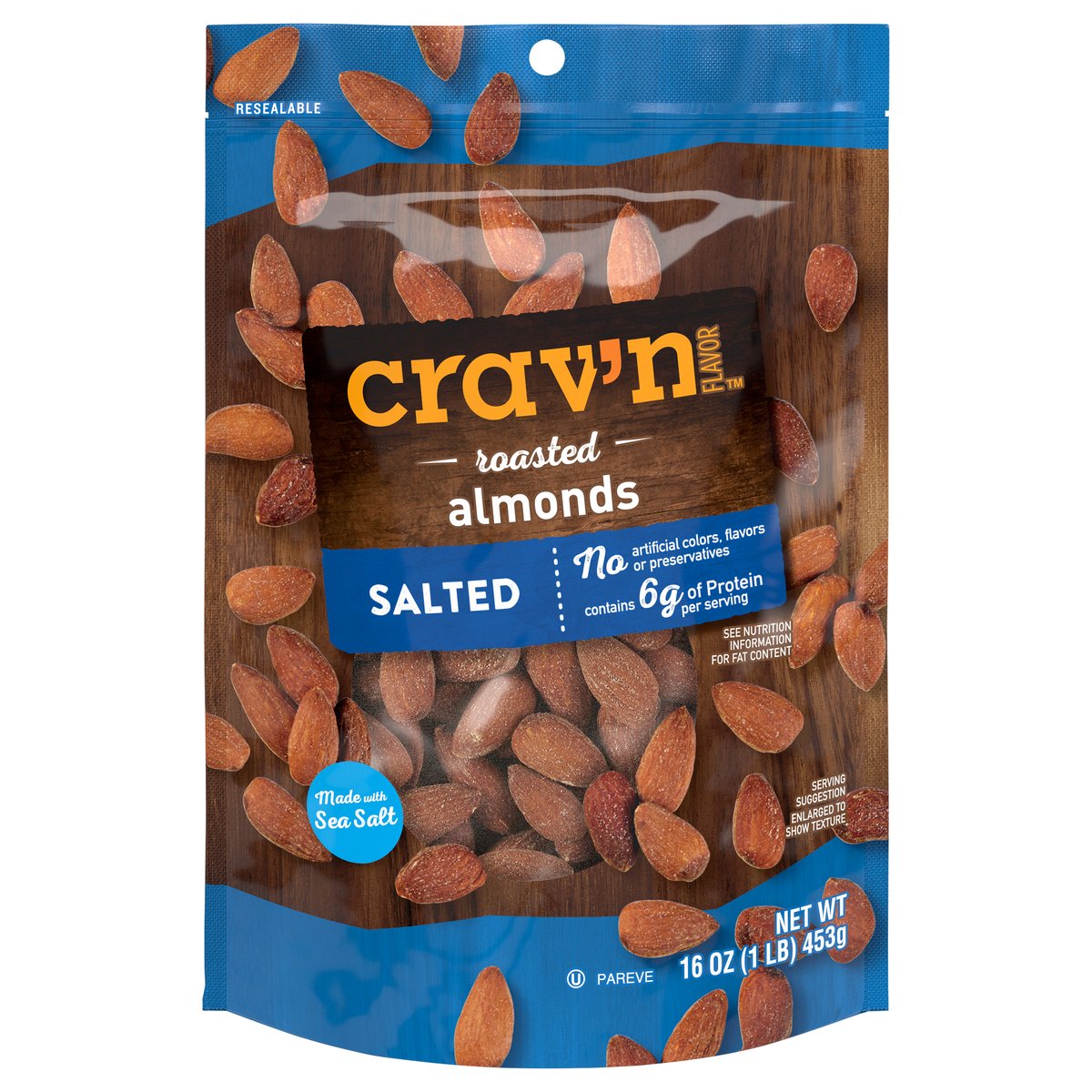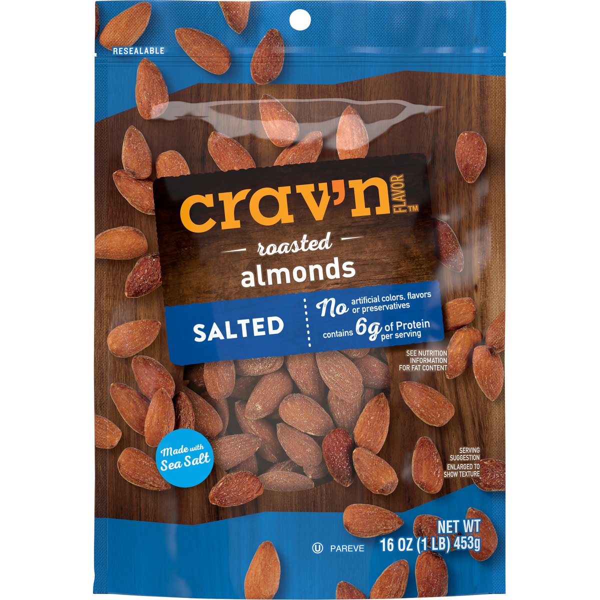 No artificial colors, flavors or preservatives. Contains 6 g of protein per serving. See nutrition information for fat content. Get some Crav'n Flavor! Take your snack'n to go with our crunchy and savory almonds in a ready-to-go pouch. It's serious satisfaction. Quality Guaranteed: If for any reason you are not satisfied, we'll give you a full refund. CravnFlavor.com. Scan for more food information or call 1-888-423-0139. 1-888-423-0139. Resealable.