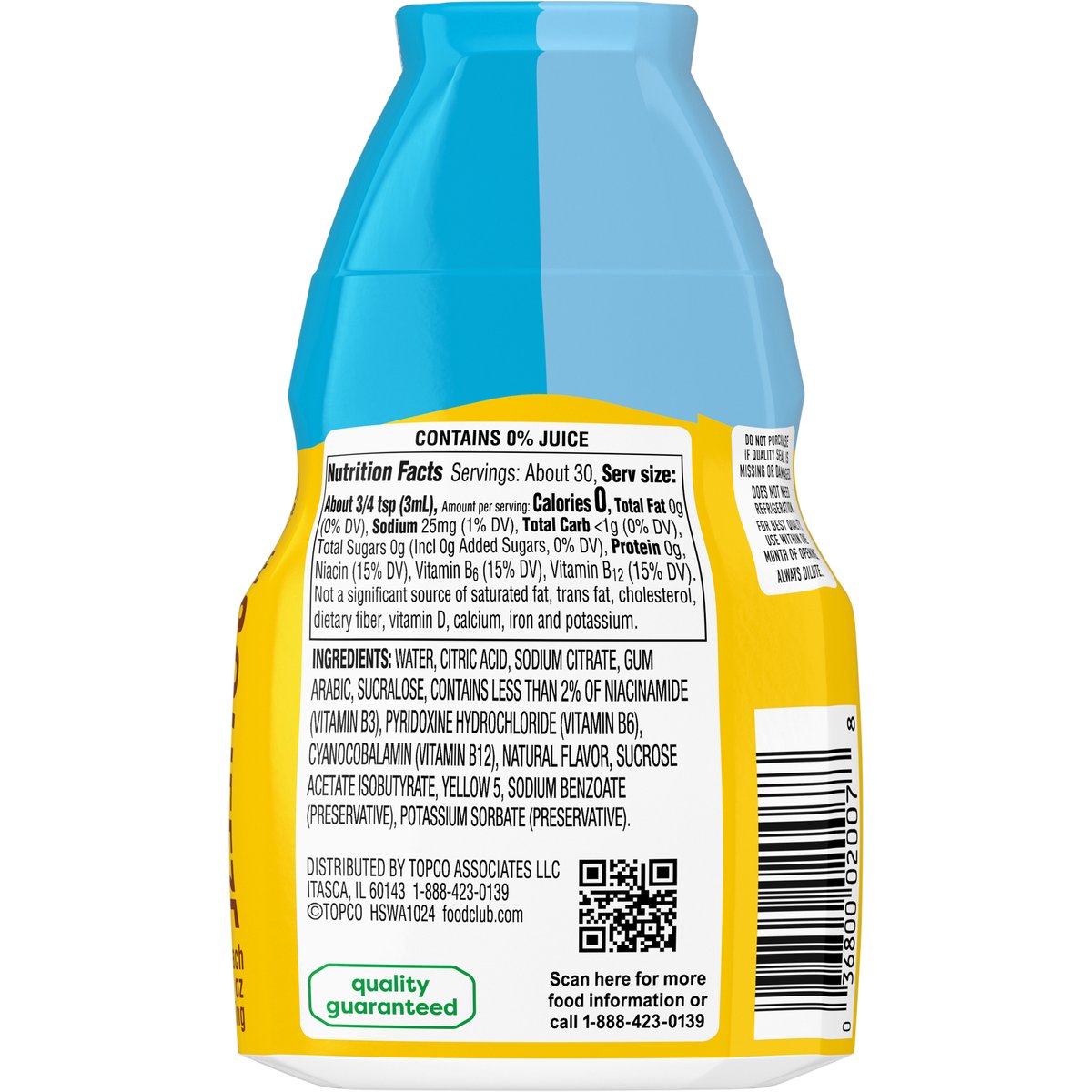 Natural flavor. Liquid beverage enhancer with other natural flavors. 0 calories per 3/4 tsp. Zero sugar. Always dilute. One squeeze for each 12 fl oz serving. Quality guaranteed. foodclub.com. Scan for more food information or call 1-888-423-0139. 1-888-423-0139.