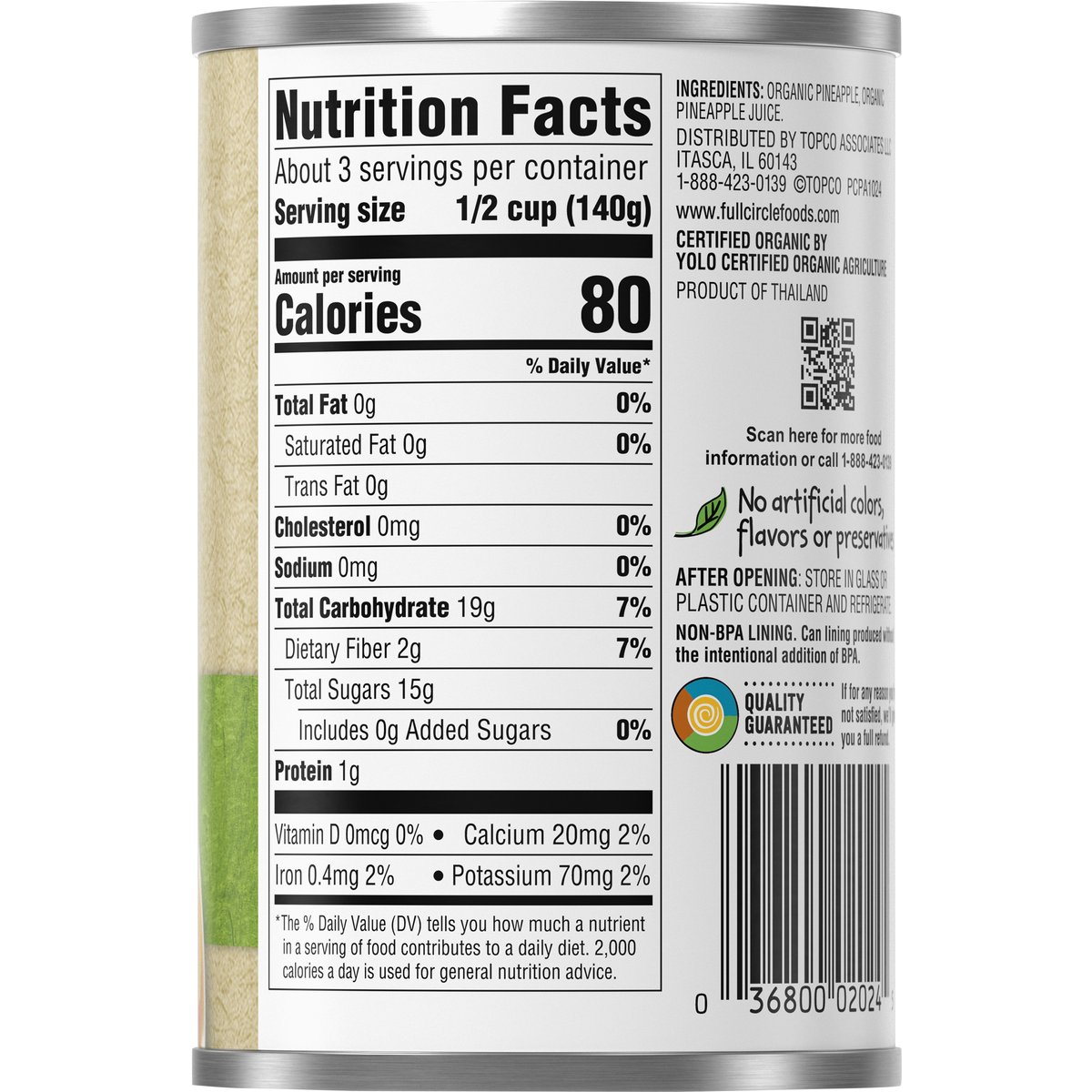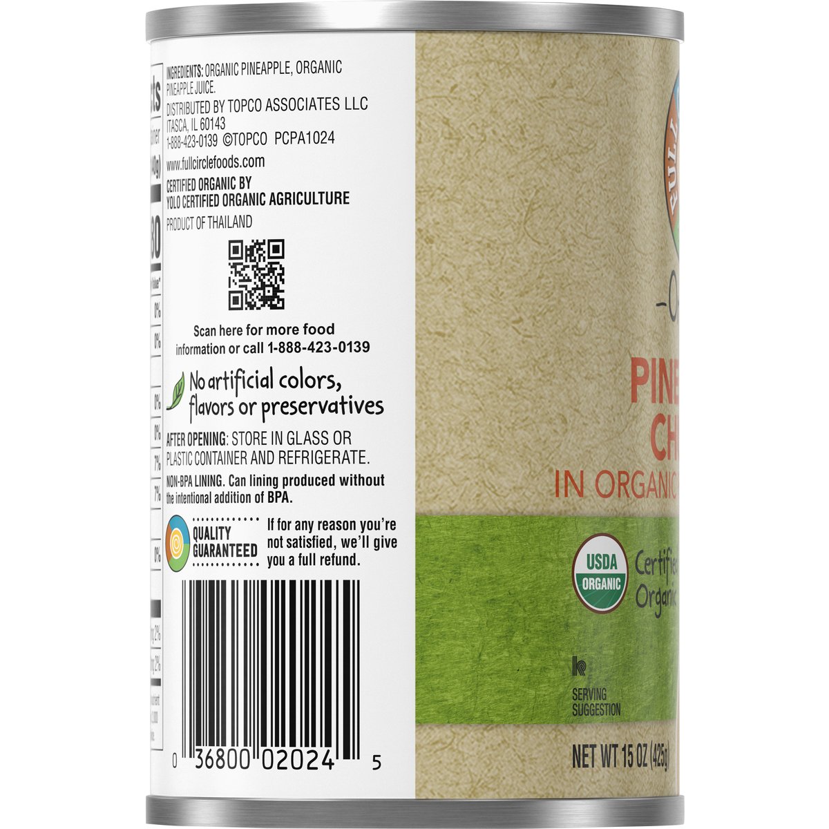 Pineapple chunks in organic pineapple juice. No artificial colors, flavors or preservatives. USDA Organic. Certified Organic. Certified Organic by YOLO Certified Organic Agriculture. In season year round. Quality Guaranteed: If for any reason you are not satisfied, we'll give you a full refund. www.fullcirclefoods.com. Scan for more food information or call 1-888-423-0139. 1-888-423-0139. Non-BPA lining. Can lining produced without the intentional addition of BPA. Product of Thailand.