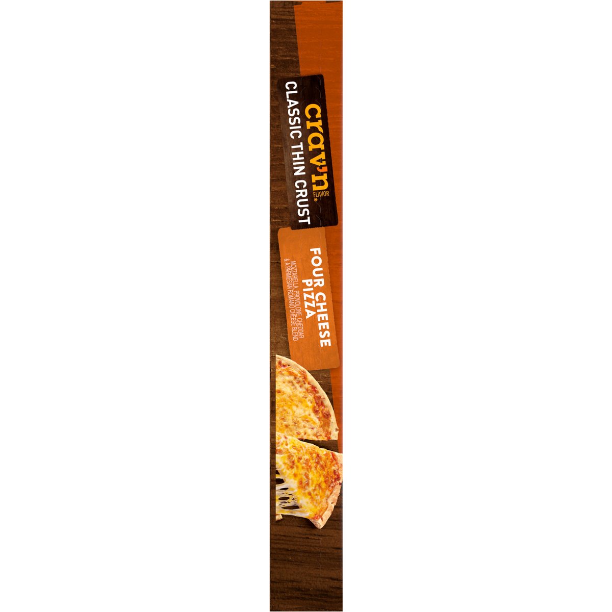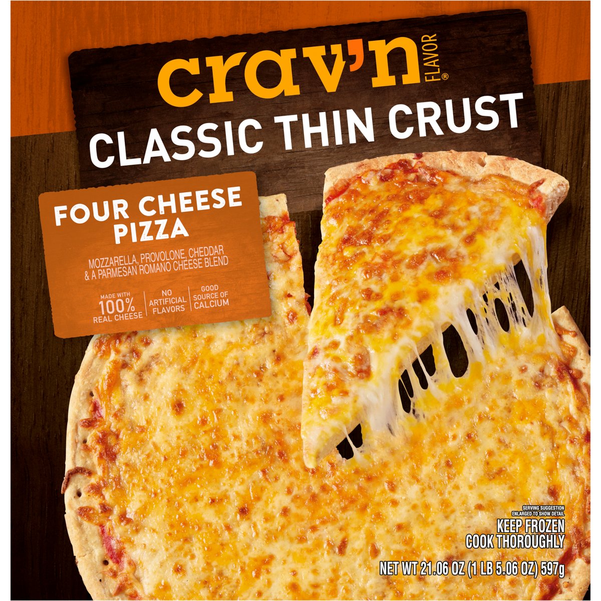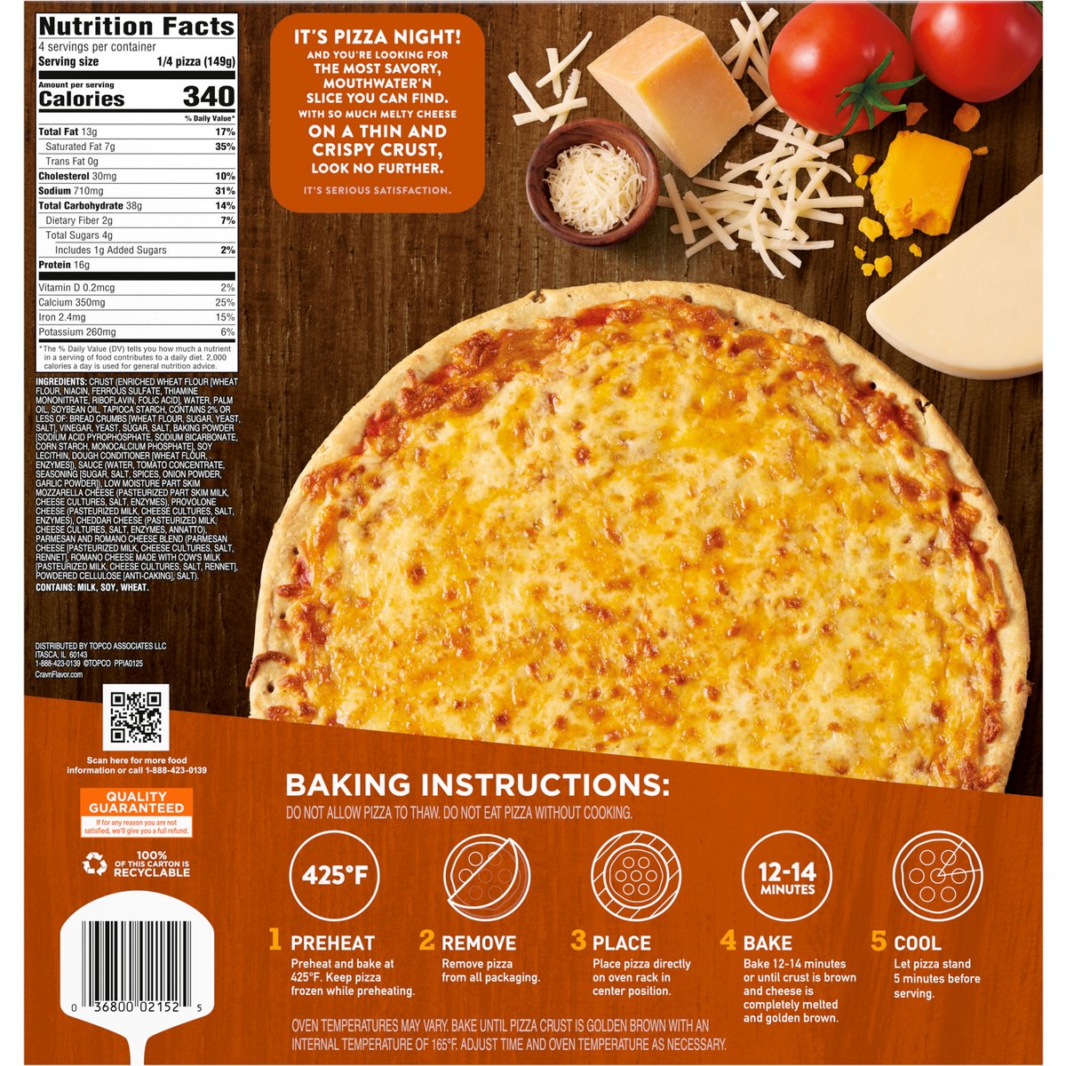 Mozzarella, provolone, cheddar & a Parmesan Romano cheese blend. No artificial flavors. Good source of calcium. It's pizza night! And you're looking for the most savory, mouthwater'n slice you can find. With so much melty cheese on a thin and crispy crust, look no further. It's serious satisfaction. Quality Guaranteed: If for any reason you are not satisfied, we'll give you a full refund. CravnFlavor.com. Scan for more food information or call 1-888-423-0139. 1-888-423-0139. 100% of this carton is recyclable.