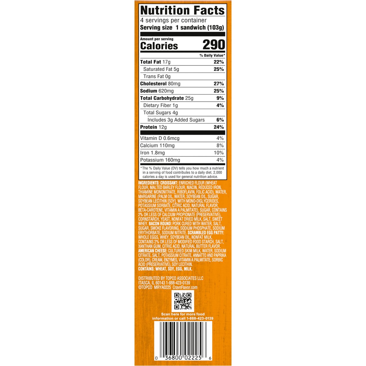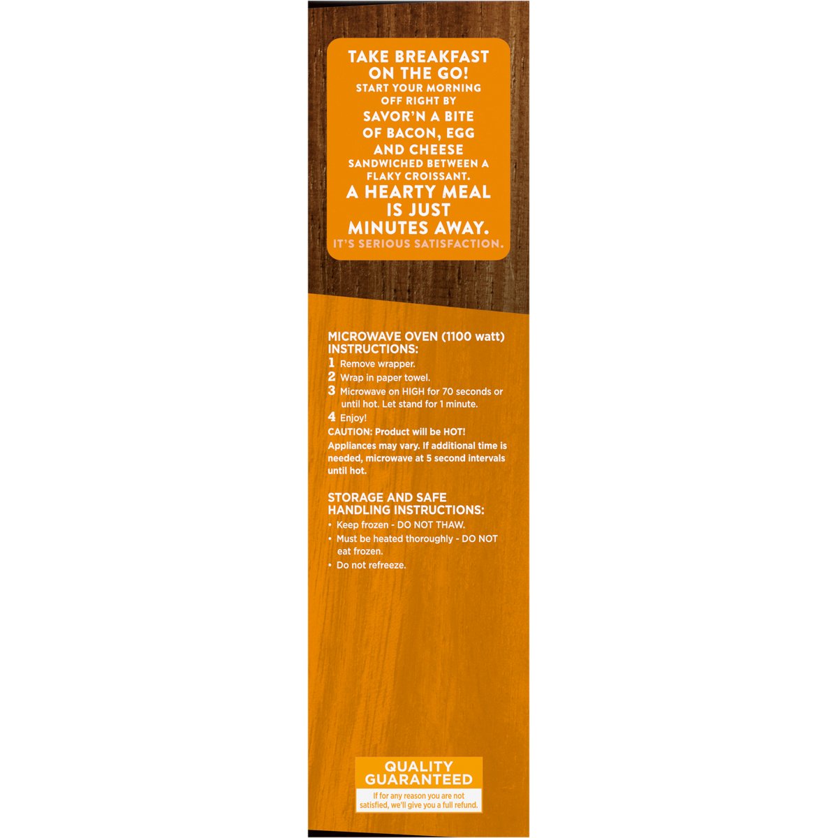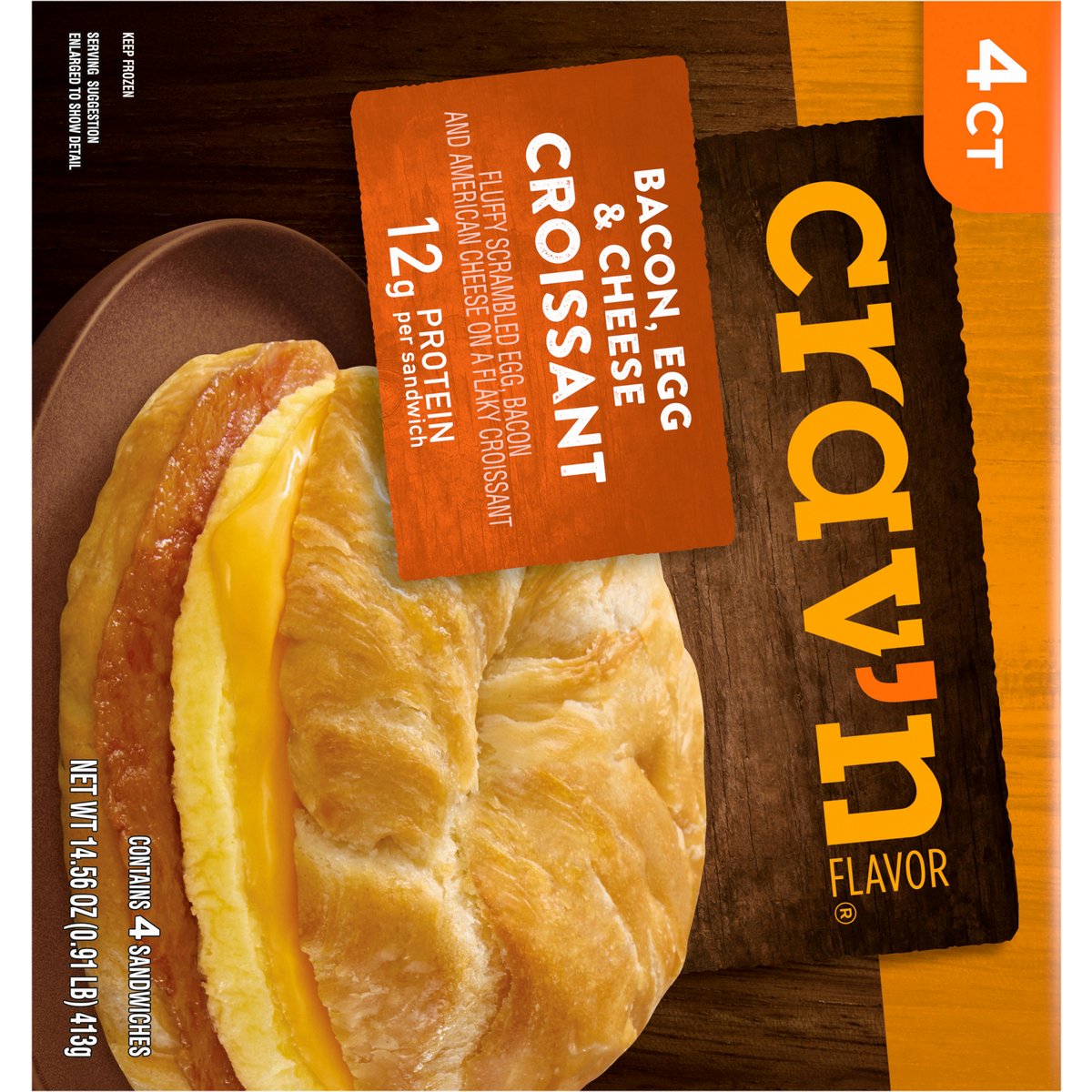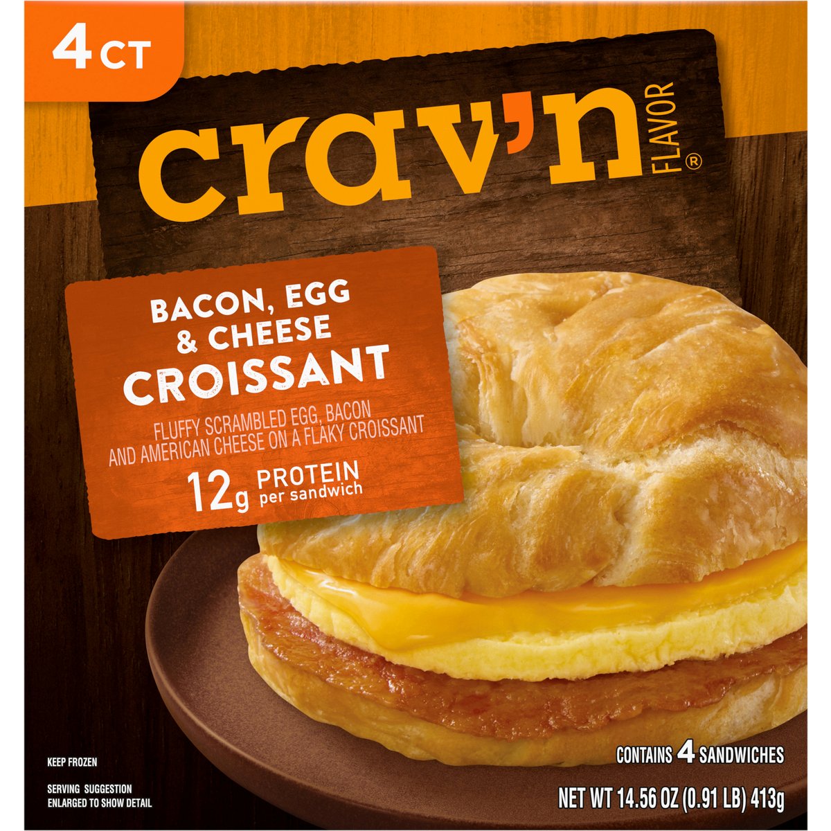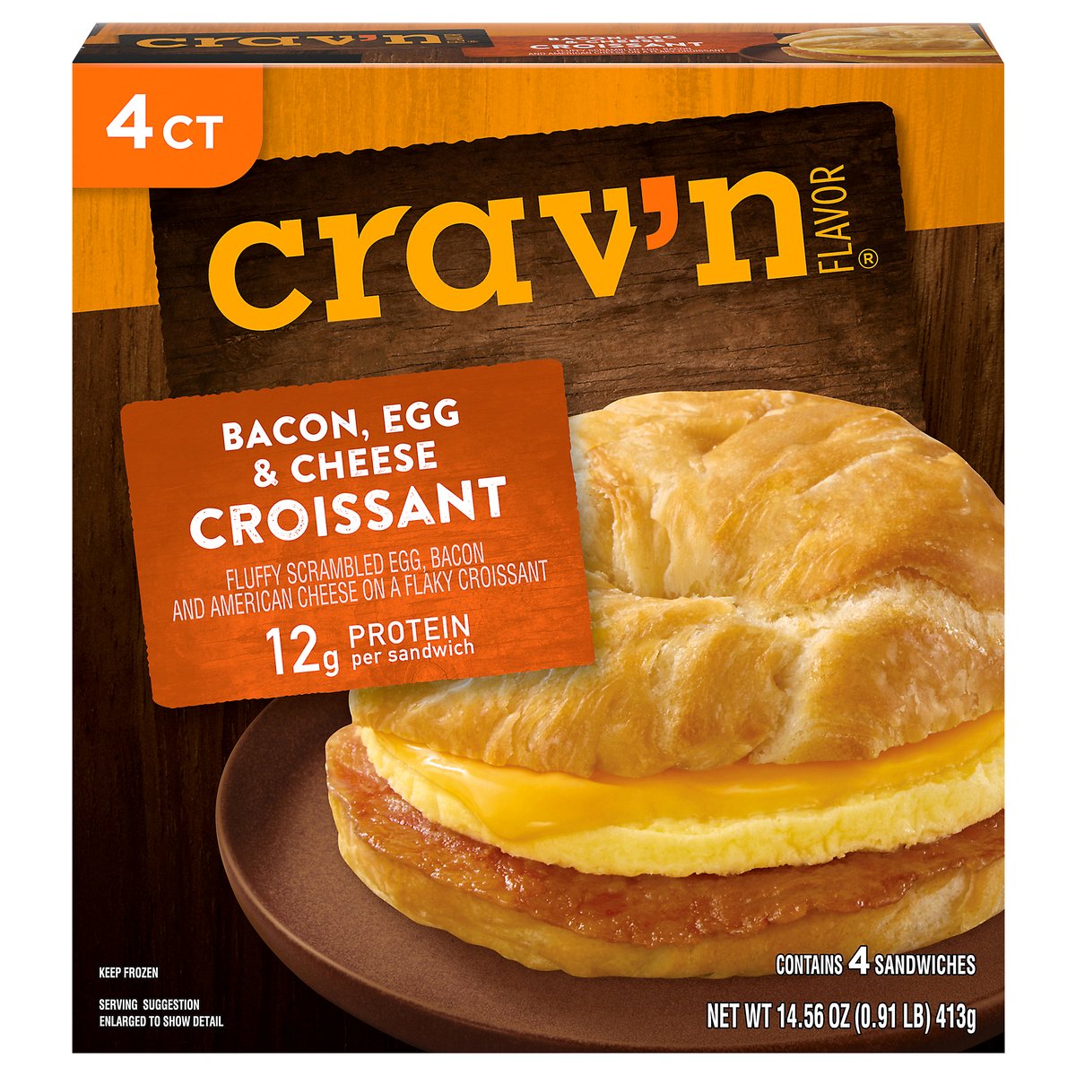 Fluffy scrambled egg, bacon and American cheese on a flaky croissant. 12 g protein per sandwich. Contains 4 sandwiches. Take breakfast on the go! Start your morning off right by savor'n a bite of bacon, egg and cheese sandwiched between a flaky croissant. A hearty meal is just minutes away. It's serious satisfaction. Quality Guaranteed: If for any reason you are not satisfied, we'll give you a full refund. CravnFlavor.com. Scan for more food information or call 1-888-423-0139.