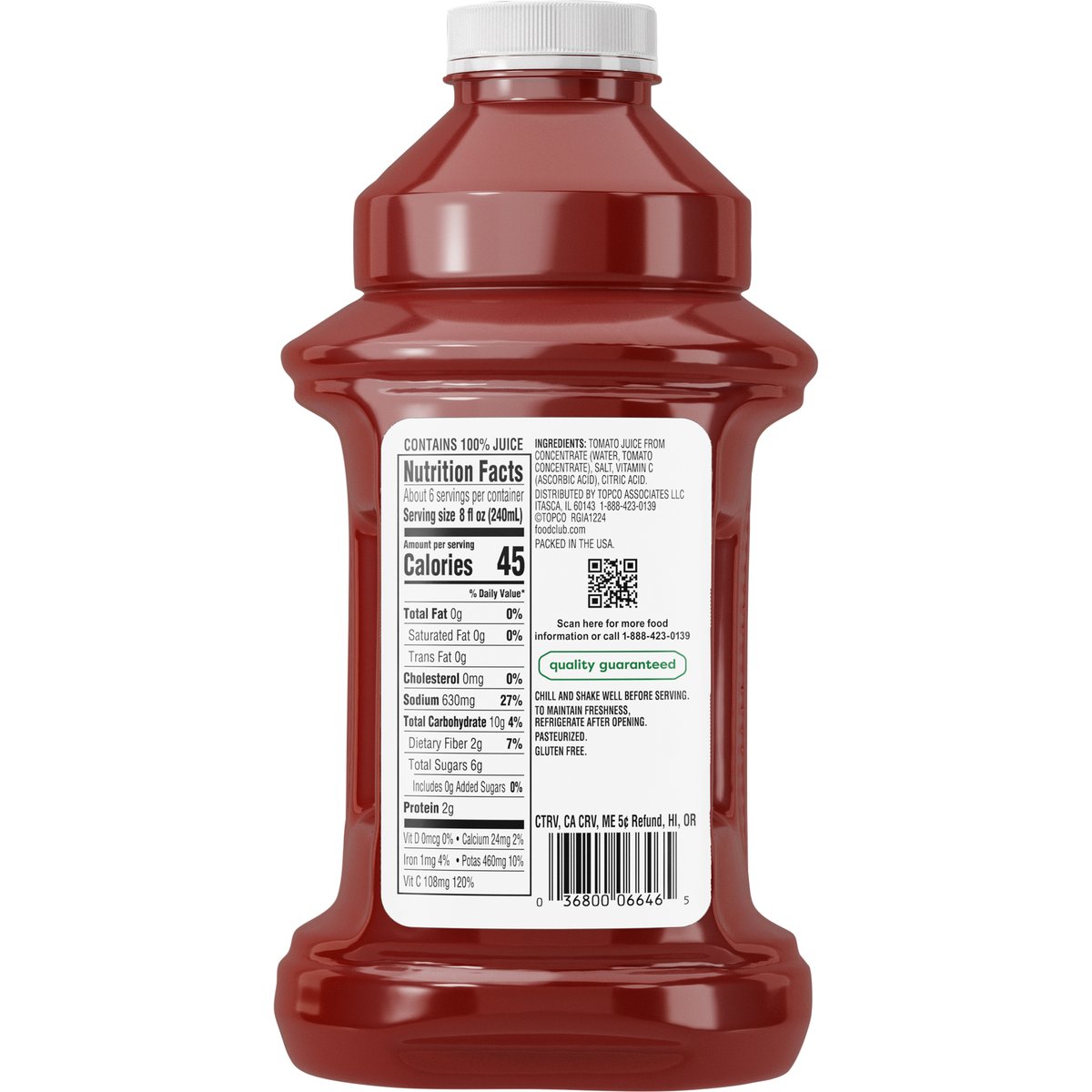 100% juice from concentrate with added ingredients. 120% vitamin C daily value per serving. Gluten free. See nutrition information for sodium content. Non GMO. Pasteurized. Quality guaranteed. foodclub.com. Scan for more food information or call 1-888-423-0139. 1-888-423-0139. Packed in the USA.
