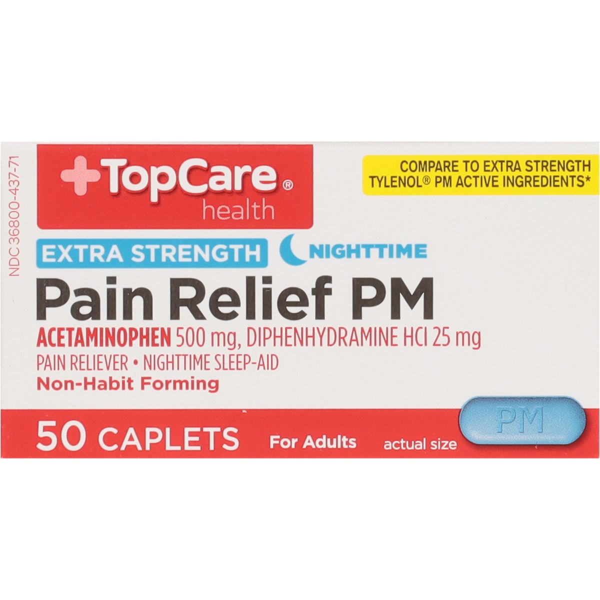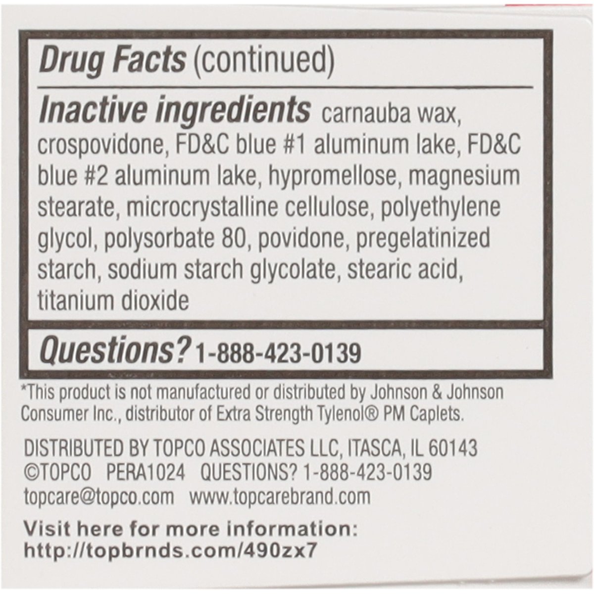 For adults. Acetaminophen 500 mg, diphenhydramine HCl 25 mg. Pain reliever. Nighttime sleep-aid. Compare to Extra Strength Tylenol PM active ingredients*. Non-habit forming. *This product is not manufactured or distributed by Johnson & Johnson Consumer Inc., distributor of Extra Strength Tylenol PM Caplets. www.topcarebrand.com. Questions? 1-888-423-0139; topcare@topco.com; www.topcarebrand.com. Visit for more information: http://topbrnds.com/490zx7.