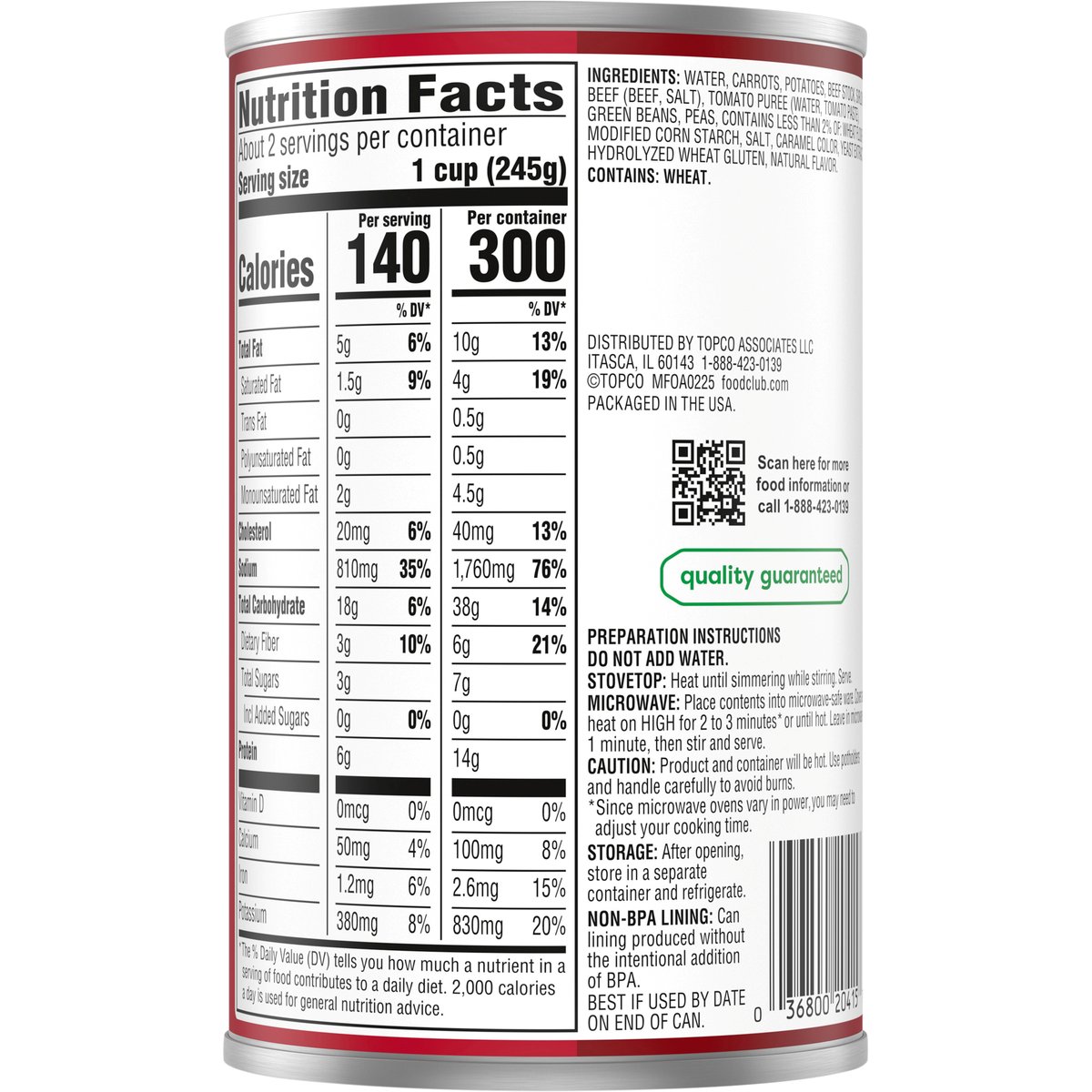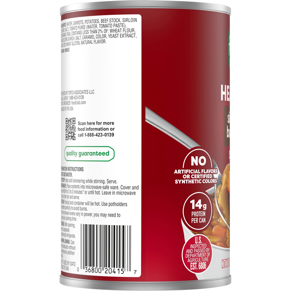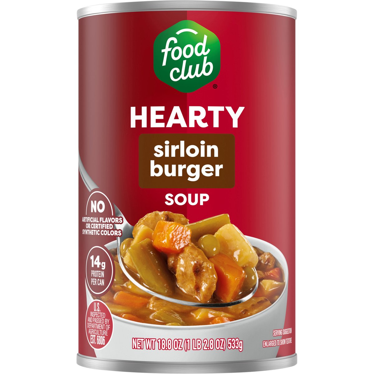 No artificial flavors or certified synthetic colors. 14 g of protein per container. Add flavor to life. Since 1945. Quality Guaranteed: 100% satisfaction or double your money back. U.S. inspected and passed by Department of Agriculture. www.foodclubbrand.com. Scan for more food information or call 1-888-423-0139. The lining of this can was produced without BPA. Please recycle. Packed in USA.