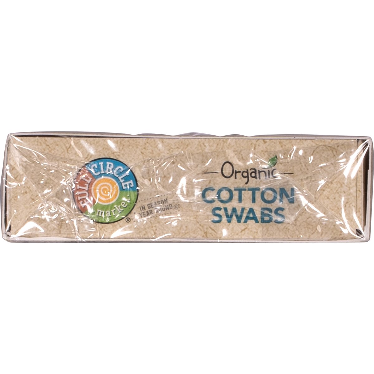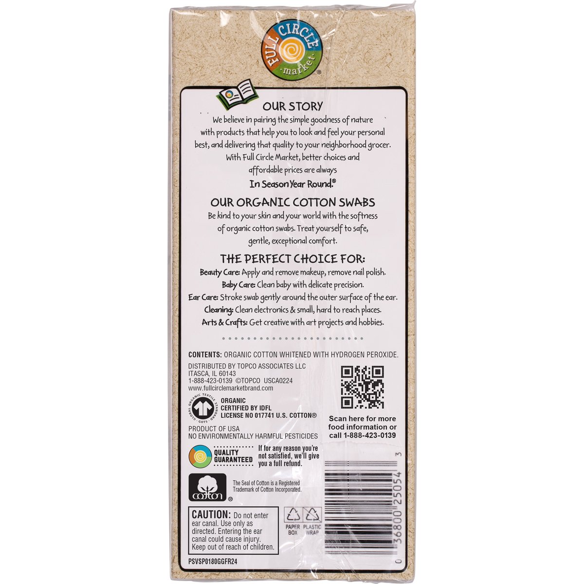 Double-tipped swabs with paper sticks. Soft, smooth & absorbant. In season year round. Chlorine free cotton. Our Story: We believe in pairing the simple goodness of nature with products that help you to look and feel your personal best, and delivering that quality to your neighborhood grocer. With Full Circle Market, better choices and affordable prices are always In Season Year Round. Our Organic Cotton Swabs: Be kind to your skin and your world with the softness of organic cotton swabs. Treat yourself to safe, gentle, exceptional comfort. Quality Guaranteed: If for any reason you're not satisfied, we'll give you a full refund. GOTS: Global Organic Textile Standard. Organic certified by IDFL. License No 017741 U.S. Cotton. www.fullcirclemarketbrand.com. Scan for more food information or call 1-888-423-0139. 1-888-423-0139. No environmentally harmful pesticides. Product of USA.
