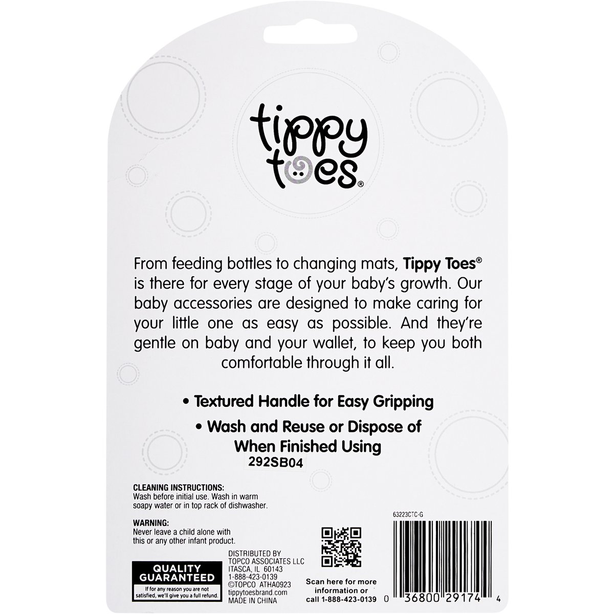 9+ months. 8 spoons. 8 forks. Perfect for travel. Reuse or throw away. From feeding bottles to changing mats, Tippy Toes is there for every stage of your baby's growth. Our baby accessories are designed to make caring for your little one as easy as possible. And they're gentle on baby and your wallet, to keep you both comfortable through it all. Textured handle for easy gripping. Quality Guaranteed: If for any reason you are not satisfied, we'll give you a full refund. tippytoesbrand.com. Scan for more information or call 1-888-423-0139. 1-888-423-0139. BPA free. Made in China.