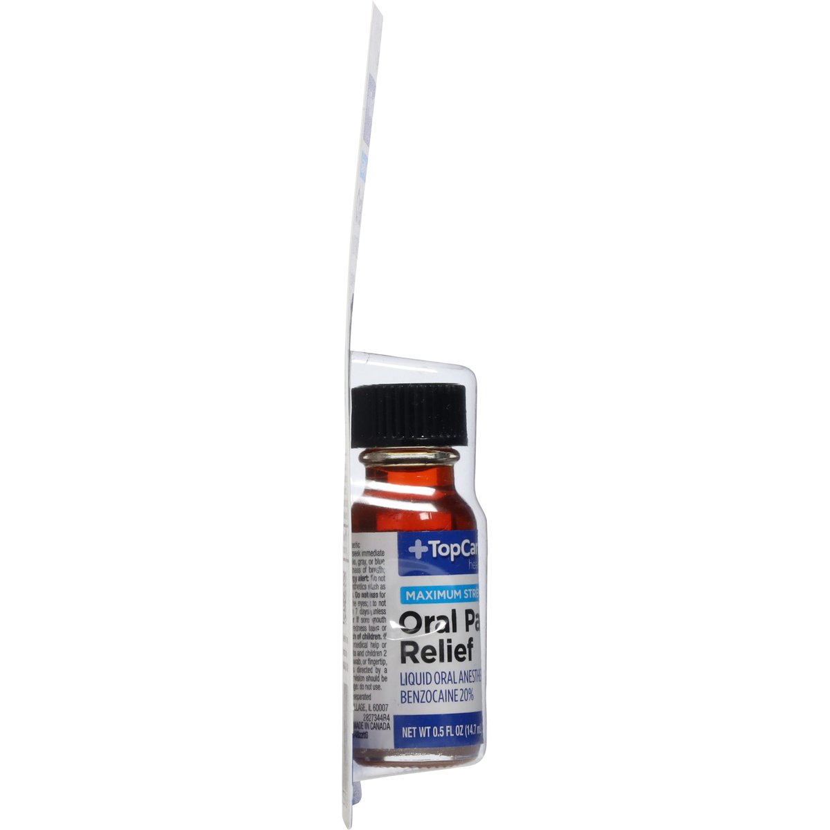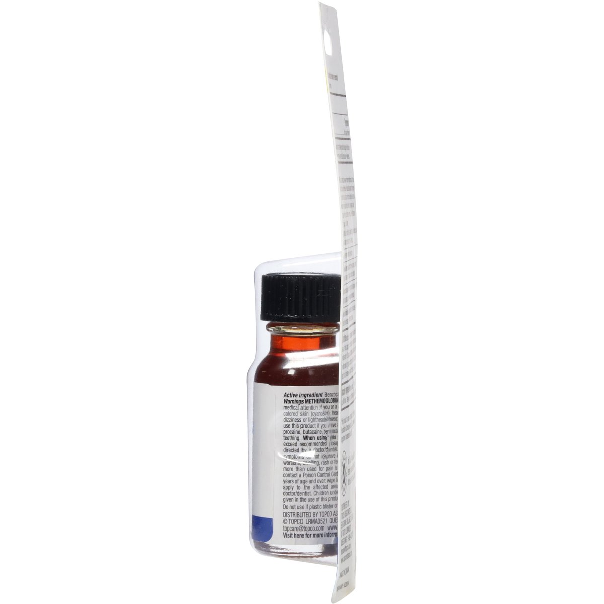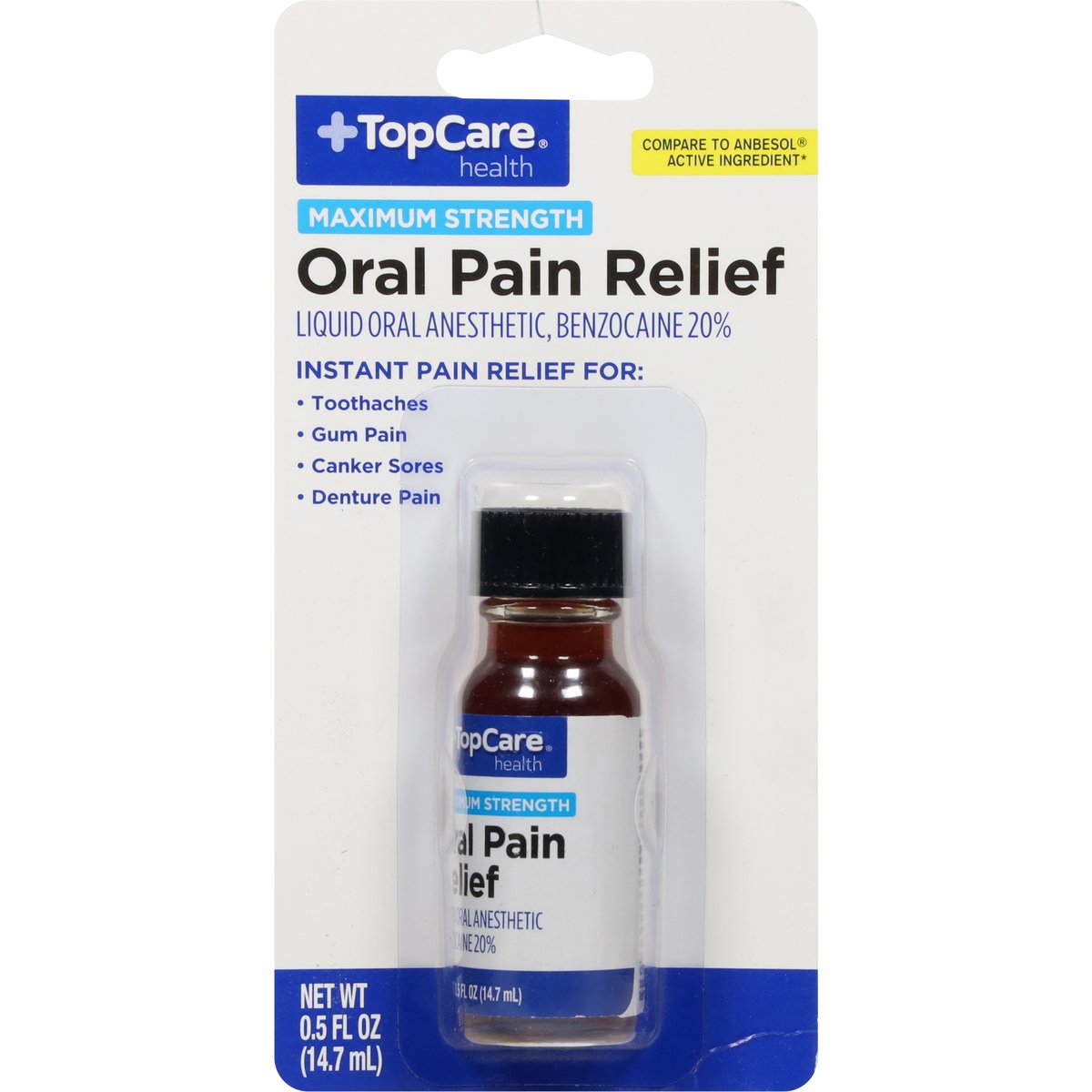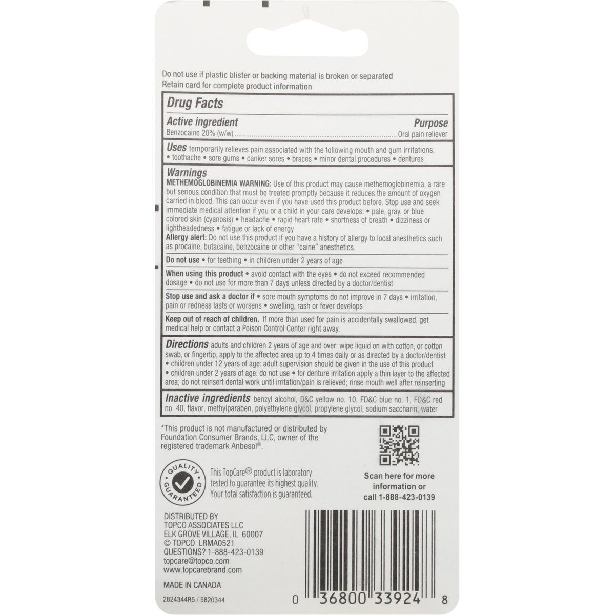 Liquid oral anesthetic, benzocaine 20%. Compare to Anbesol active ingredient (This product is not manufactured or distributed by Foundation Consumer Brands, LLC, owner of the registered trademark Anbesol). Instant Pain Relief for: Toothaches; gum pain; canker sores; denture pain. Quality Guaranteed: This TopCare product is laboratory tested to guarantee its highest quality. Your total satisfaction is guaranteed. www.topcarebrand.com. Scan for more information or call 1-888-423-0139. Questions? 1-888-423-0139. topcare(at)topco.com. www.topcarebrand.com. Made in Canada.