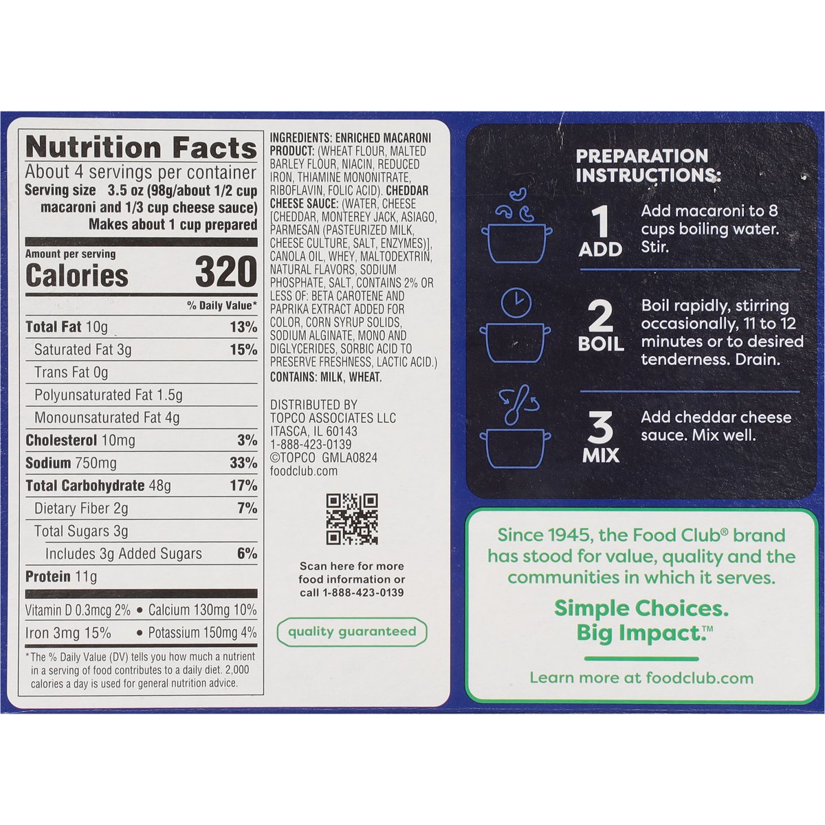 A blend of cheddar, Monterey Jack, Asiago & parmesan cheeses. No synthetic colors. Since 1945, the Food Club brand has stood for value, quality and the communities in which it serves. Simple Choices. Big Impact. Quality guaranteed. foodclub.com. Scan for more food information or call 1-888-423-0139. 1-888-423-0139. Learn more at foodclub.com.